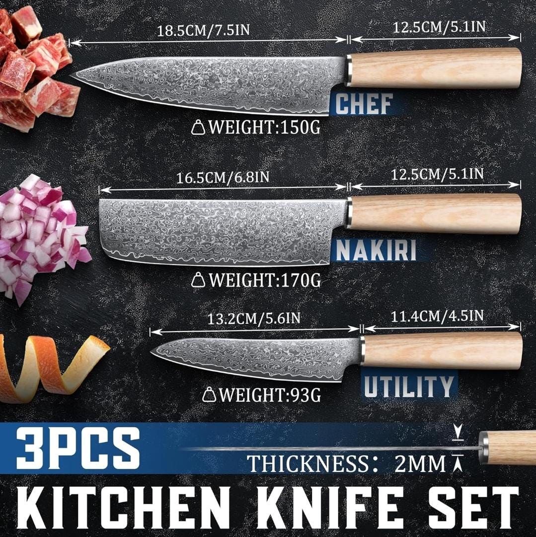 3 Pcs Set Chef Knife Nakiri Paring Damascus Kitchen Olive Wood Handle Culinary Personalized Utility Professional Knives Premium Quality KL11