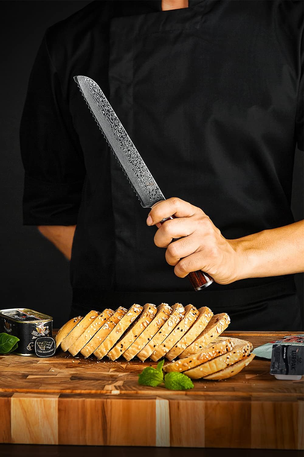 8" Serrated Bread Knife Engraved Damascus Pakka Wood Handle