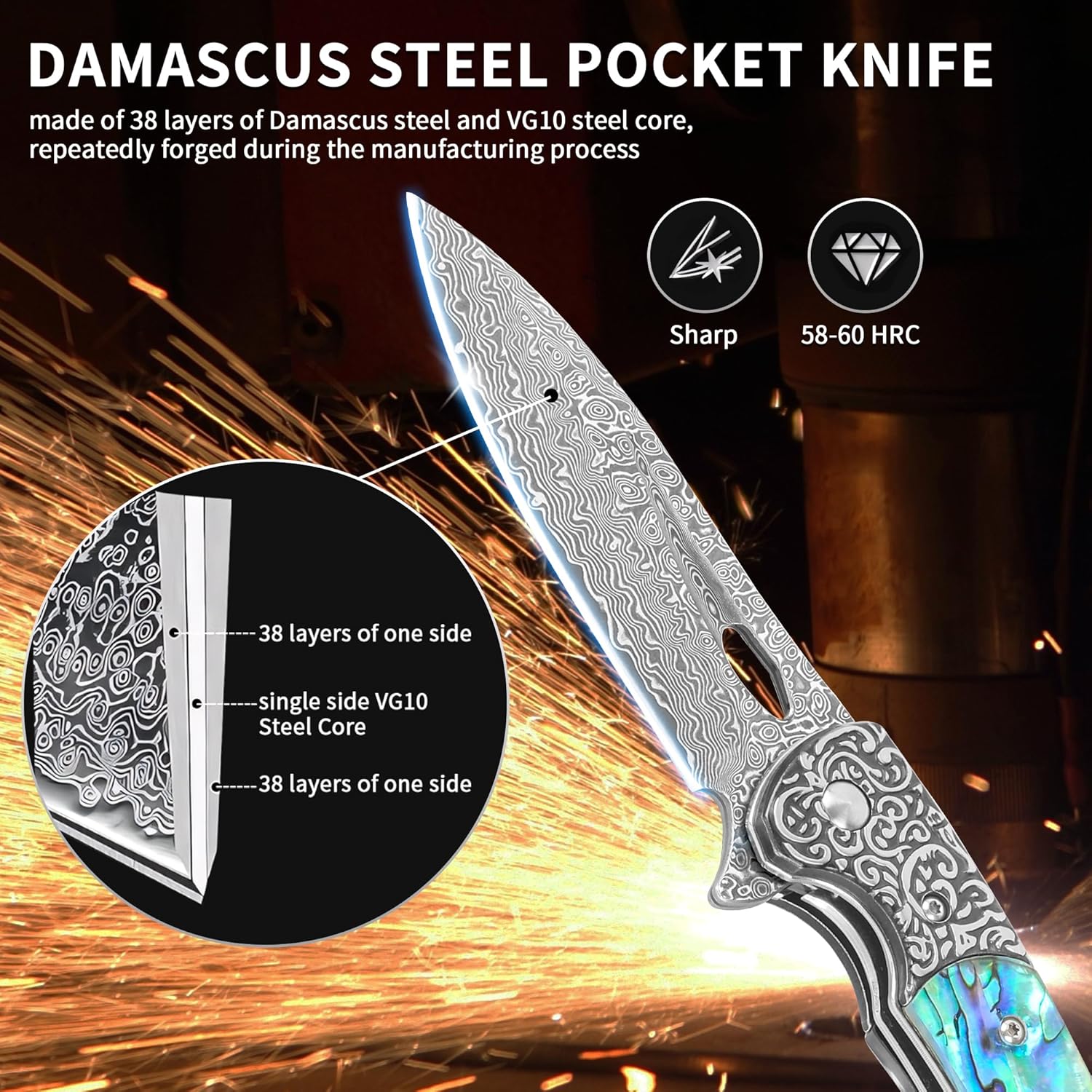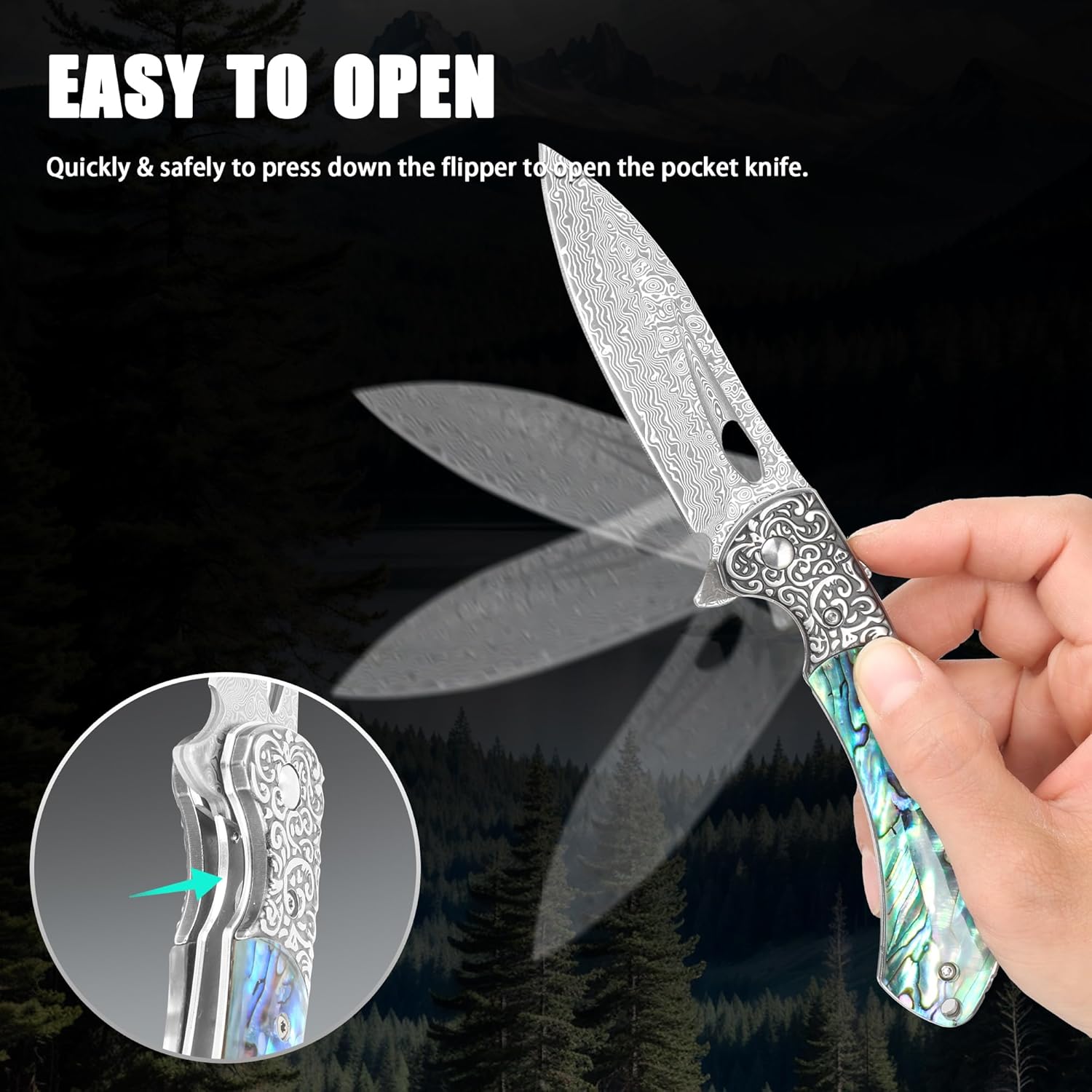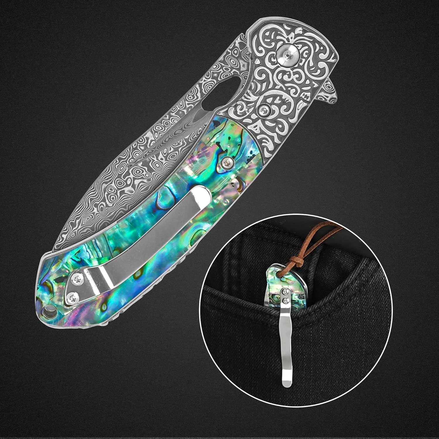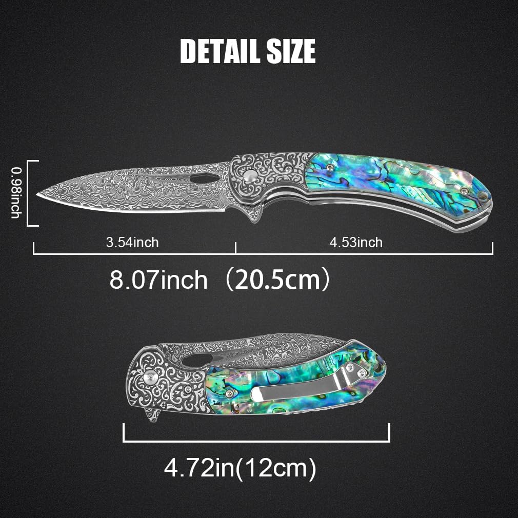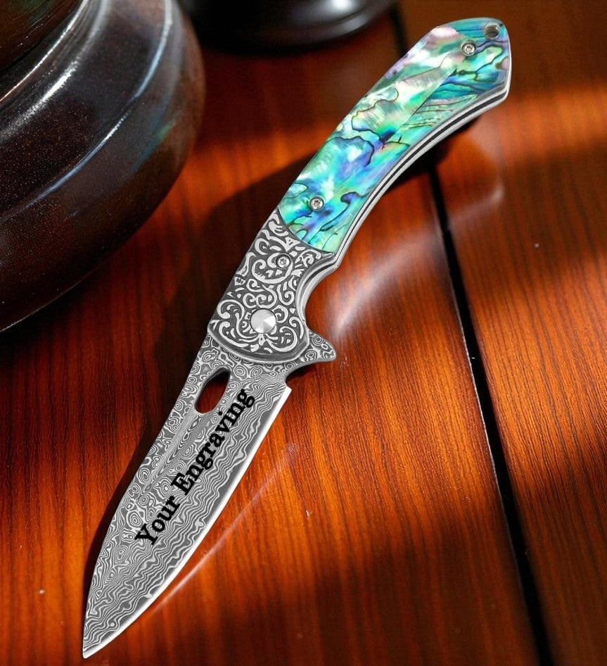 Abalone 3.54" Damascus Blade Folding Knife