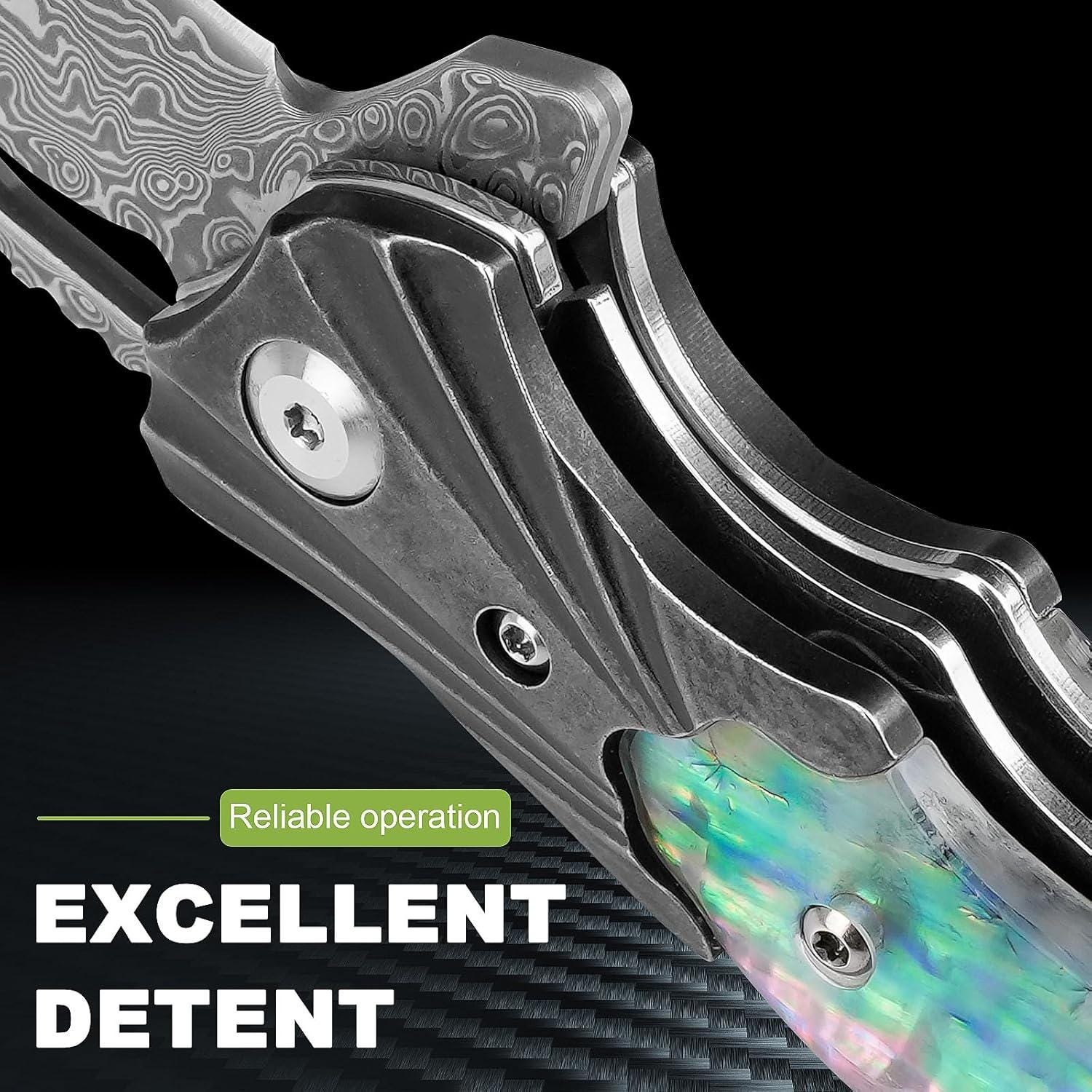 Engraved Damascus Pocket Knife - Abalone Sea Shell Handle Folding Knife