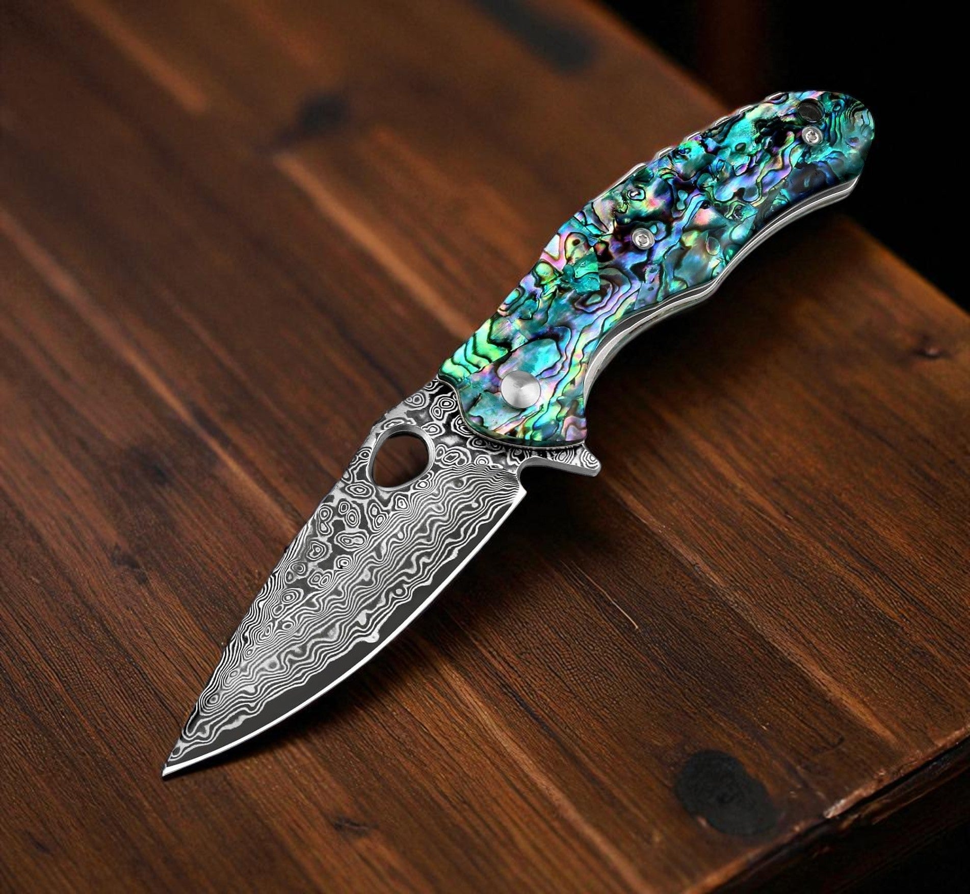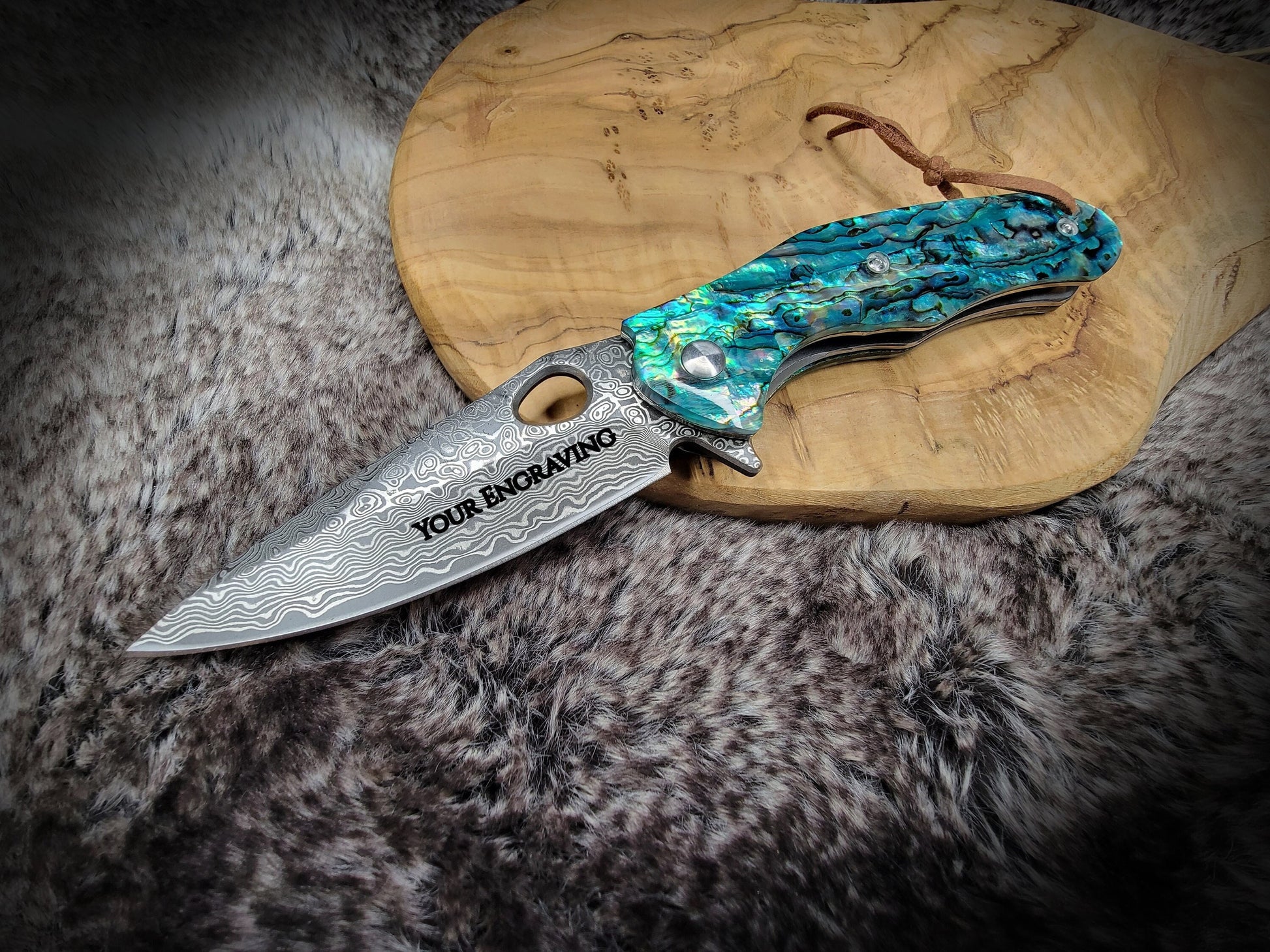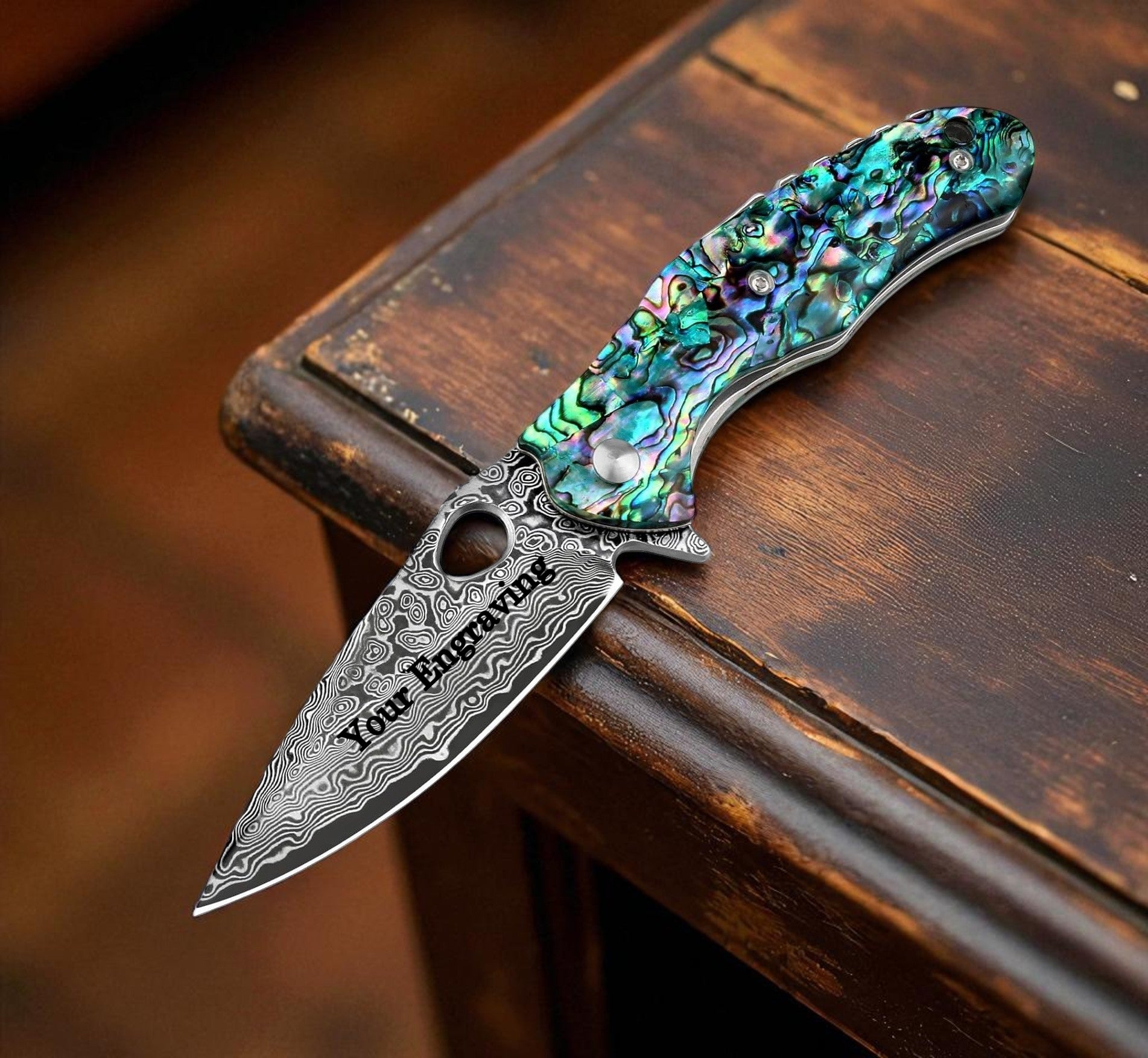 Engraved Damascus Pocket Knife - EDC Folding Knife with Exquisite Abalone Handle