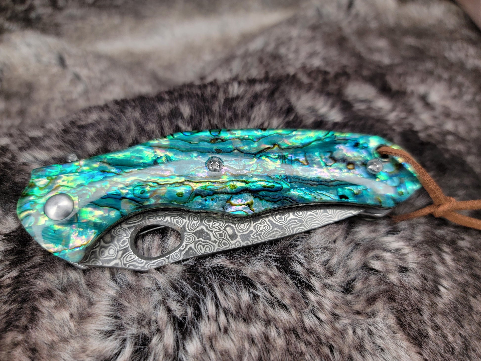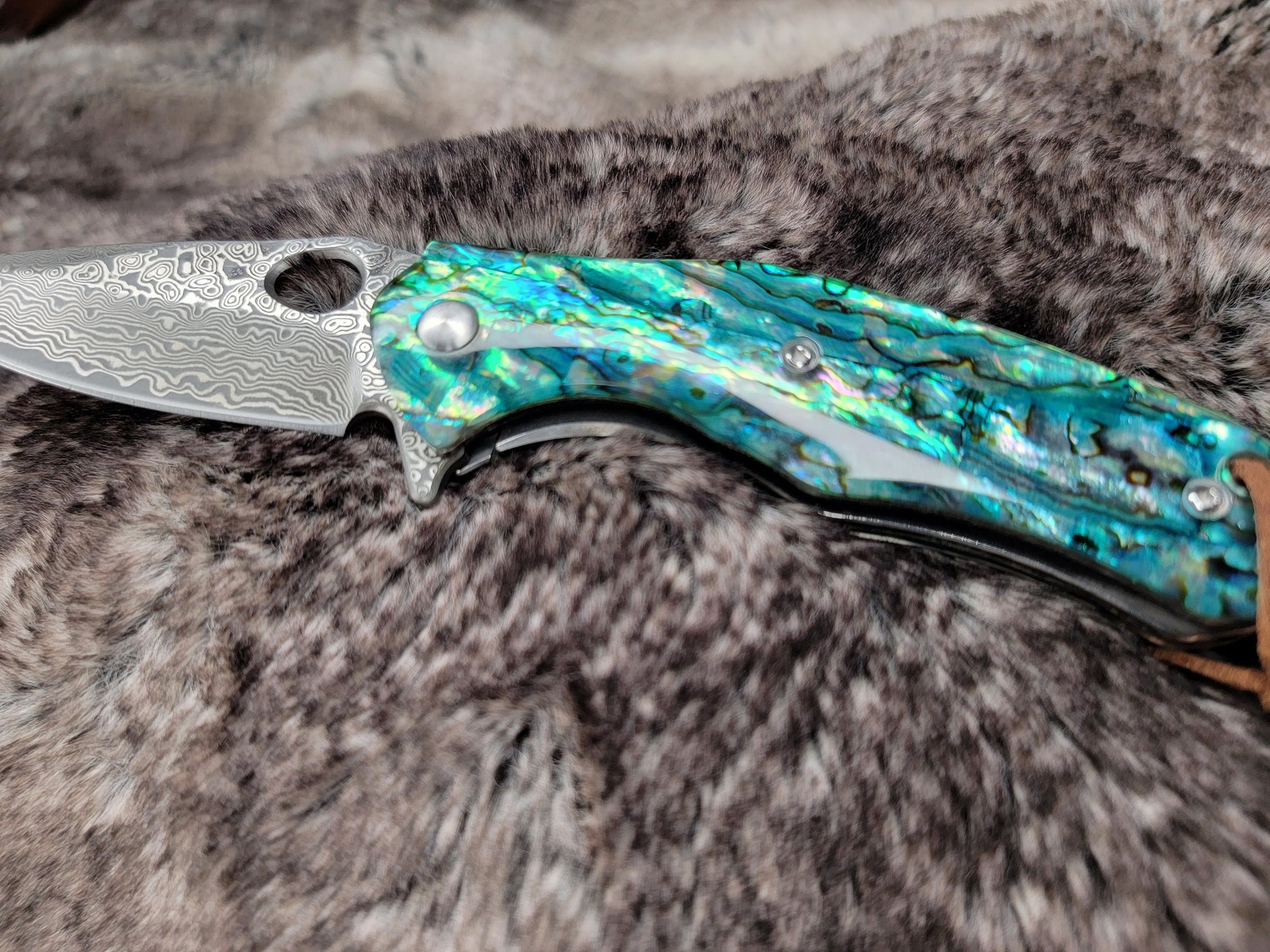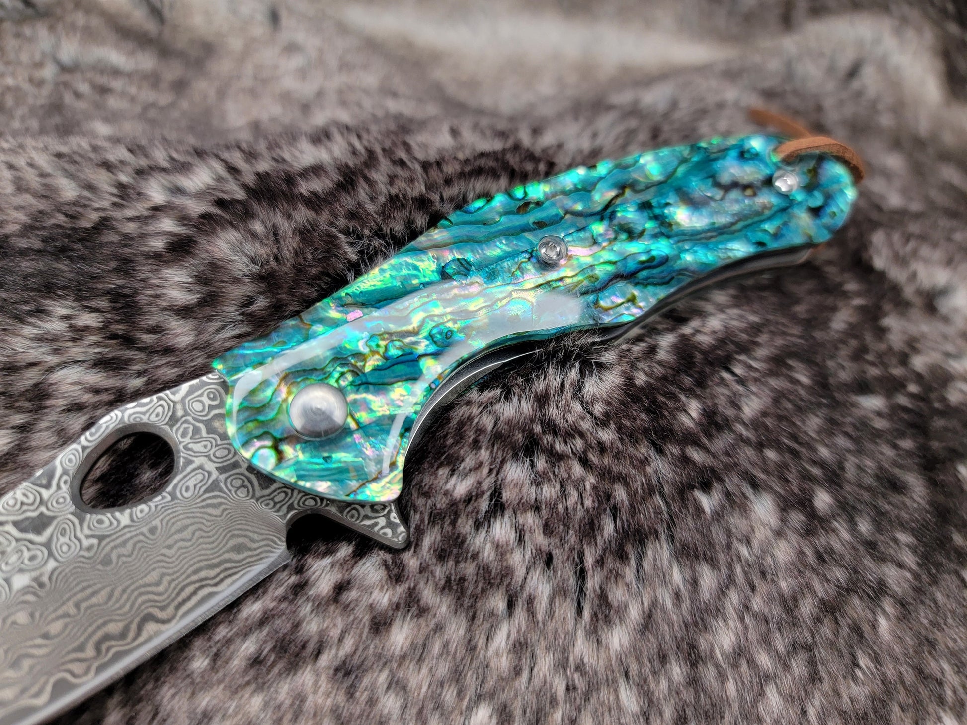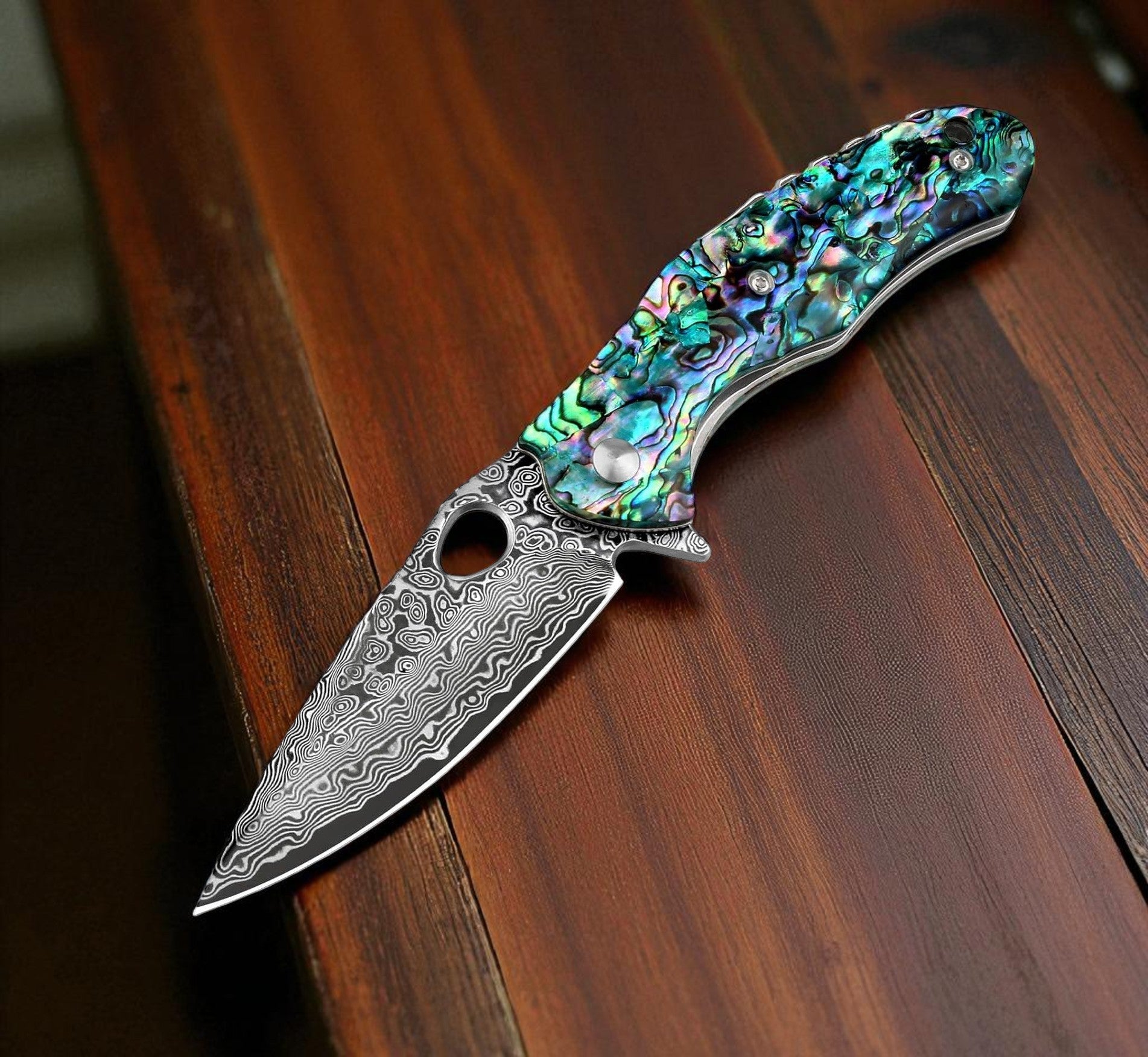 Engraved Damascus Pocket Knife - EDC Folding Knife with Exquisite Abalone Handle