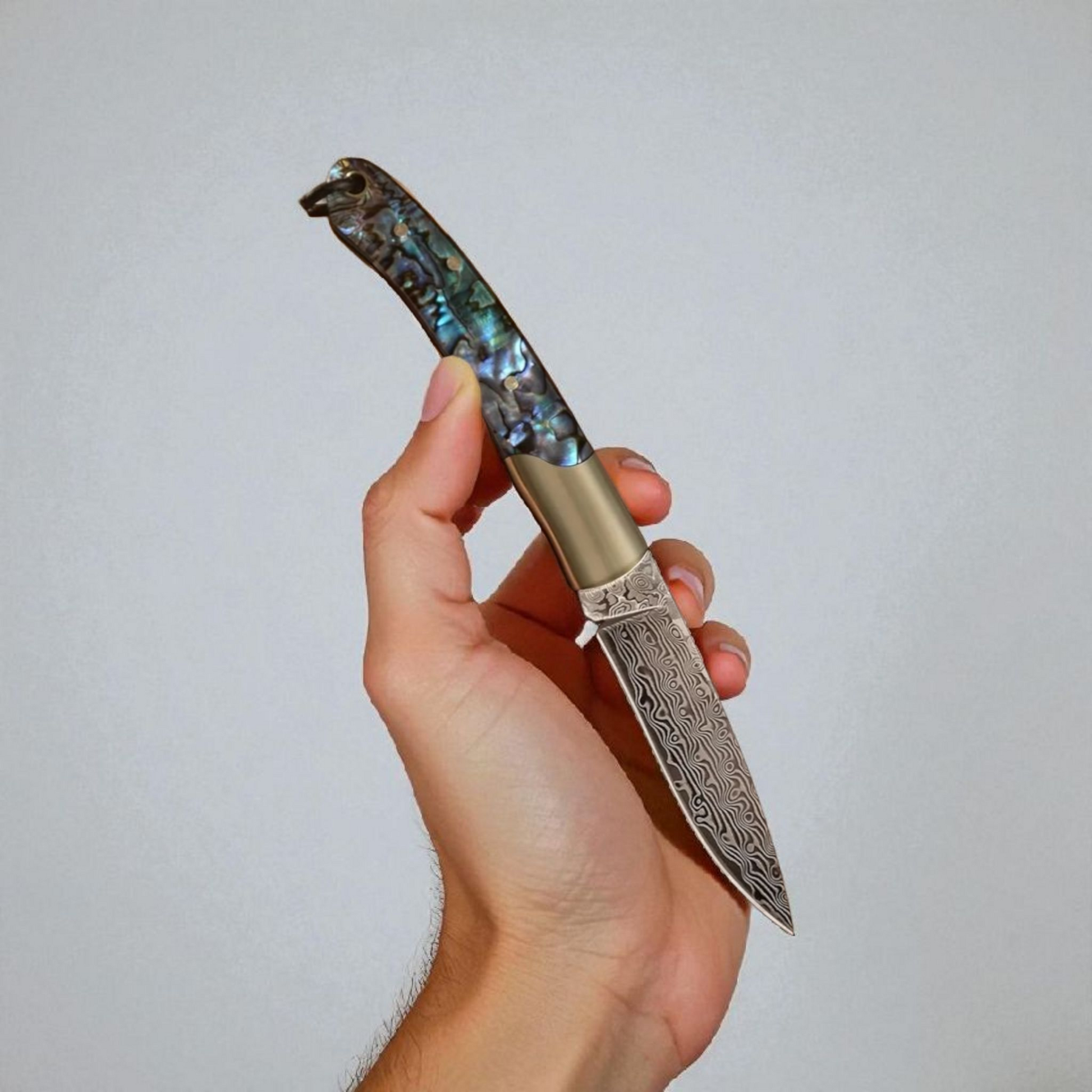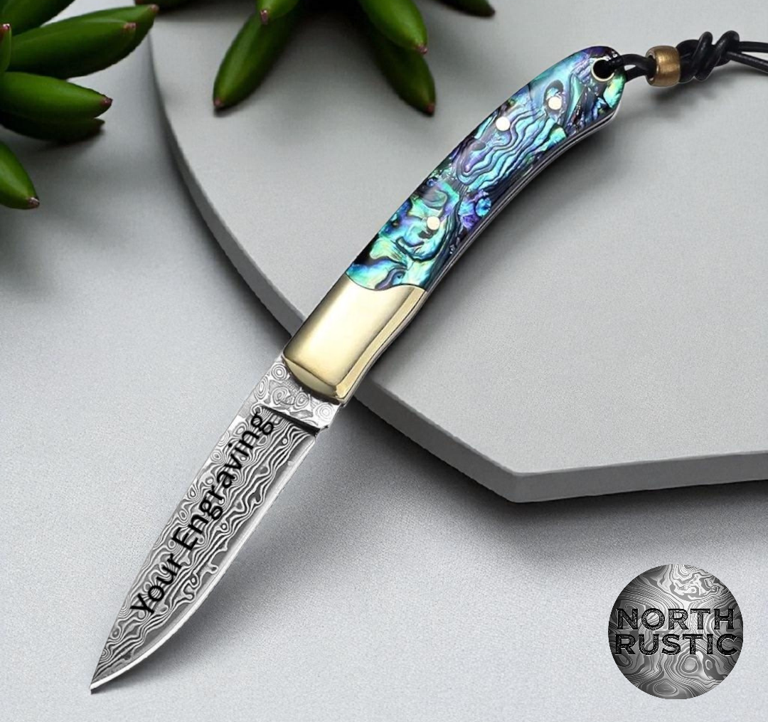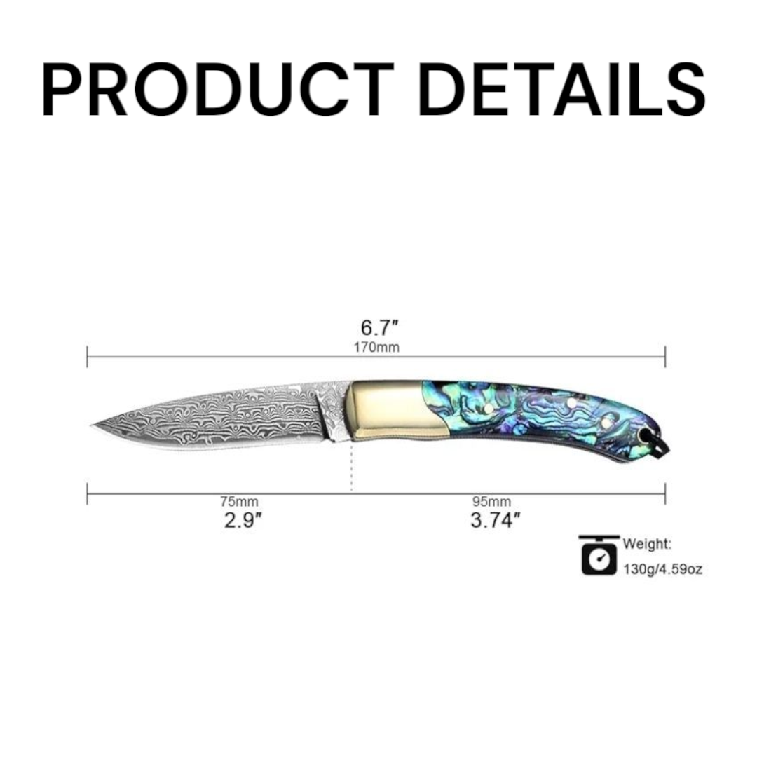 Where the ocean's iridescence meets the blacksmith's fire, you'll find a knife that's more than a tool—it's a masterpiece. Hold a true piece of art in your hand with our stunning Abalone & Damascus Steel Pocket Knife. Designed for the discerning individual who values both beauty and function, this knife is a statement of unparalleled craftsmanship and style.