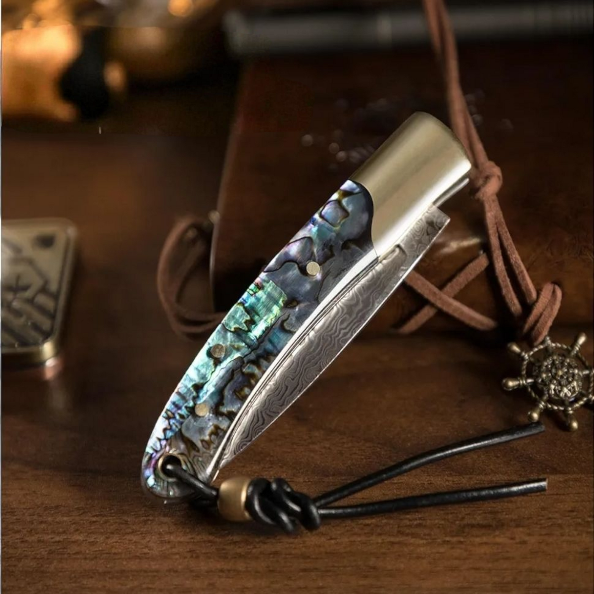 The handle is crafted from genuine Abalone shell, shimmering with deep blues, greens, and purples that dance in the light. Like a fingerprint, no two pieces of Abalone are ever the same, ensuring your knife is truly one-of-a-kind. This is paired with a blade forged from legendary Damascus steel, its distinctive wave-like patterns a testament to the layers of hardened steel that create a remarkably strong and sharp edge.
