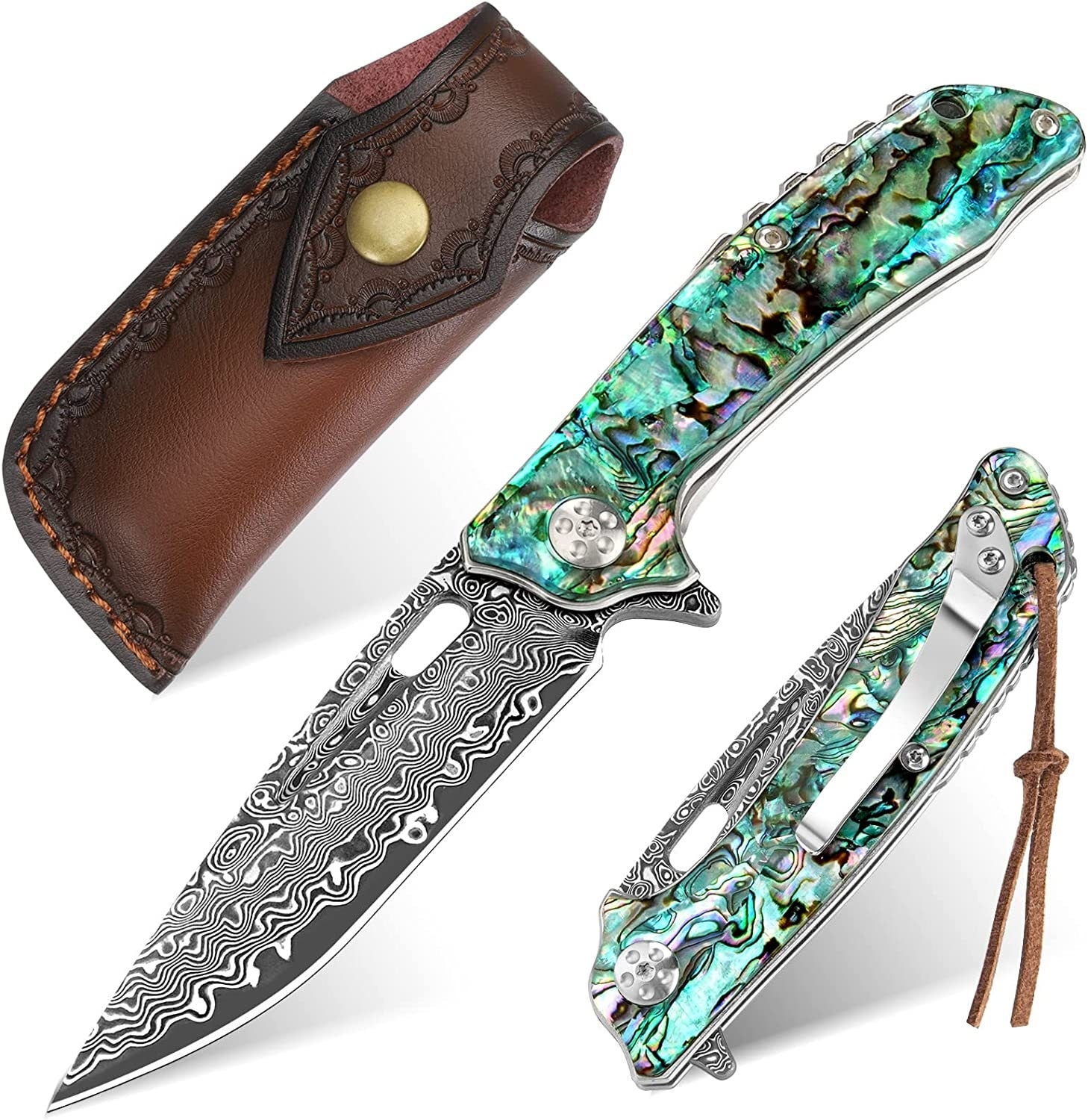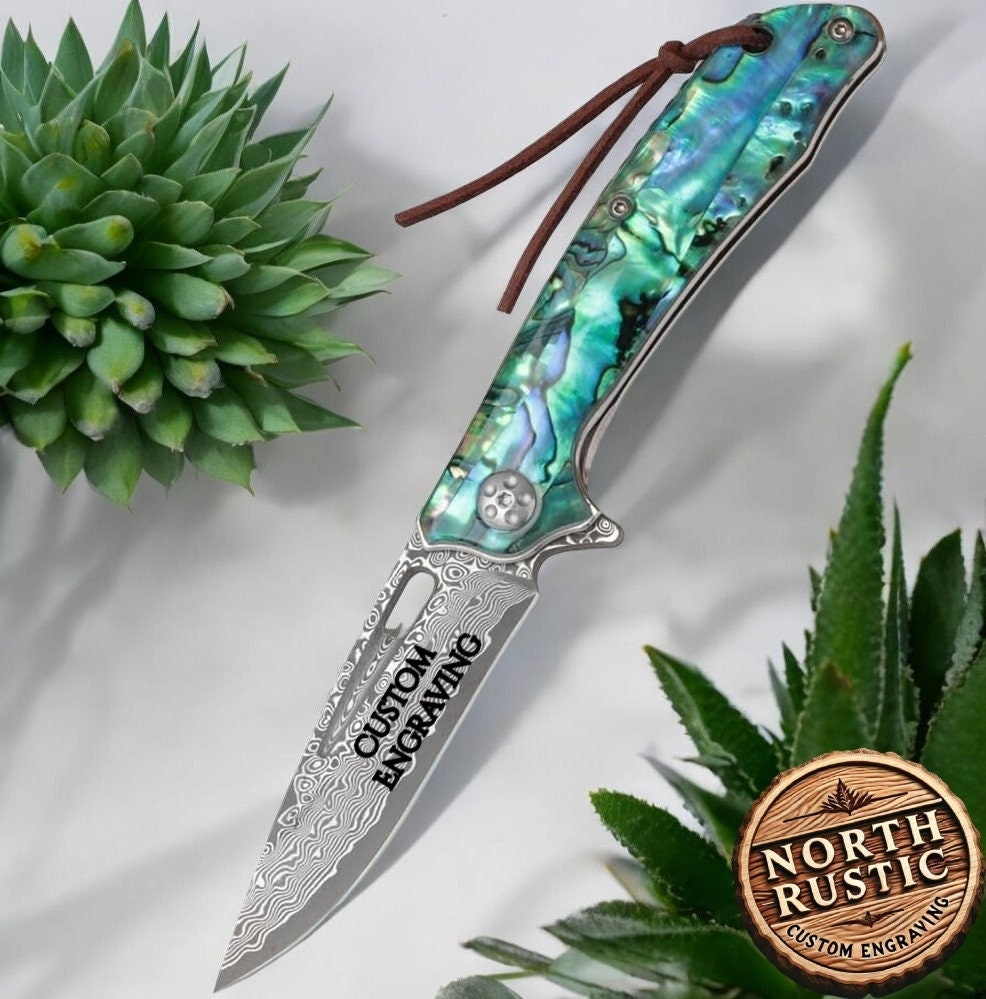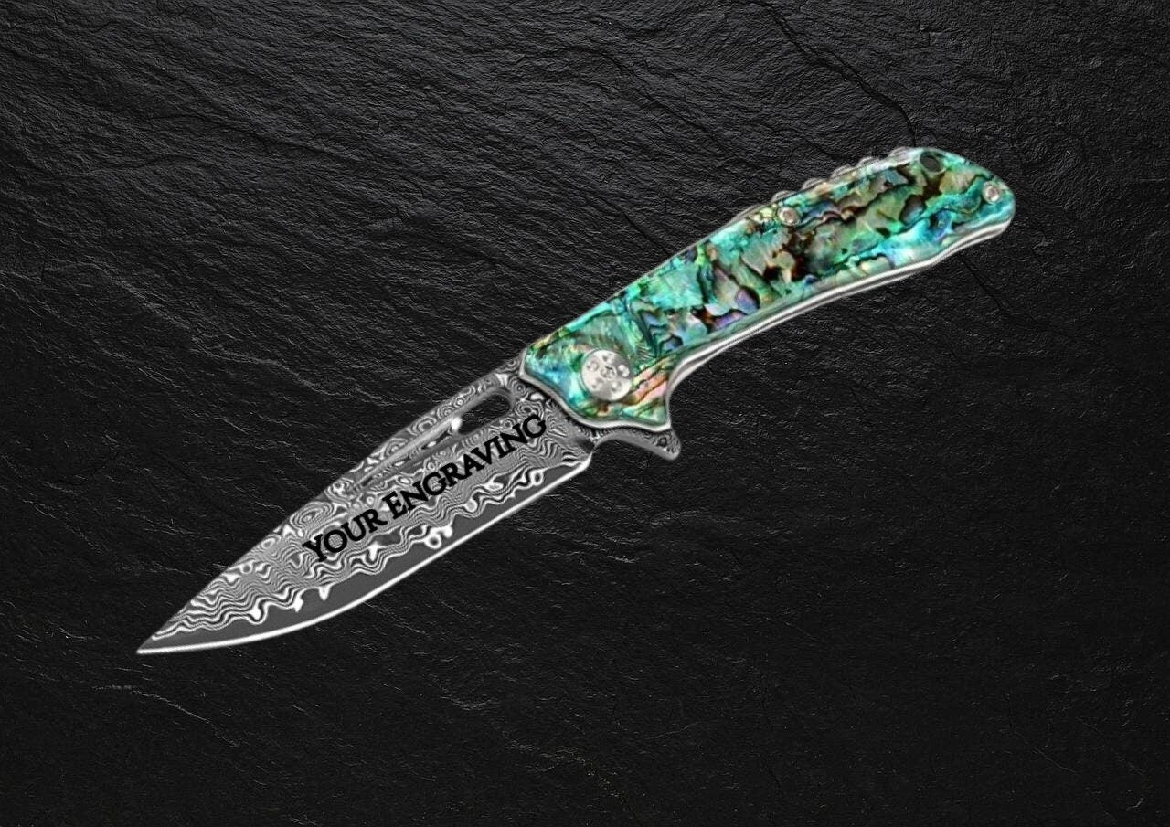Engraved Damascus Pocket Knife - EDC Folding Knife with Exquisite Abalone Handle