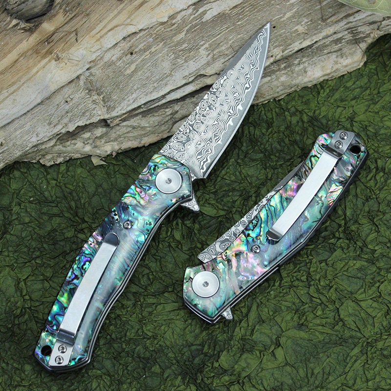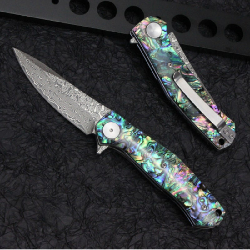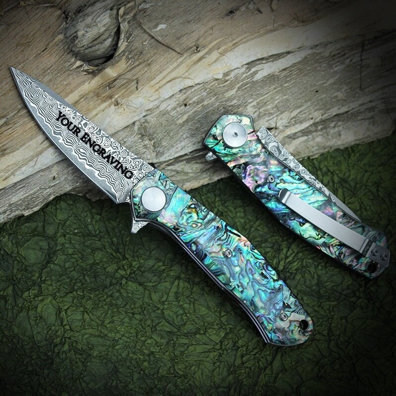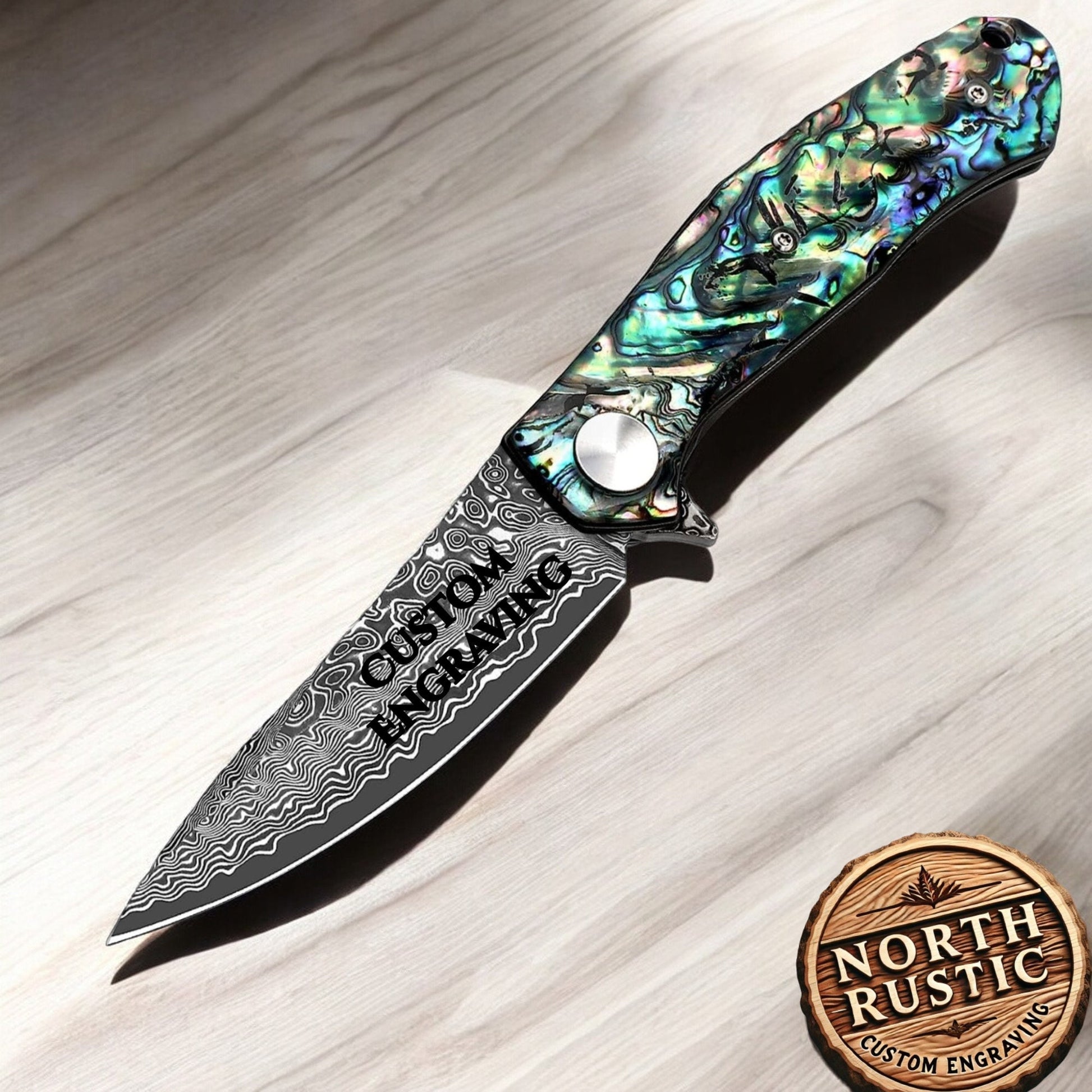 Engraved Damascus Pocket Knife - EDC Folding Knife with Exquisite Abalone Handle