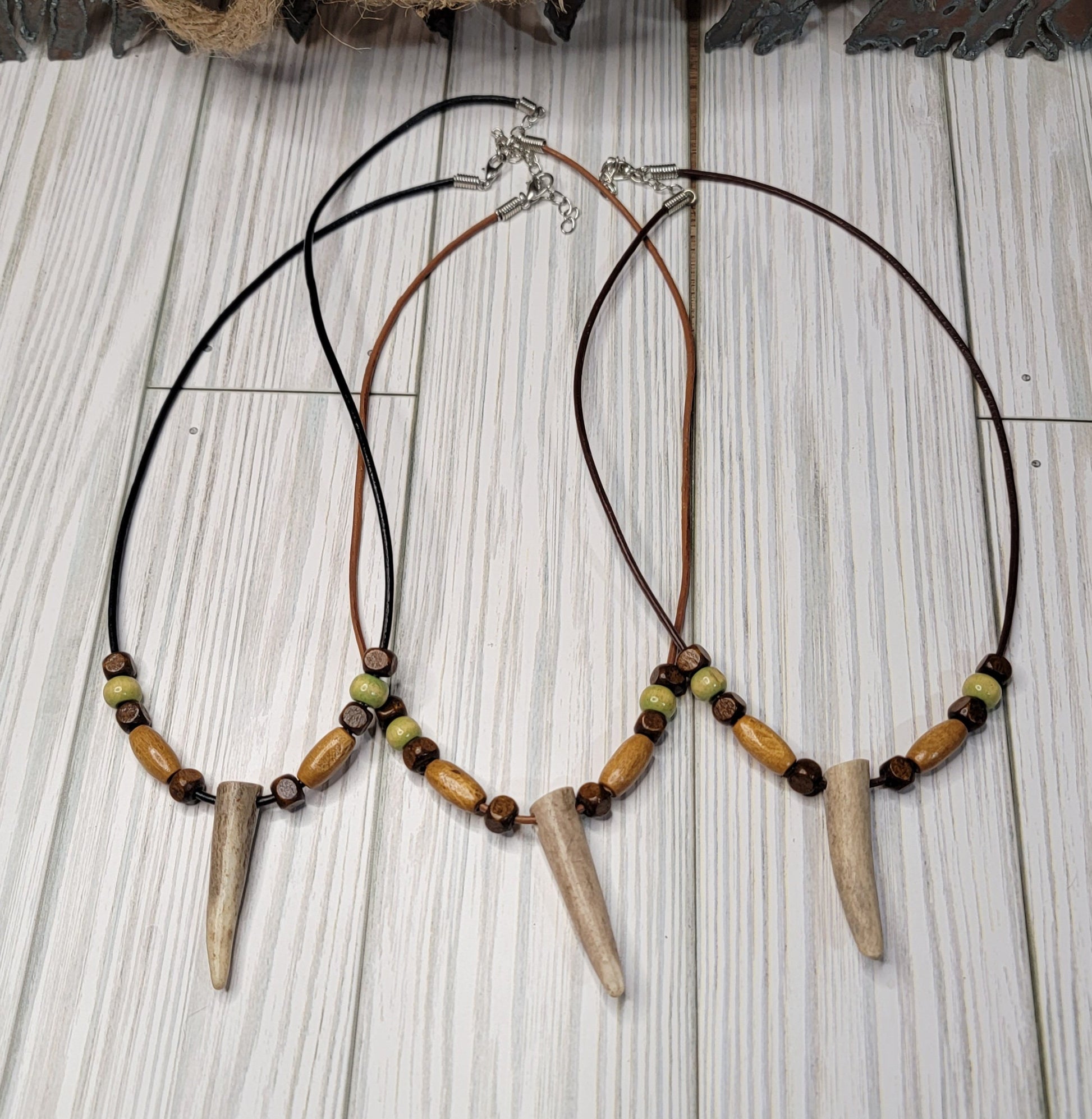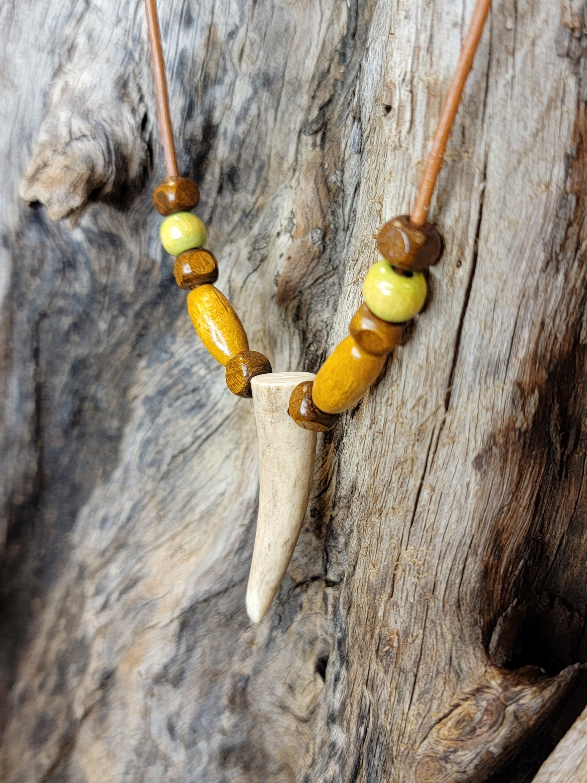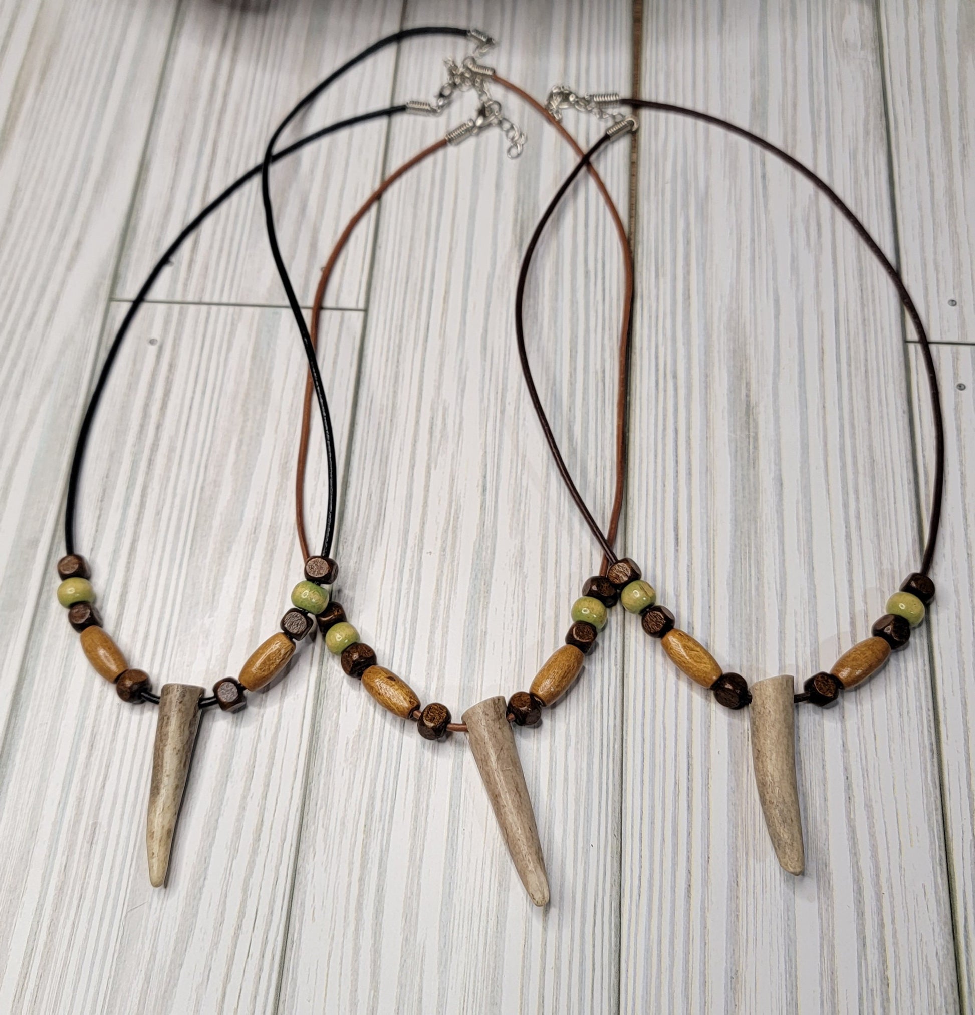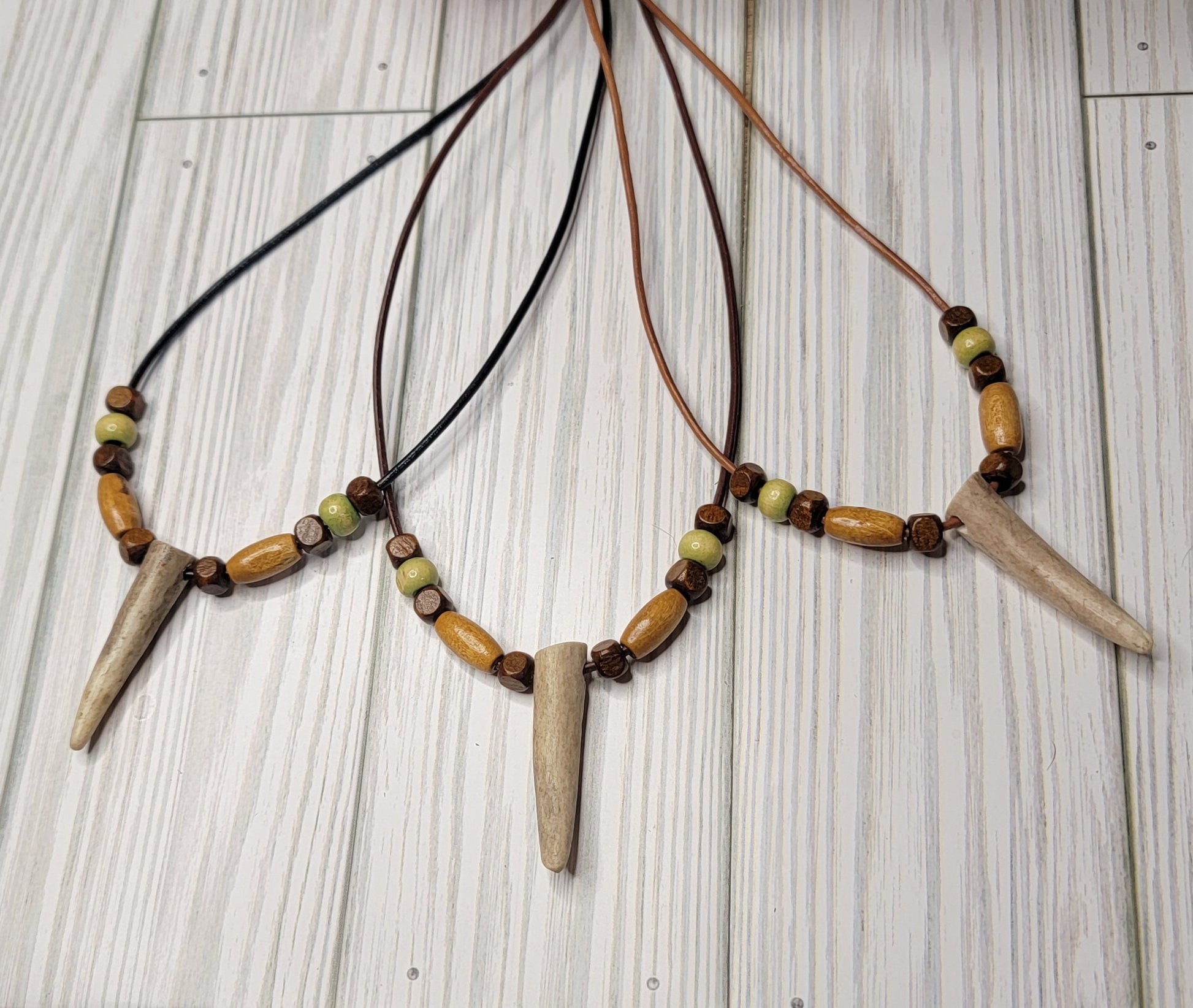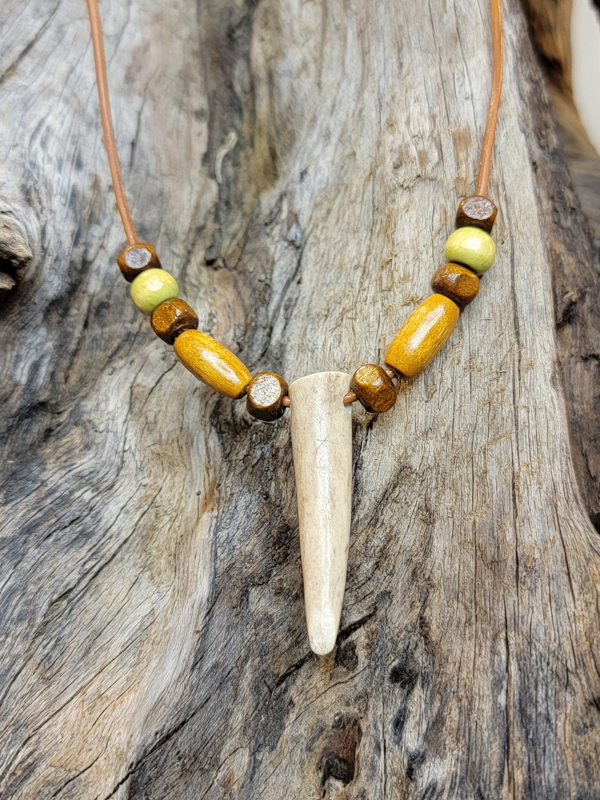 Stunning rustic style Deer Antler Tine Necklace. This leather necklace is adorned with beautiful brown & green wood beads. These are real deer antler tines, wonderful for those who enjoy rustic outdoor style jewelry. You will get one necklace with this listing, and it will vary slightly as these are real antlers. They will be the same size and shape as in the photos, with very minor differences. Very unique piece of rustic themed jewelry. Excellent gift for those who love hunting and/or the outdoors! The perfect piece for any occasion.