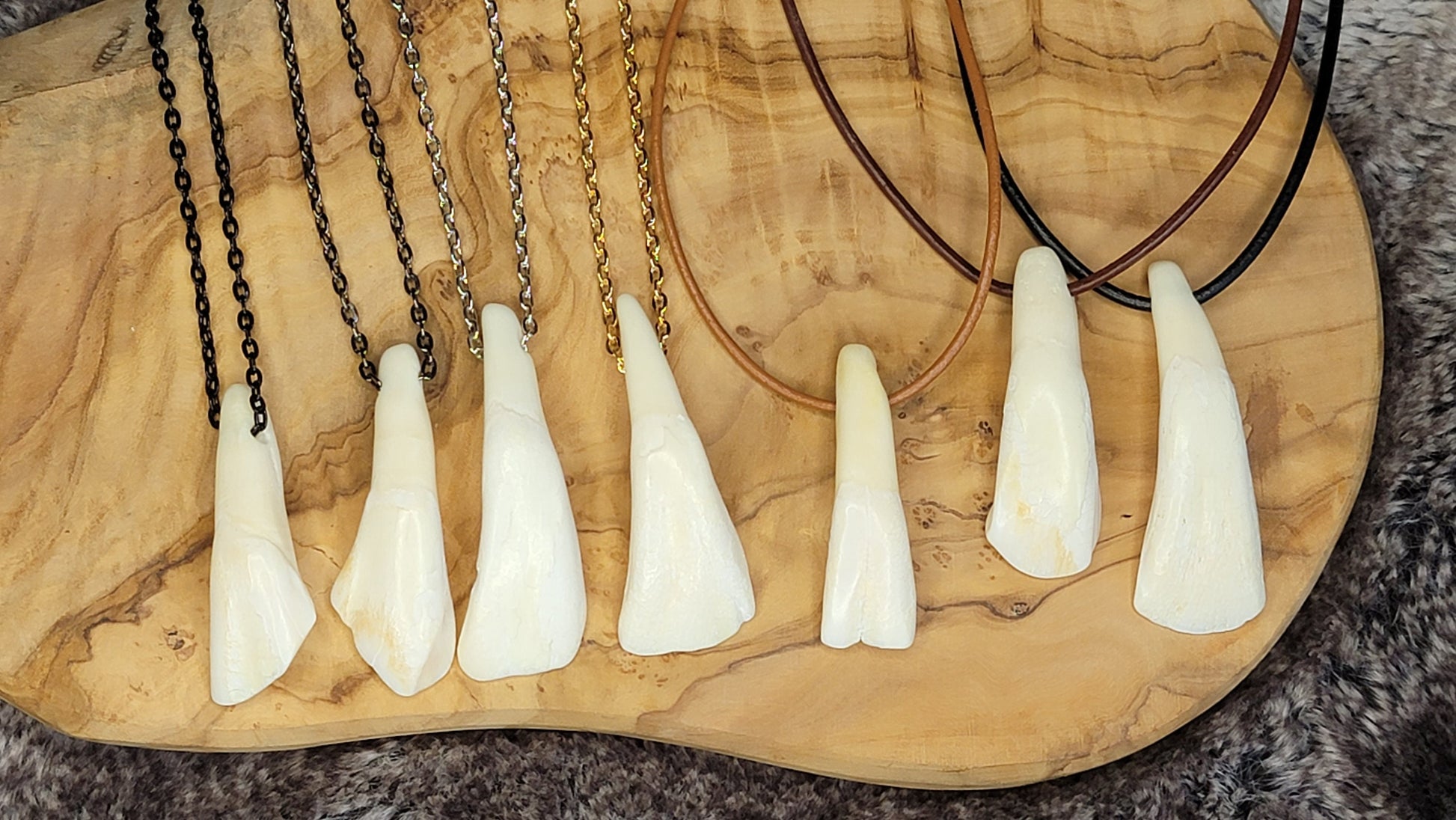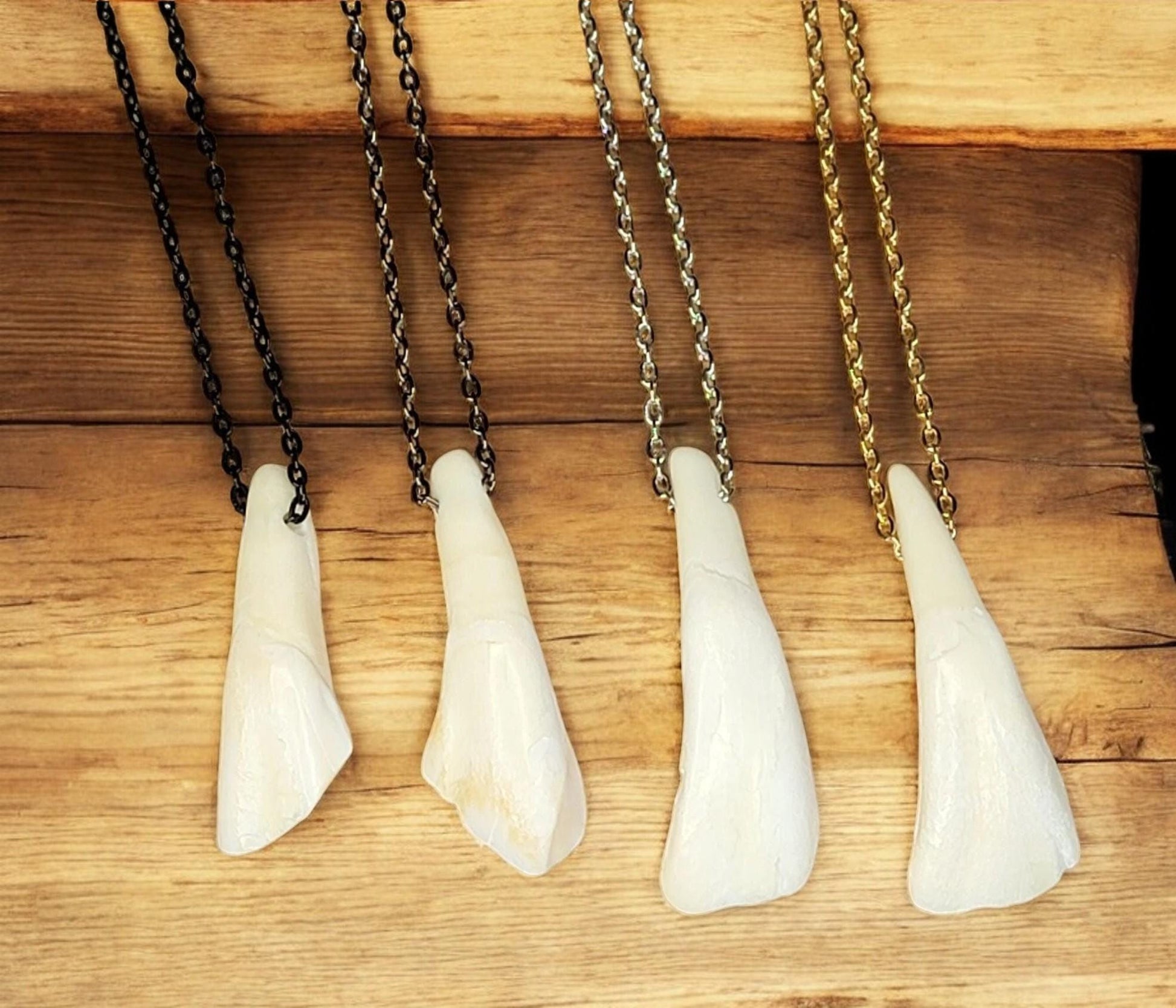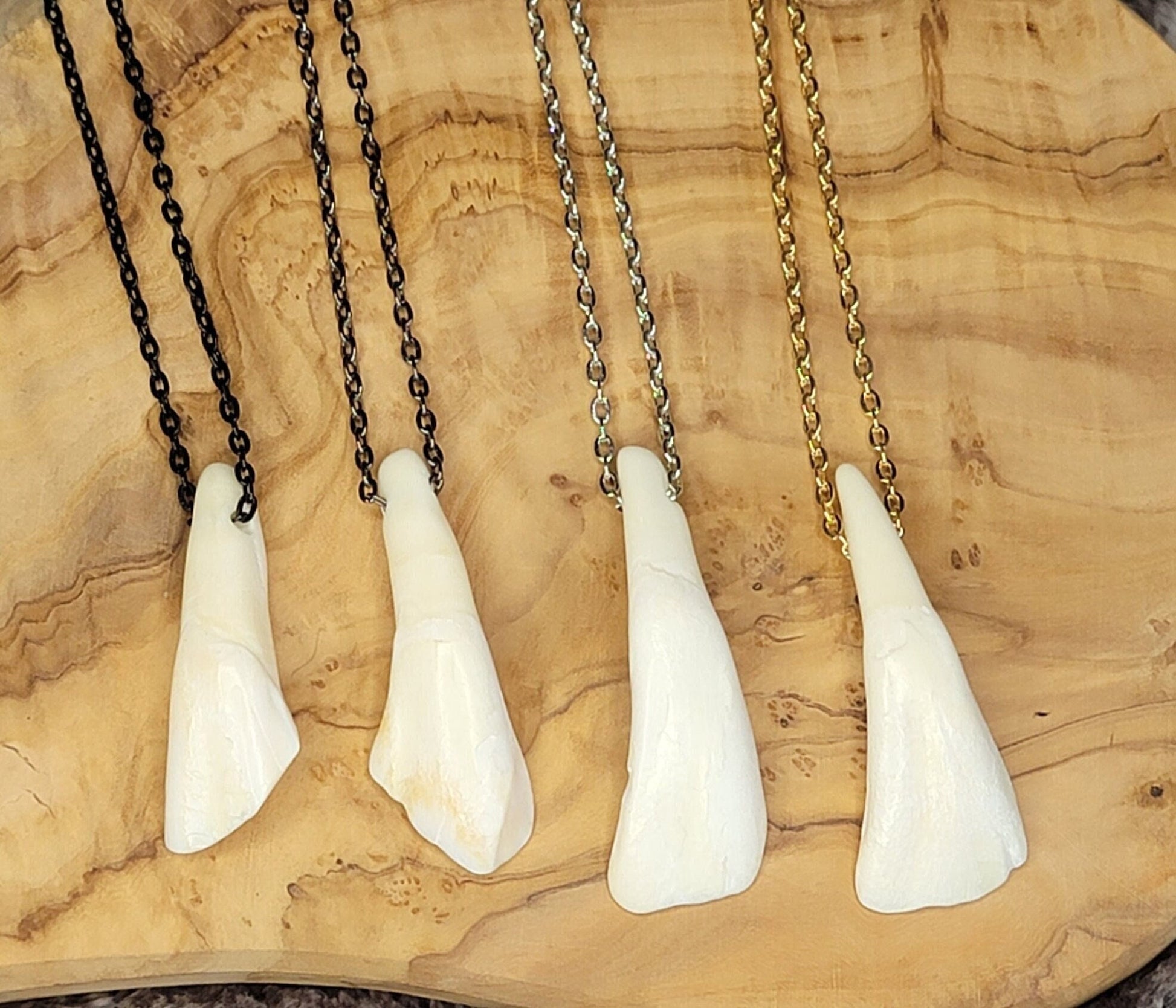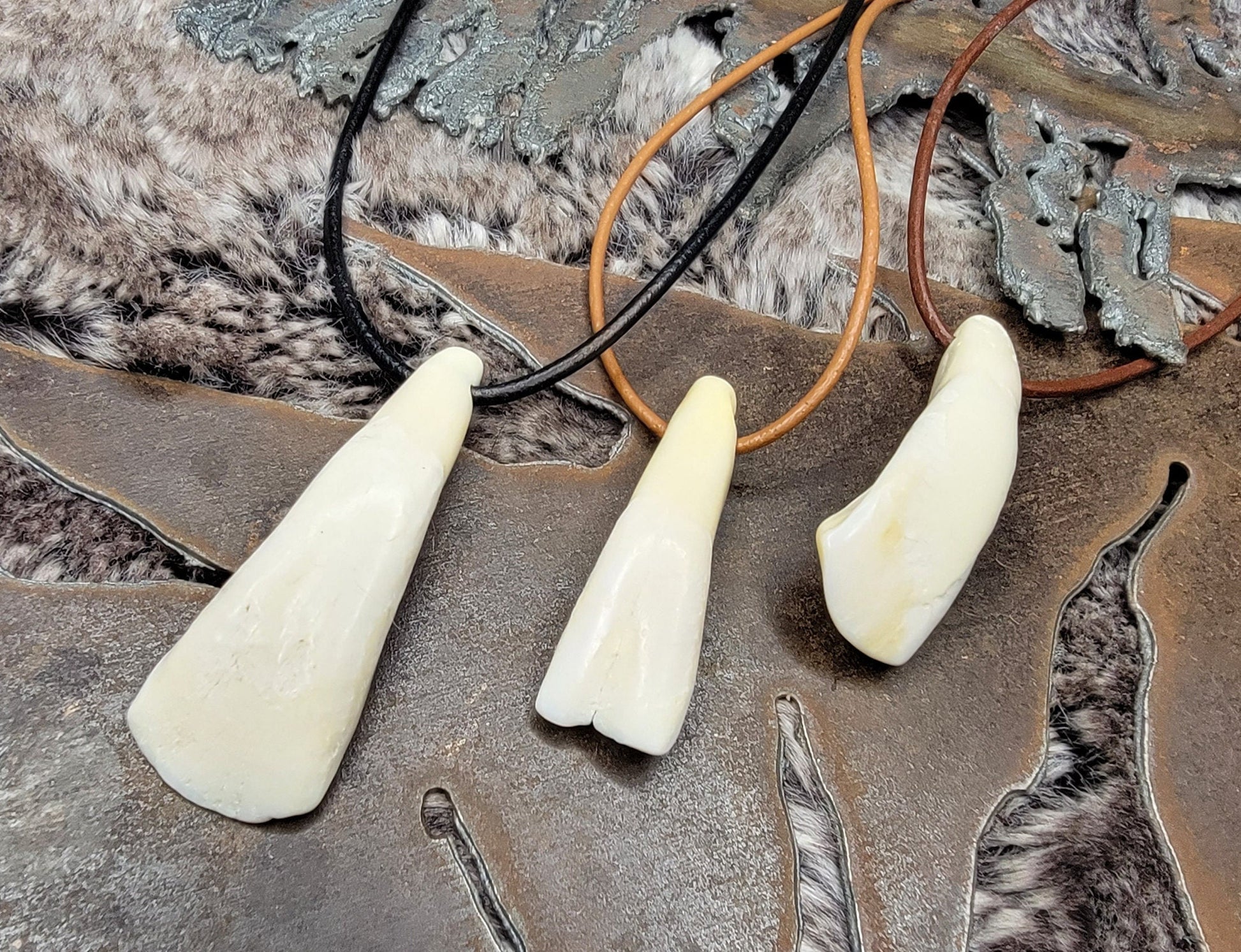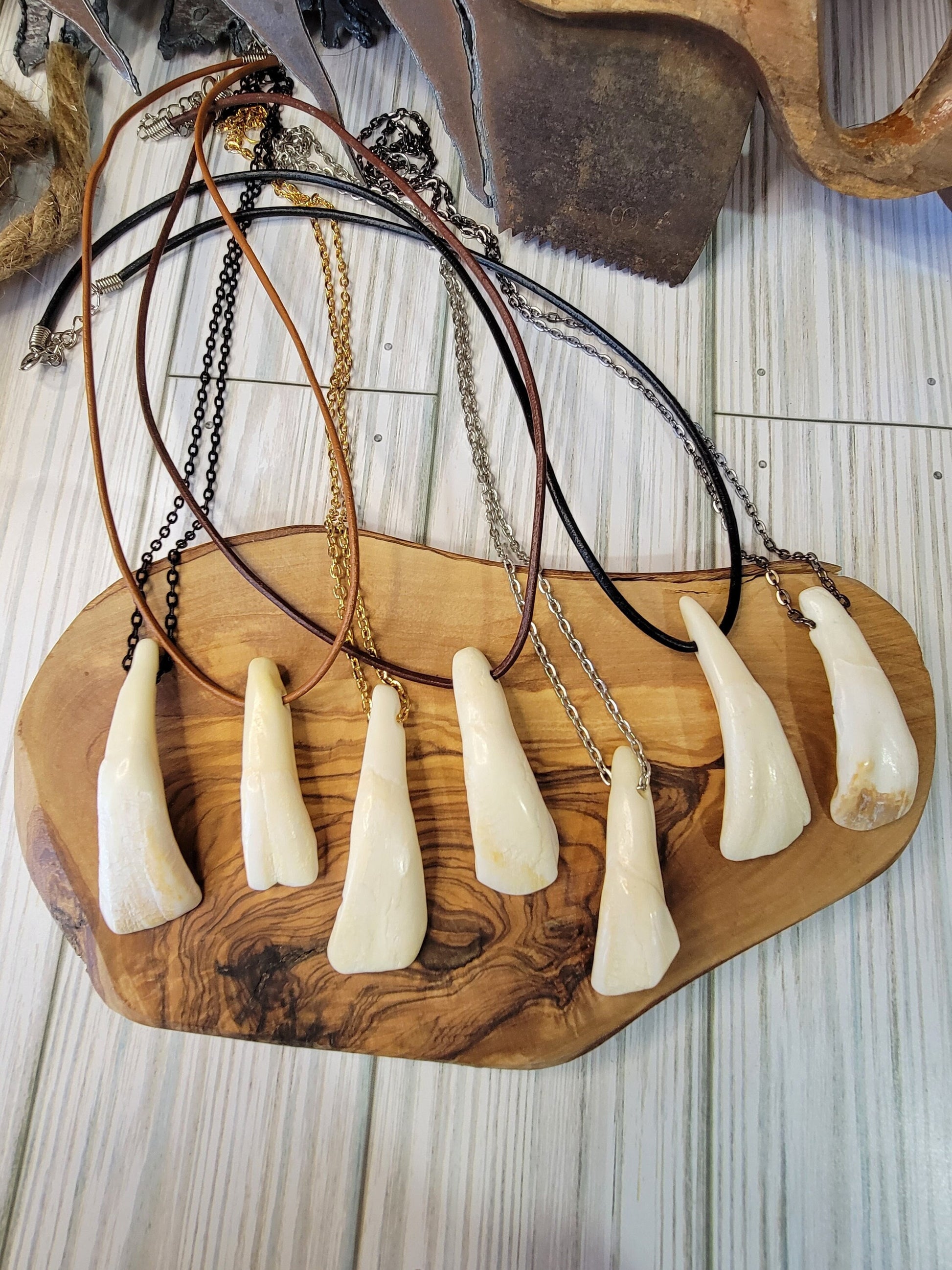Stunning rustic style Bison tooth Necklace. These are real teeth, wonderful for those who enjoy rustic outdoor style jewelry. You will get one necklace with this listing, and it will vary slightly as these are real teeth. They will be the same size and shape as in the photos, with very minor differences. These make some very unique gifts!