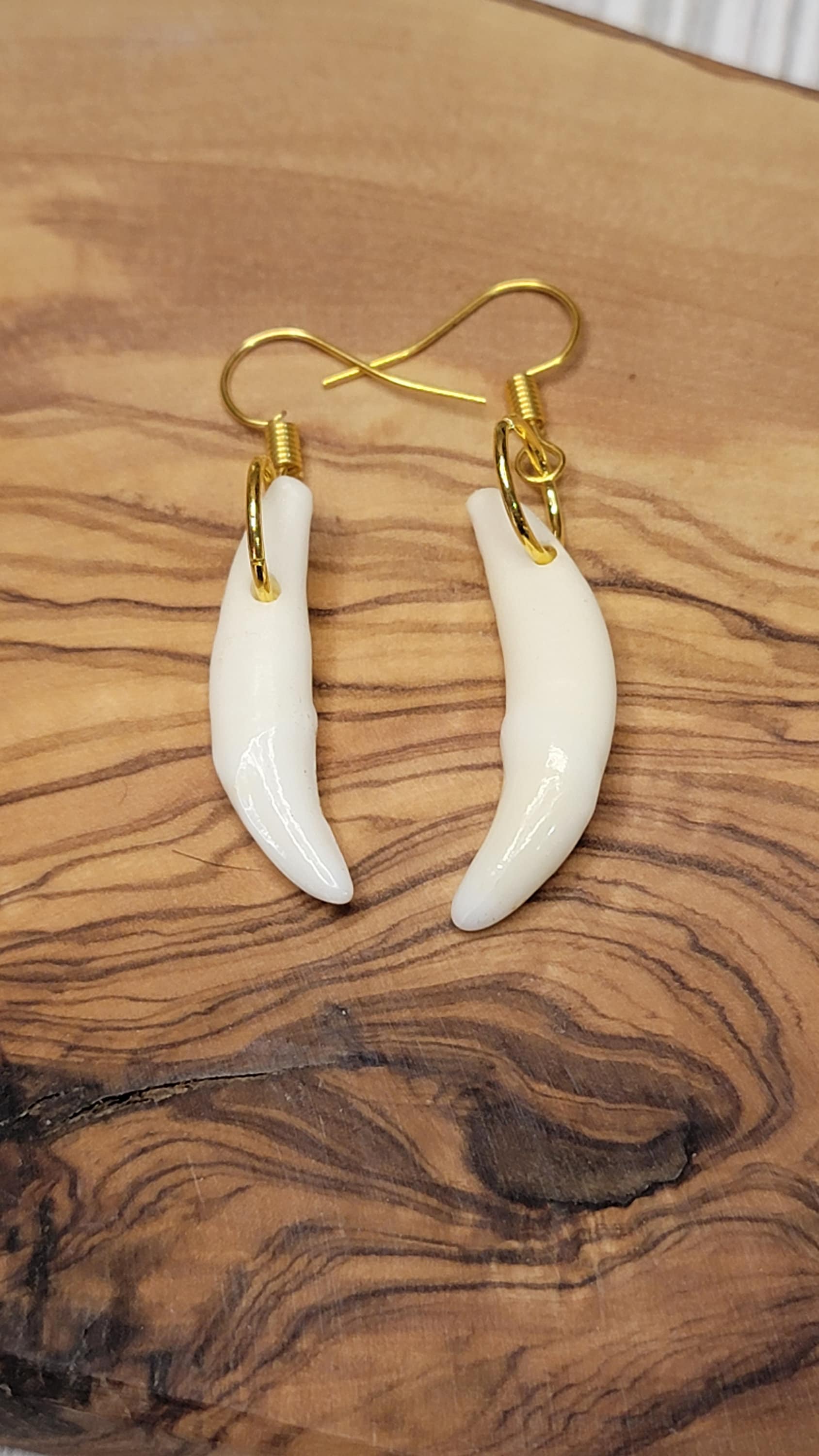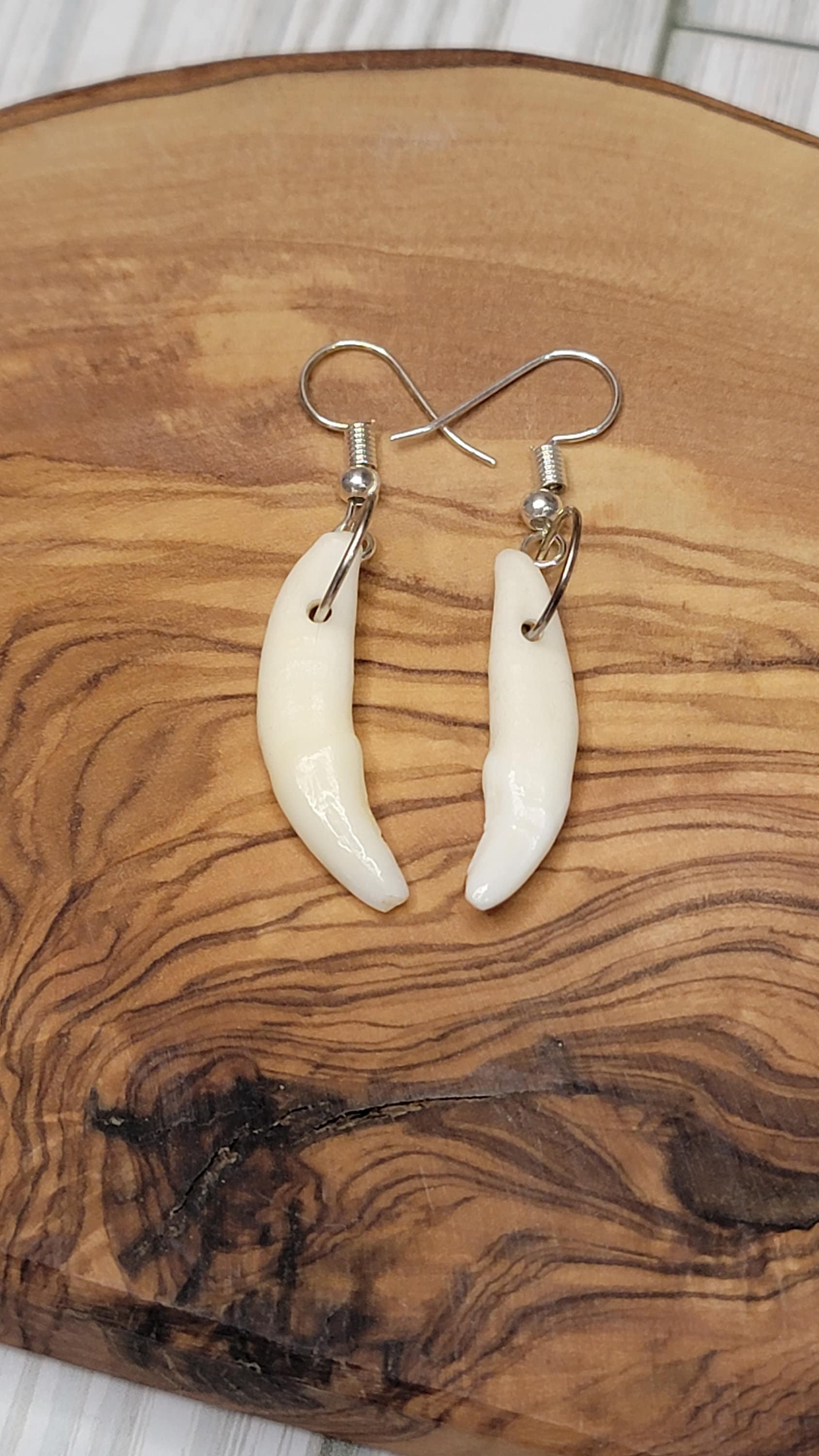 Stunning pair of coyote tooth earrings. These earring are small, elegant and professionally cleaned. These are real coyote canine fangs, wonderful pair of earrings for those who enjoy rustic outdoor style jewelry. You will get one pair of earrings with this listing, and it will vary slightly as these are real teeth. They will be the same size and shape photos, with very minor differences. These making some very unique gifts!