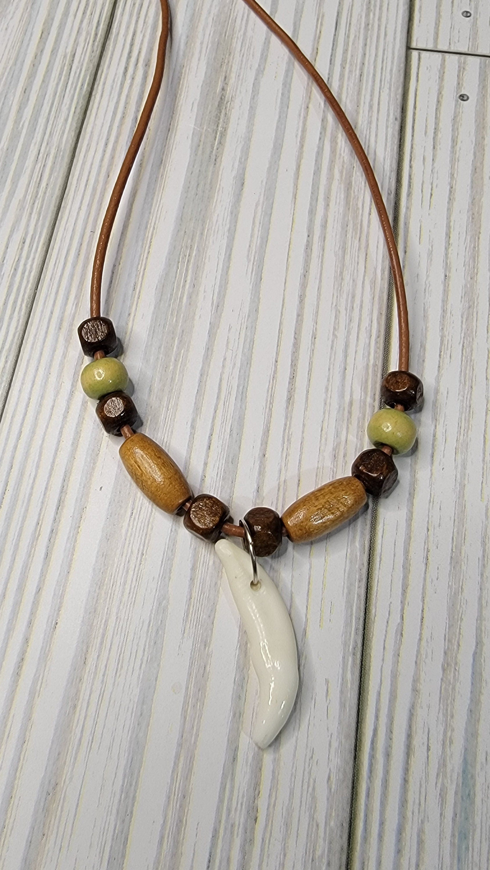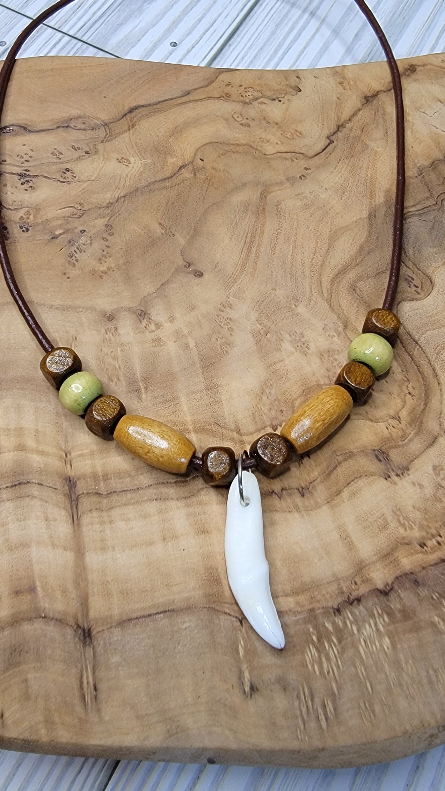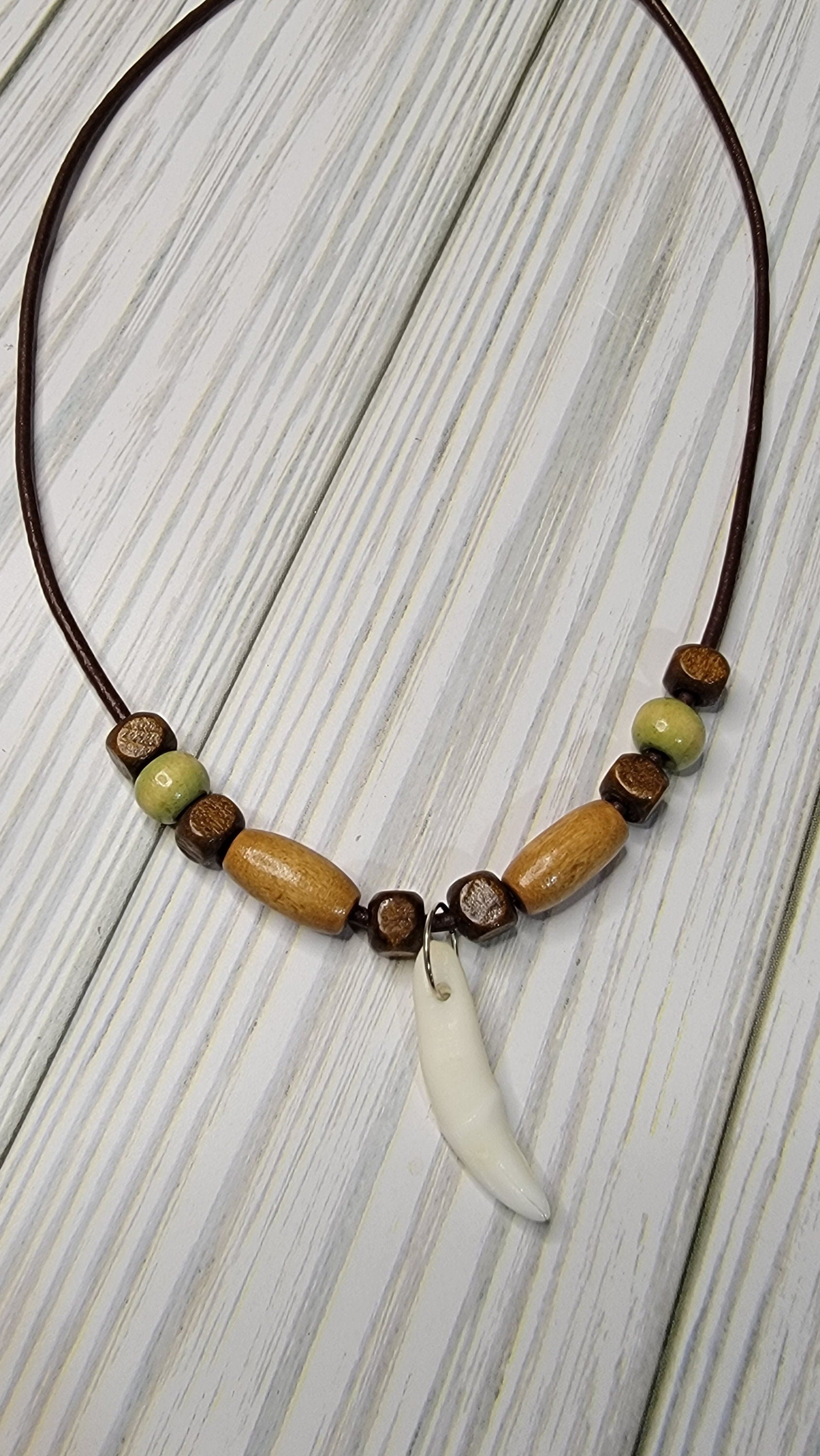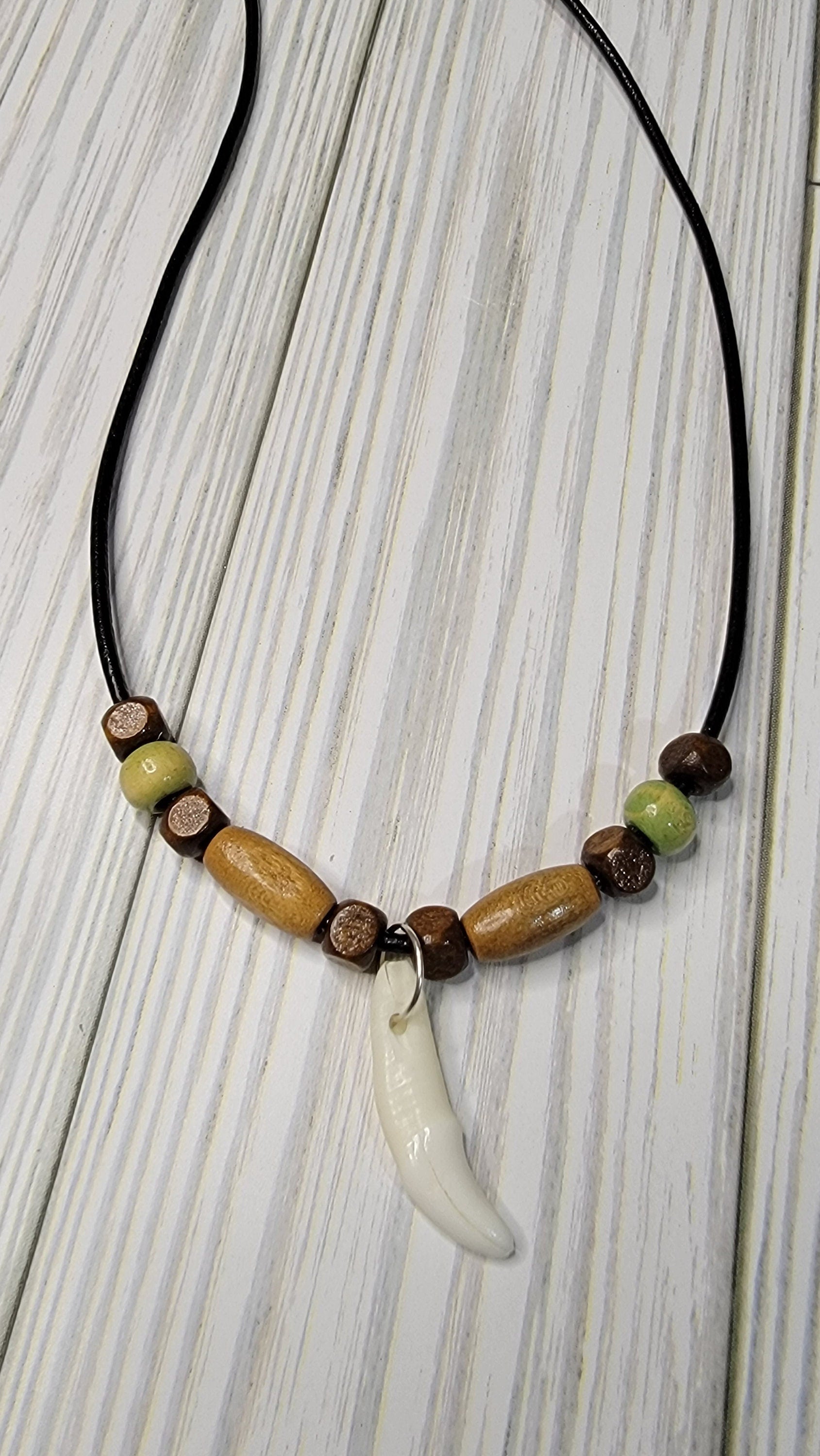 Stunning rustic style Coyote tooth Necklace. This leather necklace is adorned with beautiful brown & green wood beads. These are real coyote canine fangs, wonderful for those who enjoy rustic outdoor style jewelry. You will get one necklace with this listing, and it will vary slightly as these are real teeth. They will be the same size and shape as in the photos, with very minor differences. Very unique piece of rustic themed jewelry. Excellent gift for those who love hunting and/or the outdoors! The perfect piece for any occasion.