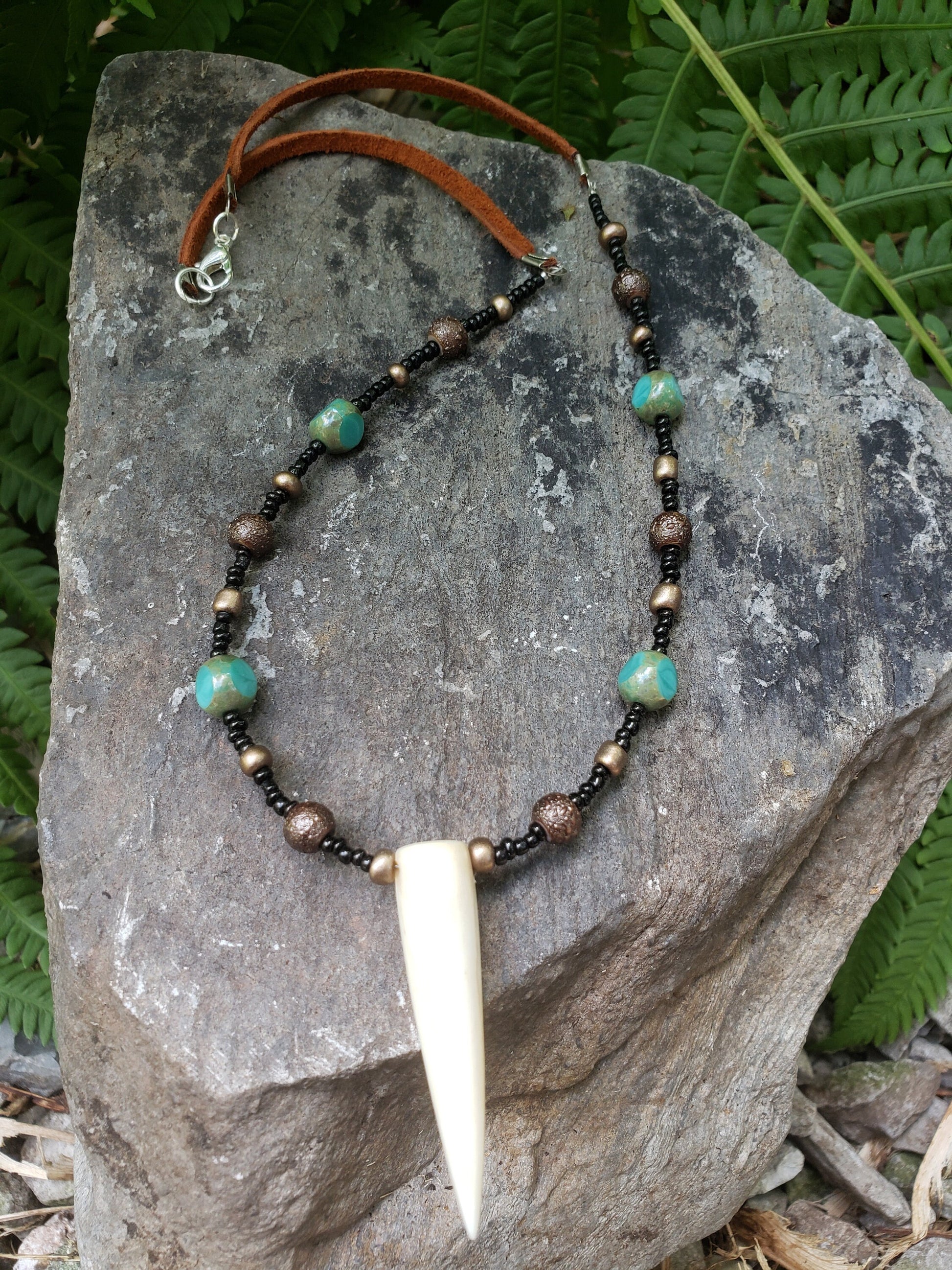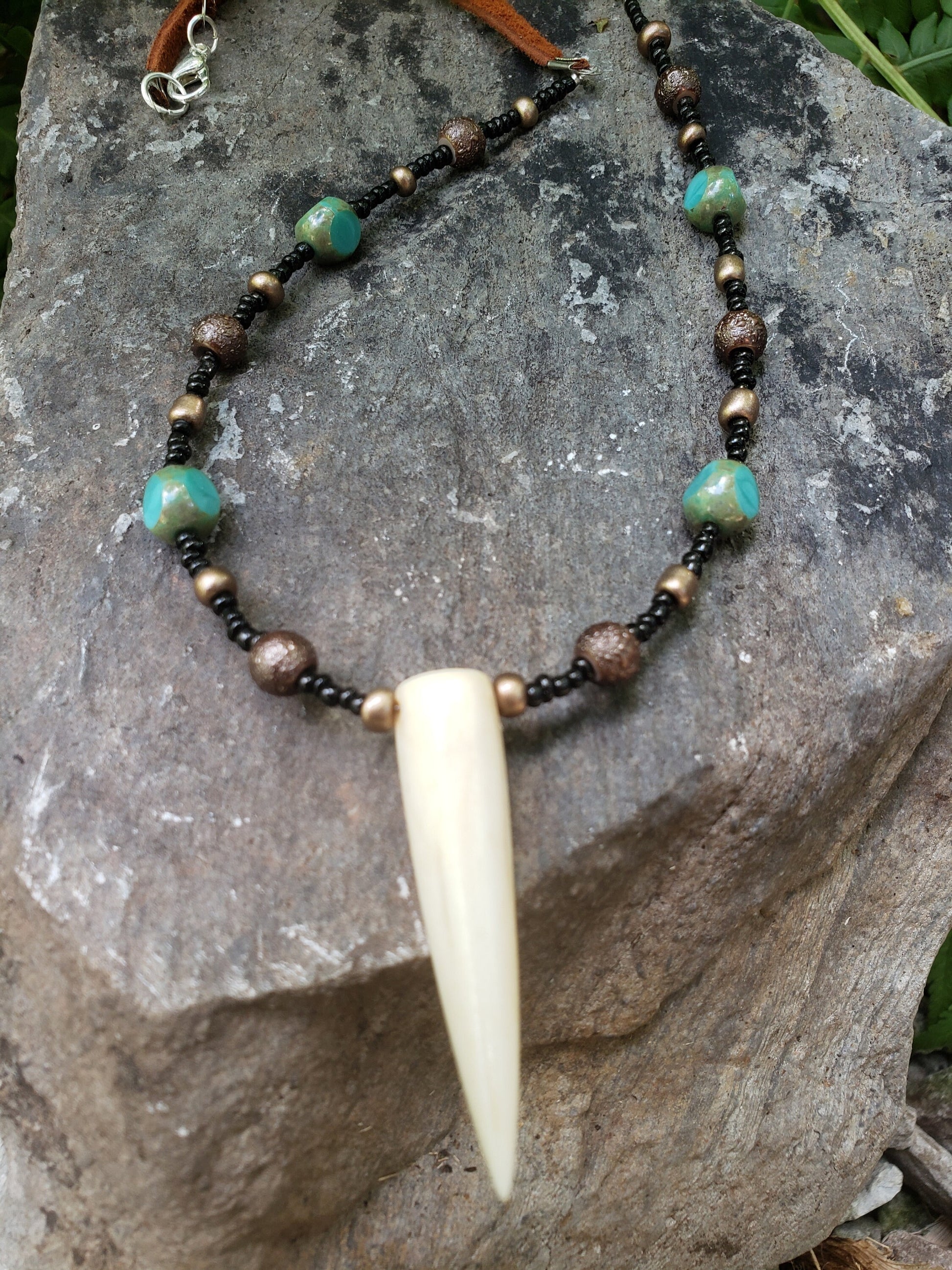 Stunning necklace featuring a Real Deer Antler Pendant on a beaded leather necklace. This necklace features stone beaded as shown in the photos. Very unique piece of rustic themed jewelry. Excellent for those who love hunting and/or the outdoors!