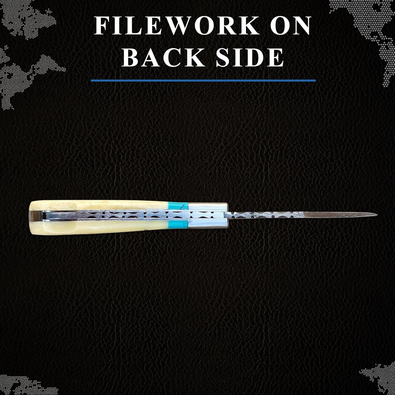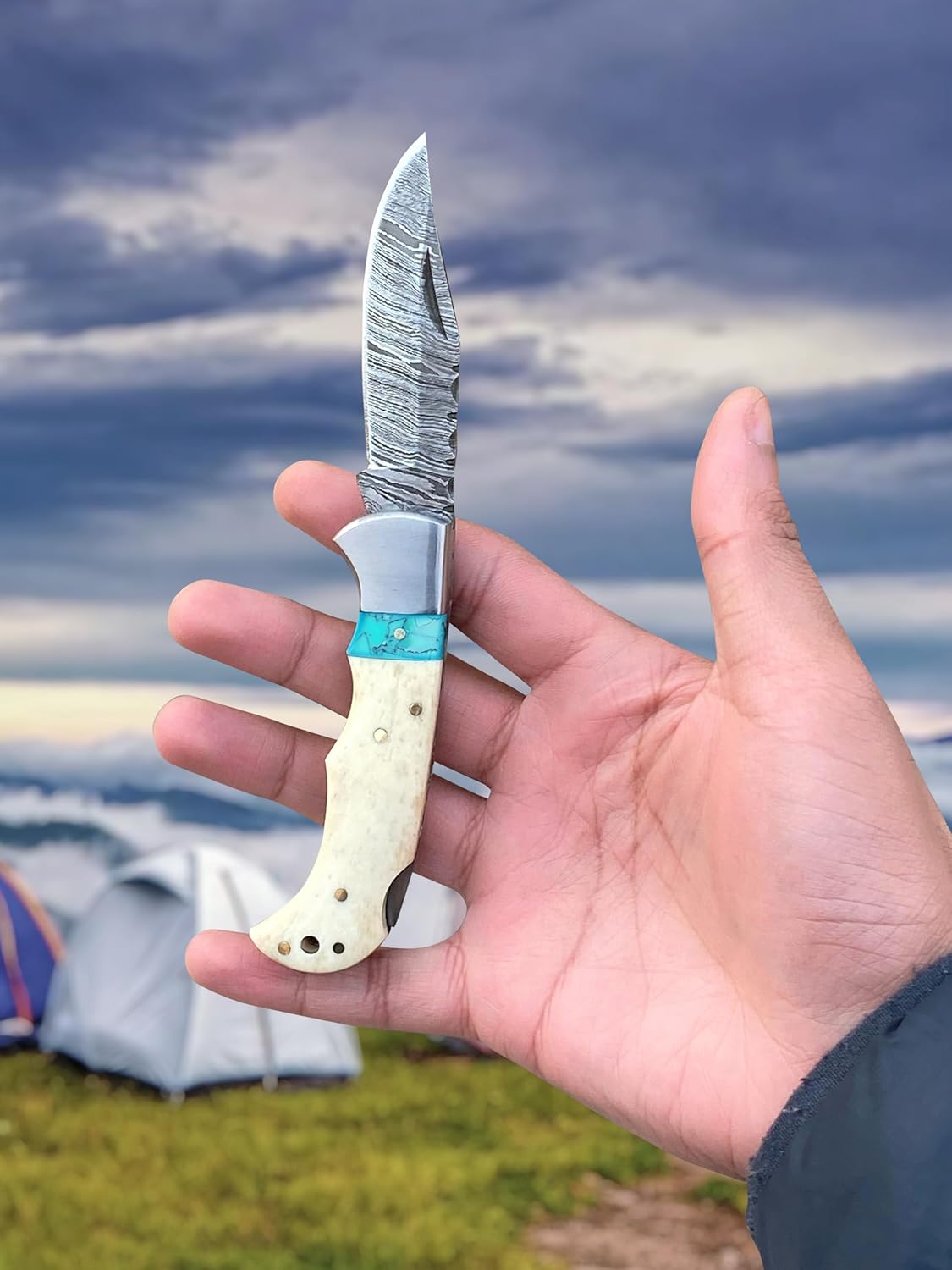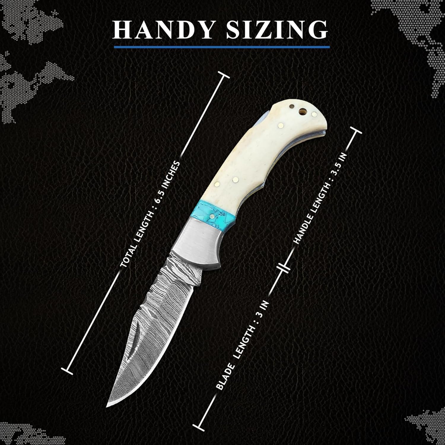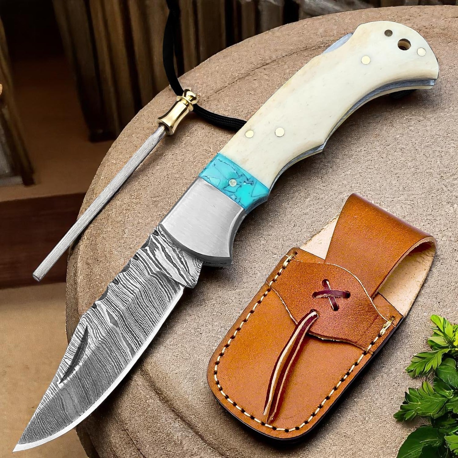 Bone With Turquoise Handle 6.5" Damascus Pocket Knife