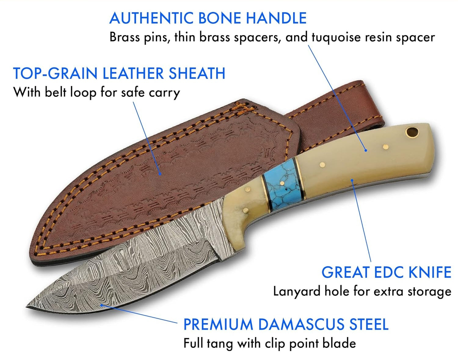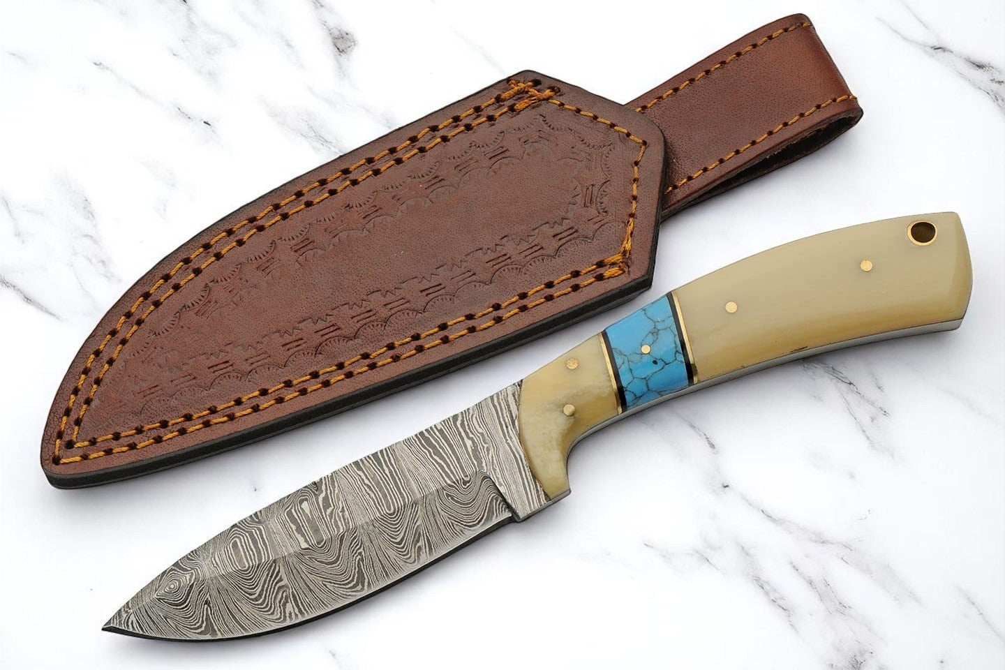 Bone With Turquoise Handle 8" Damascus Hunting Knife