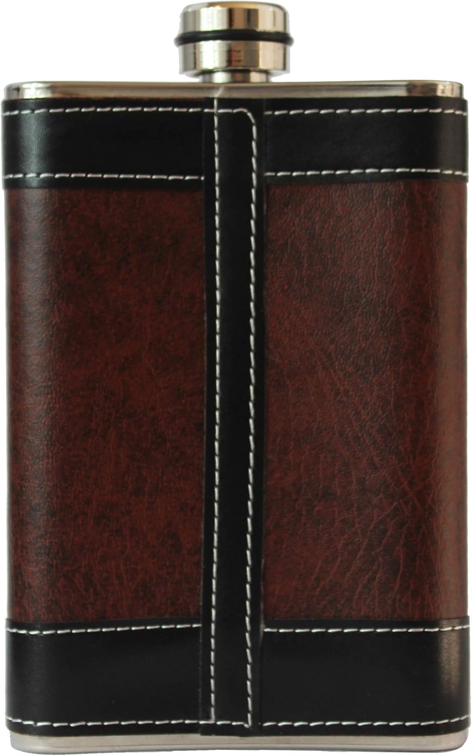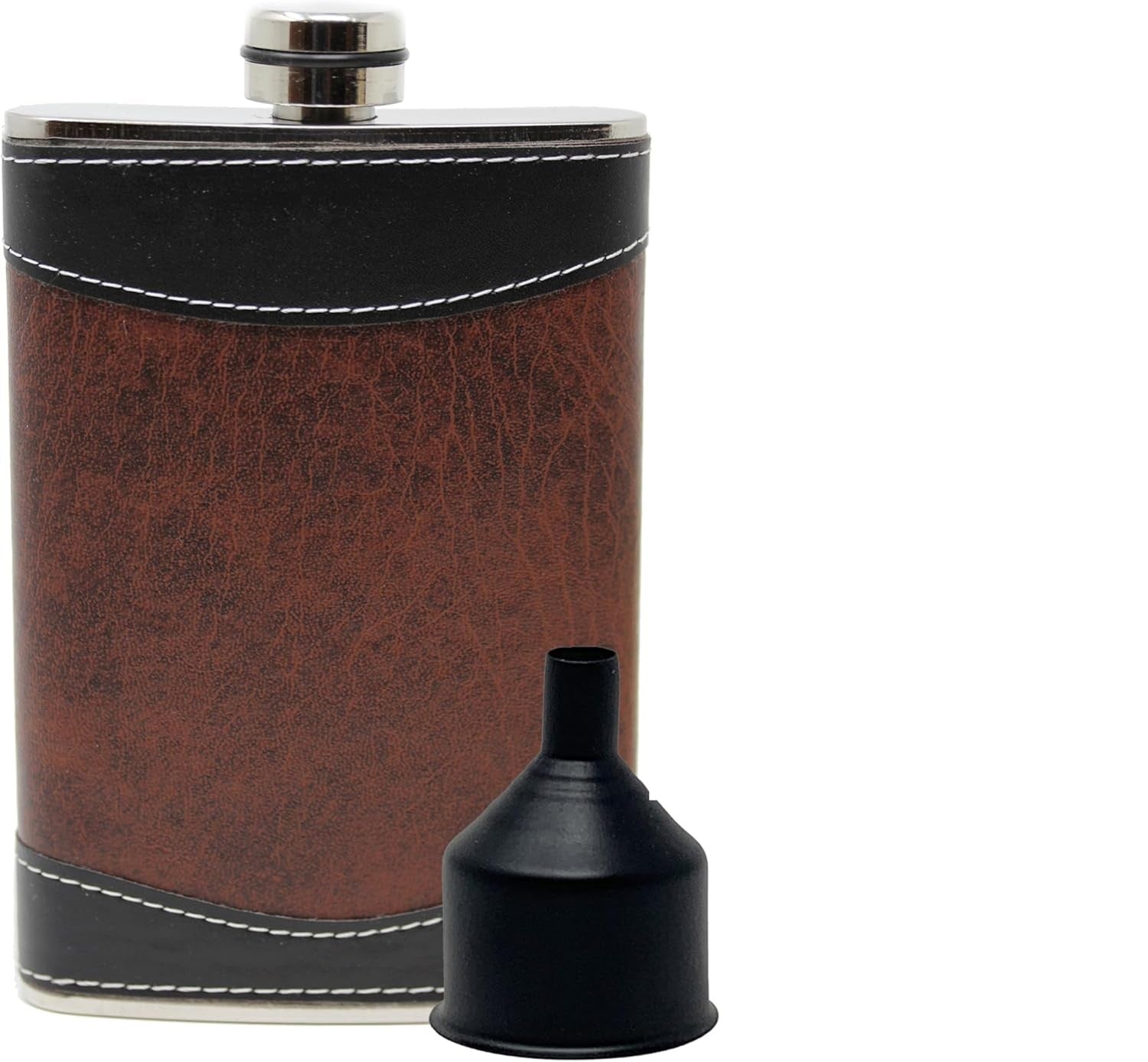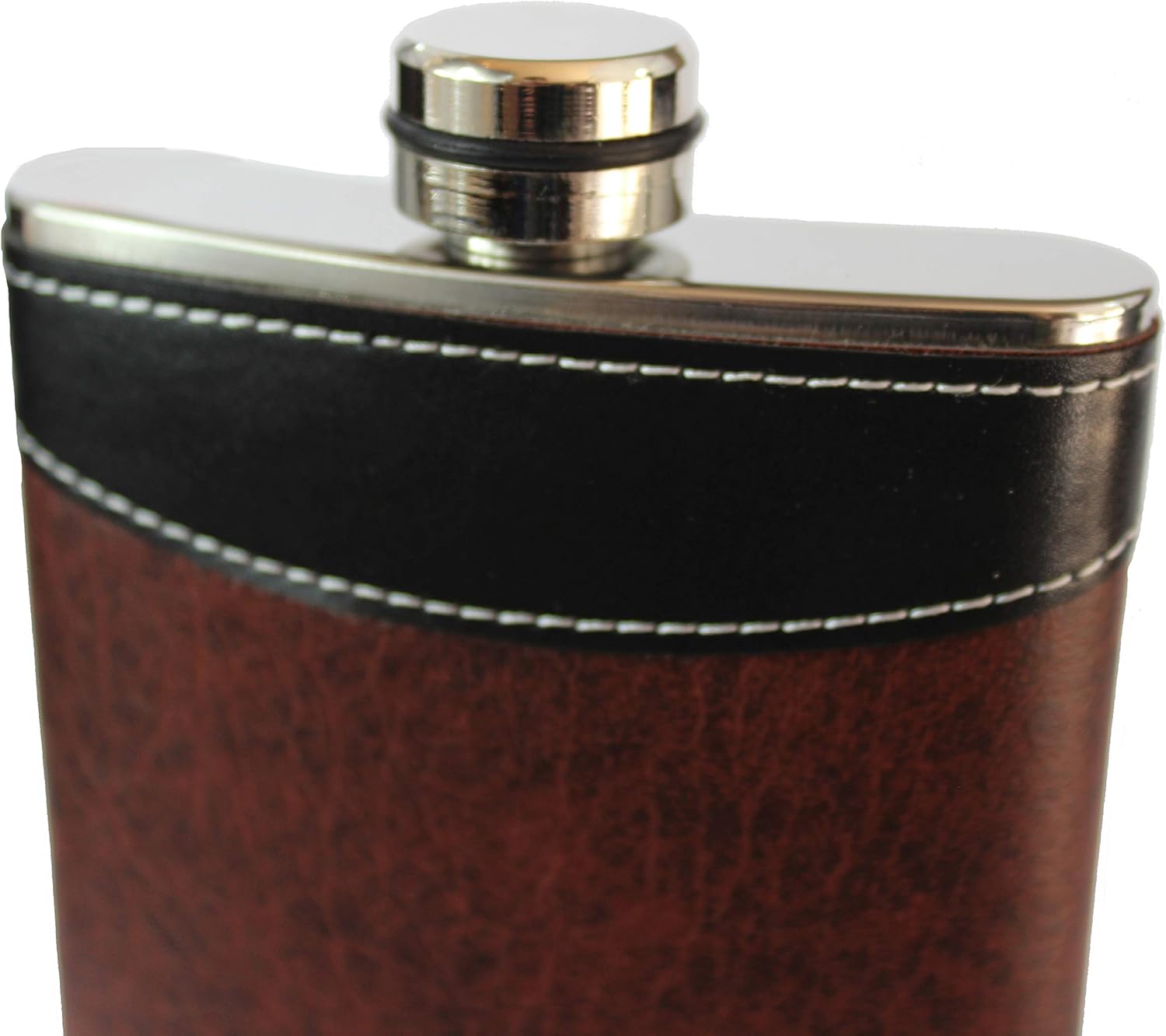 Brown & Black Leather 8oz Hip Flask With Funnel