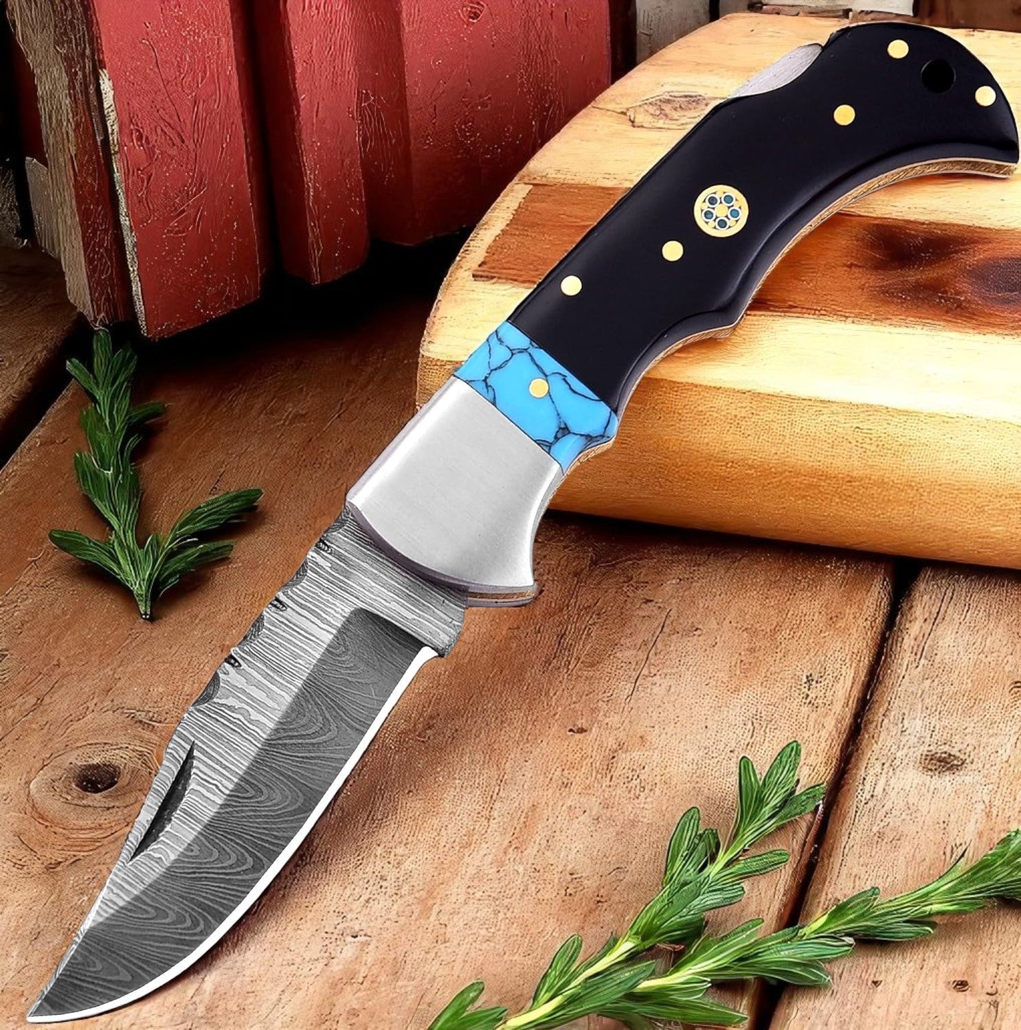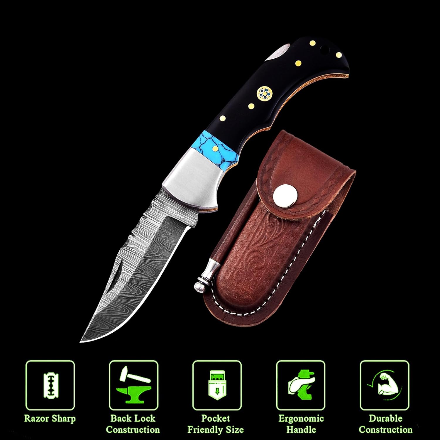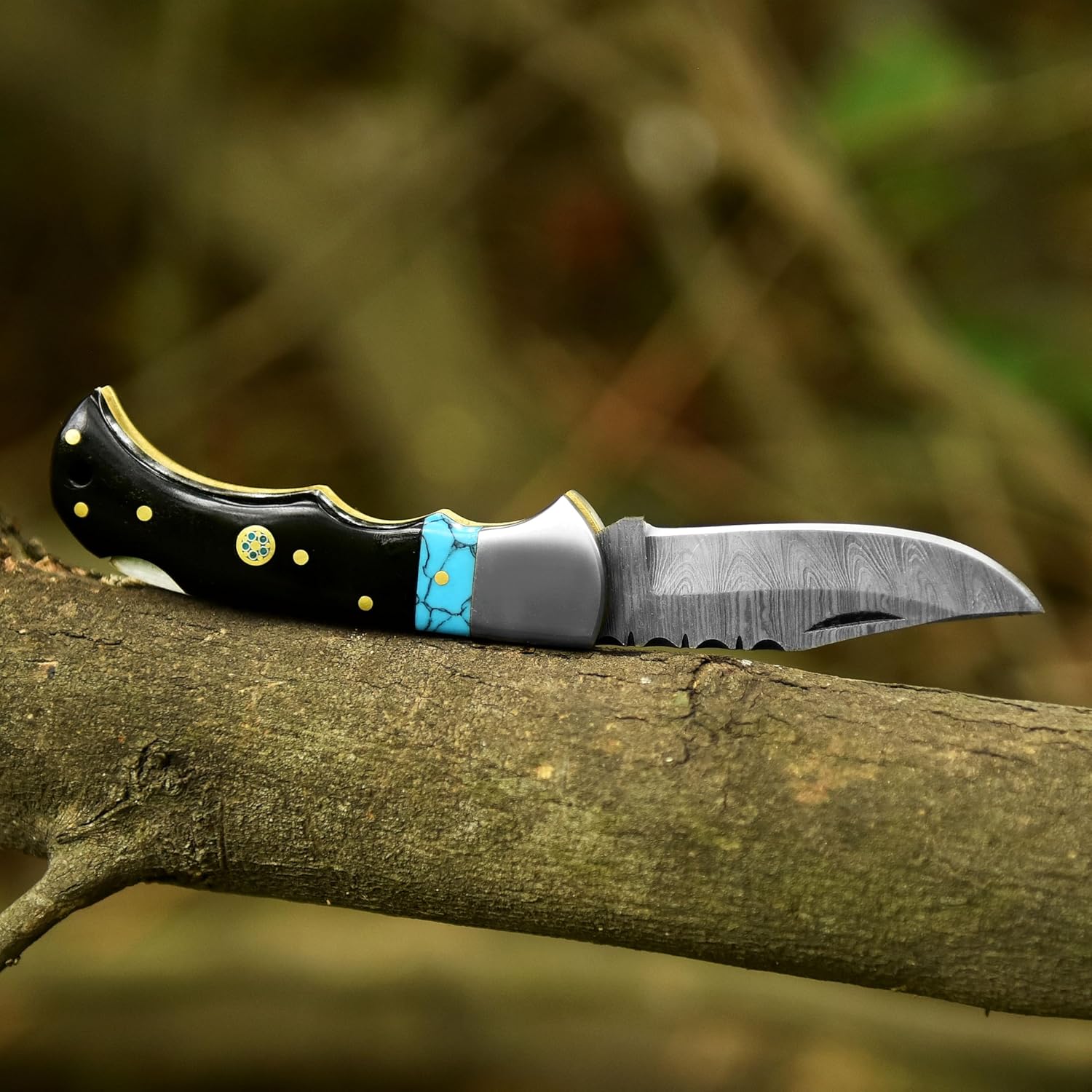 Bull Horn 7" Damascus Pocket Knife With Turquoise