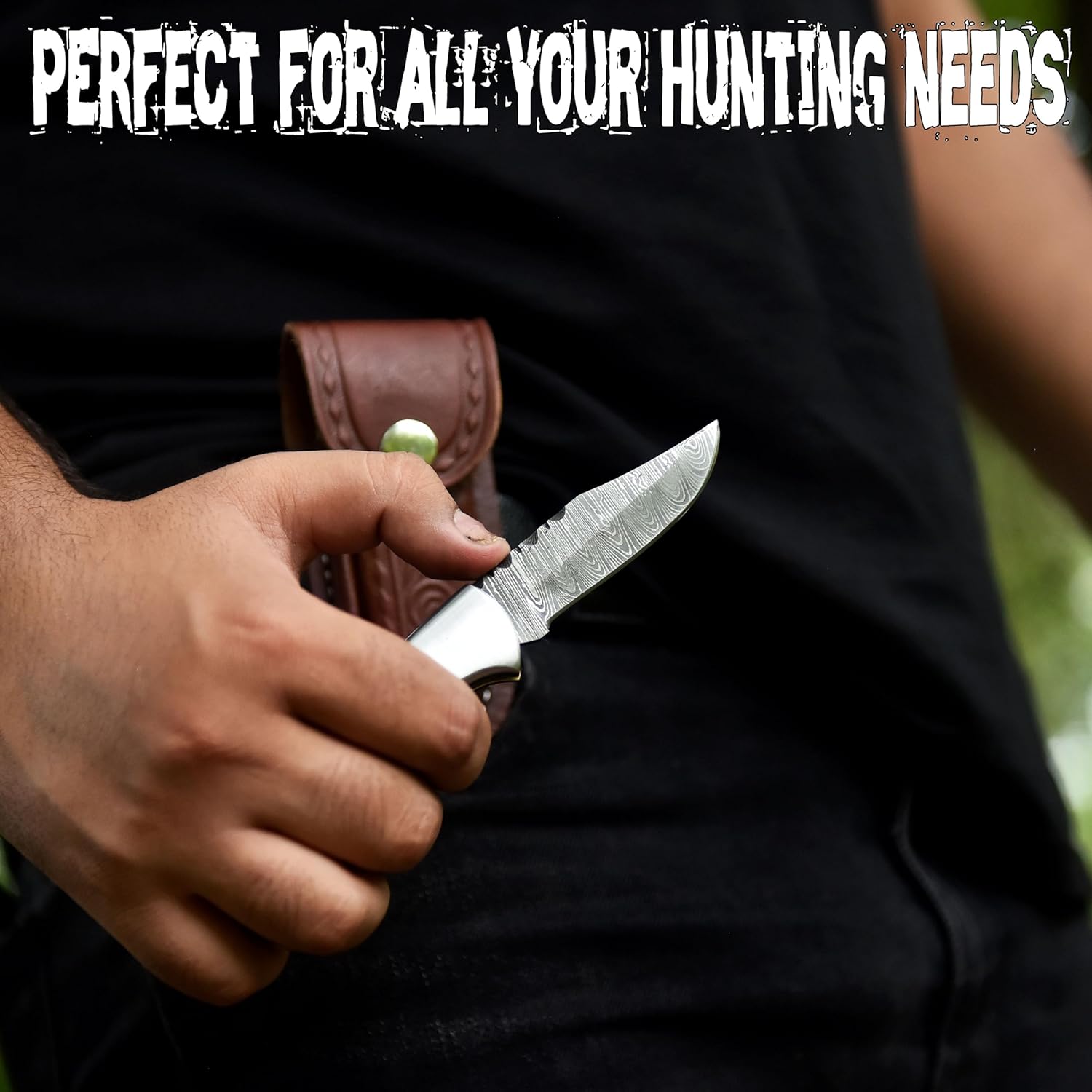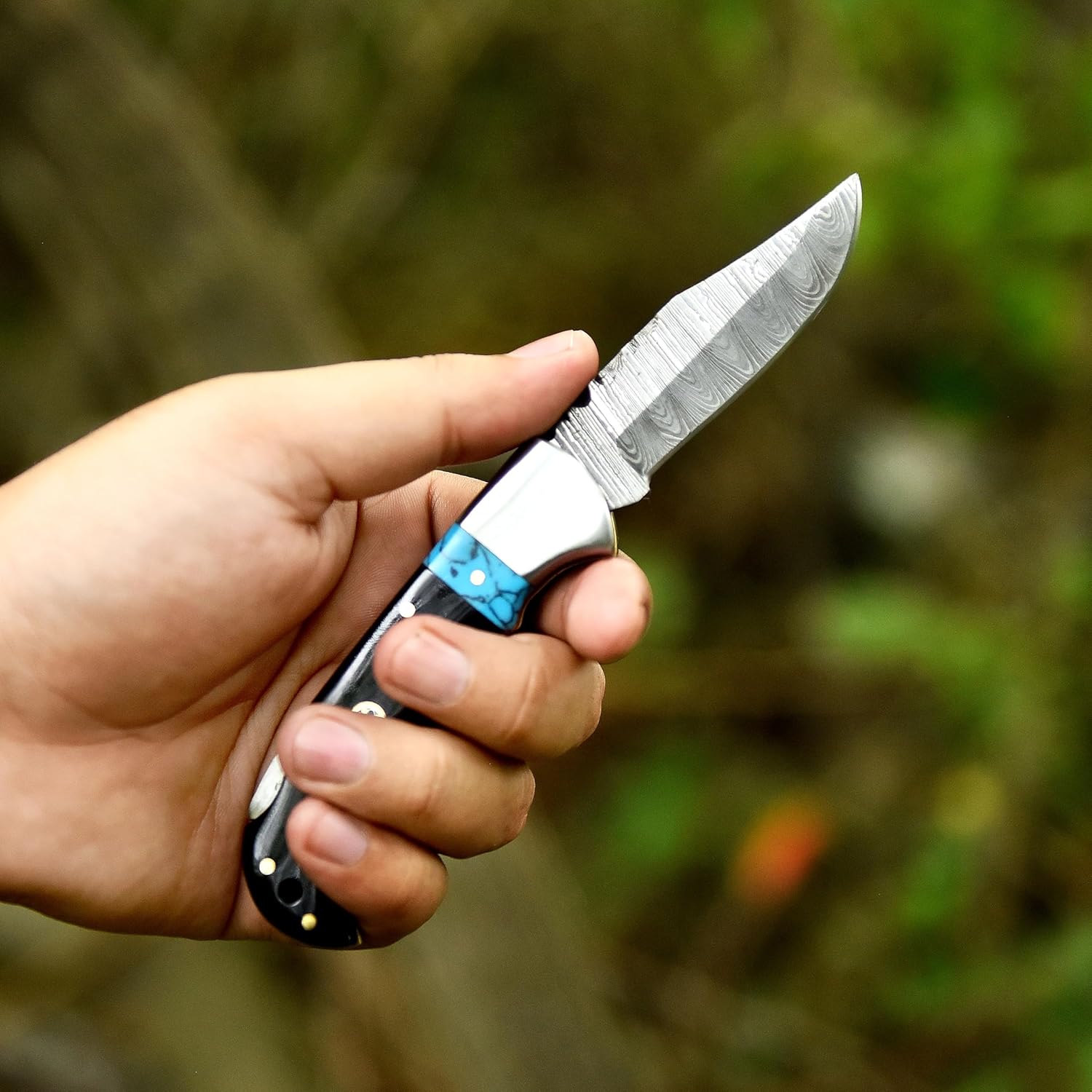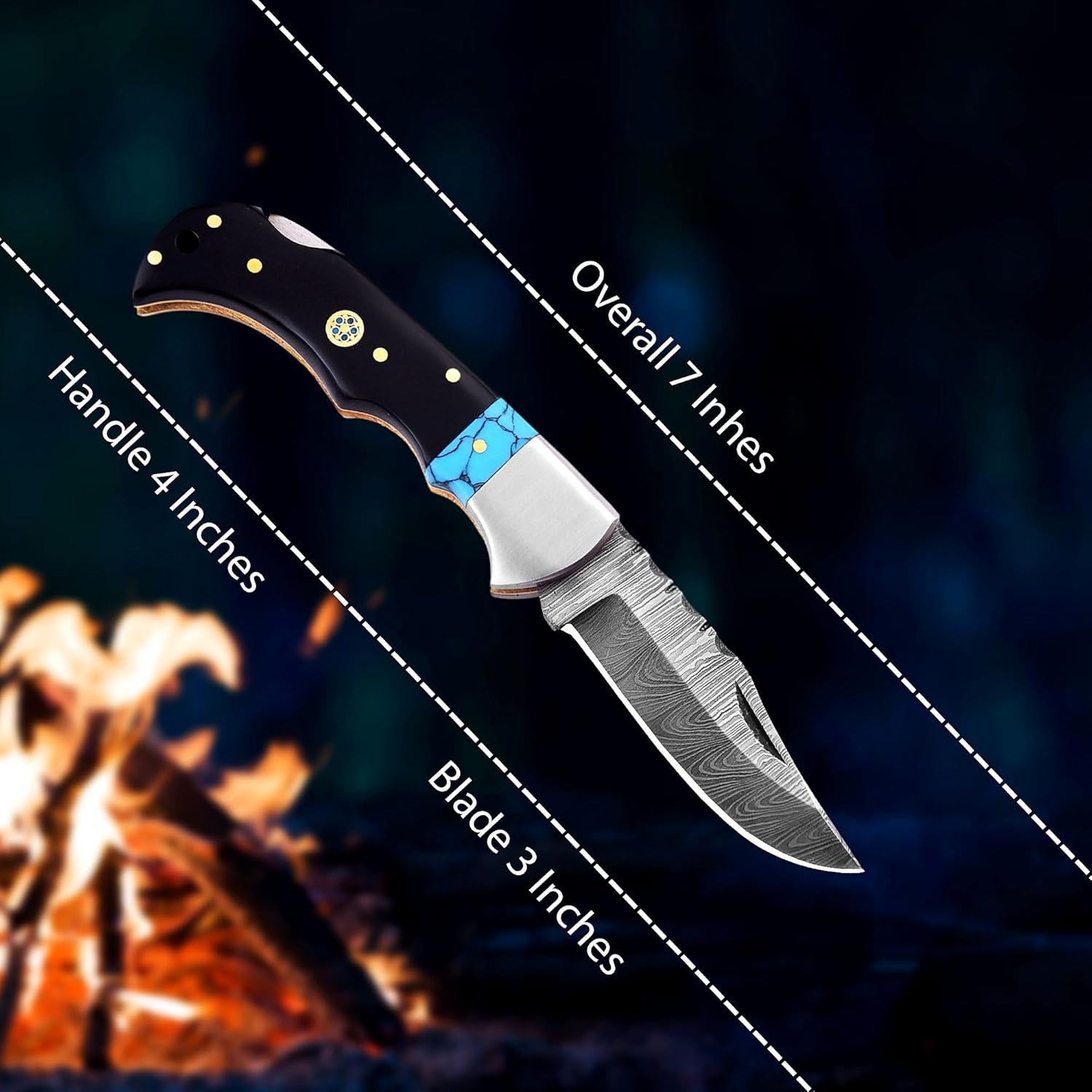 Bull Horn 7" Damascus Pocket Knife With Turquoise