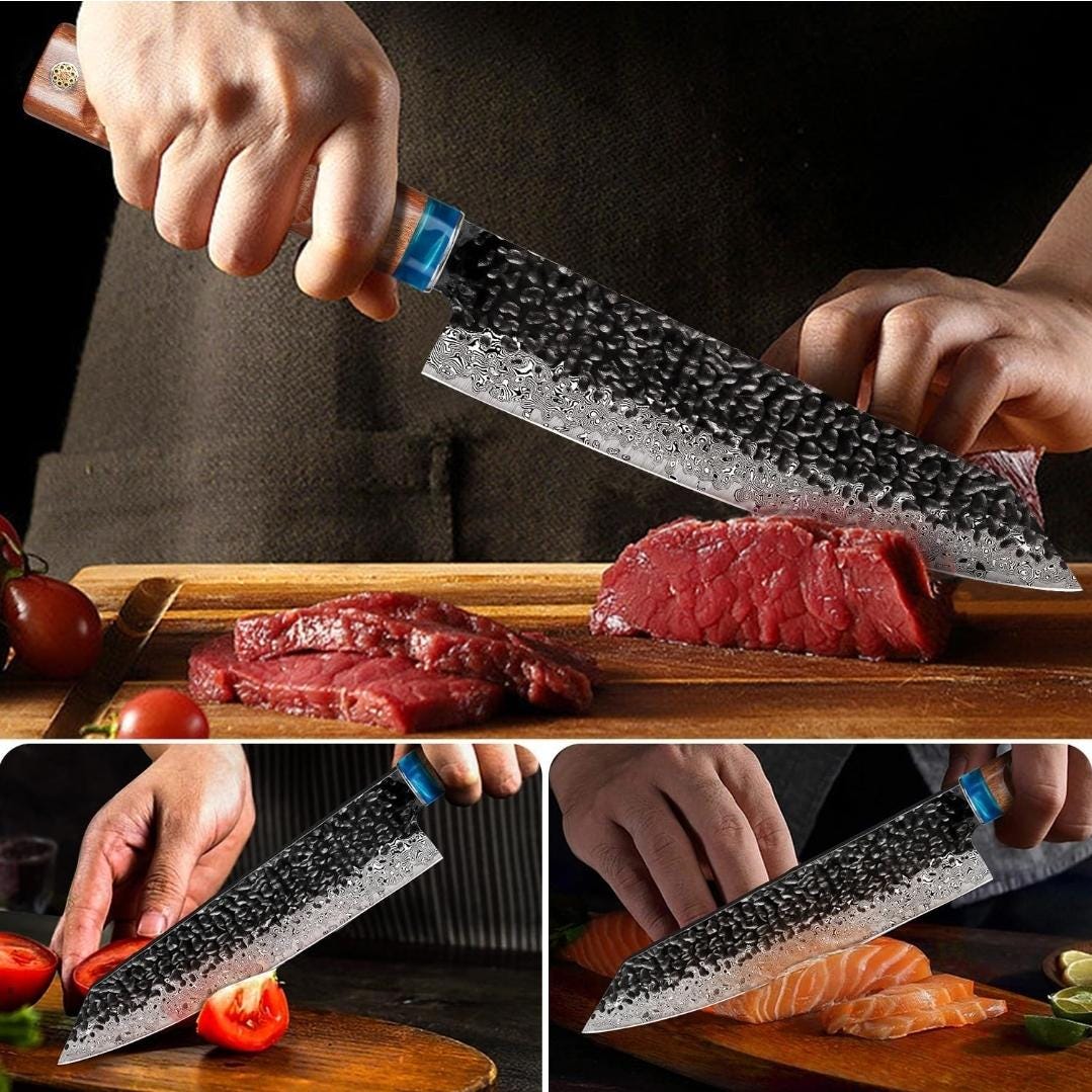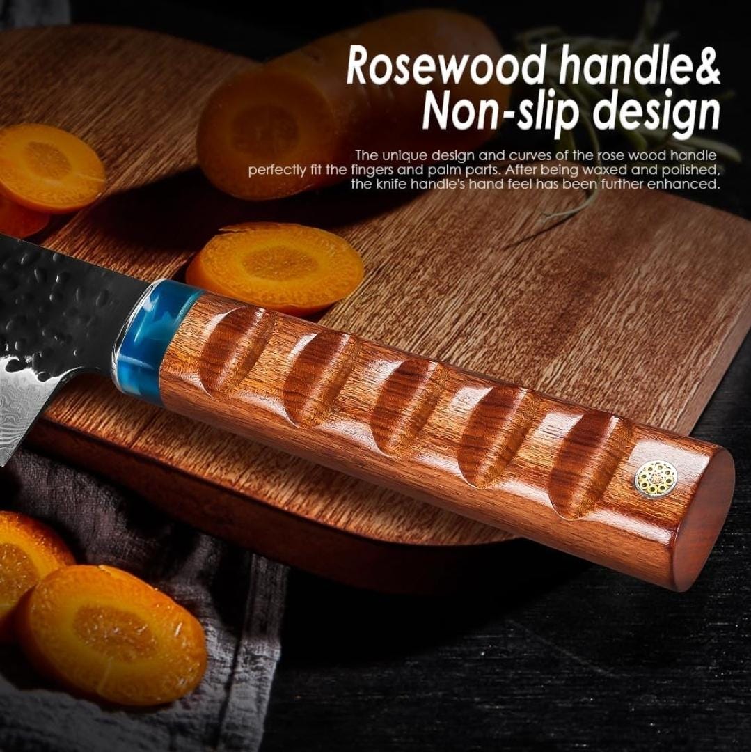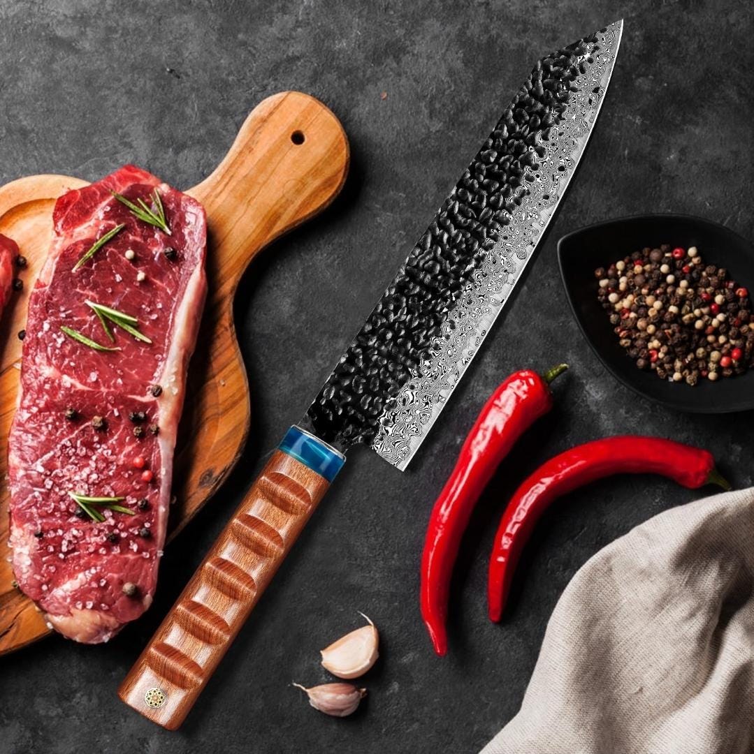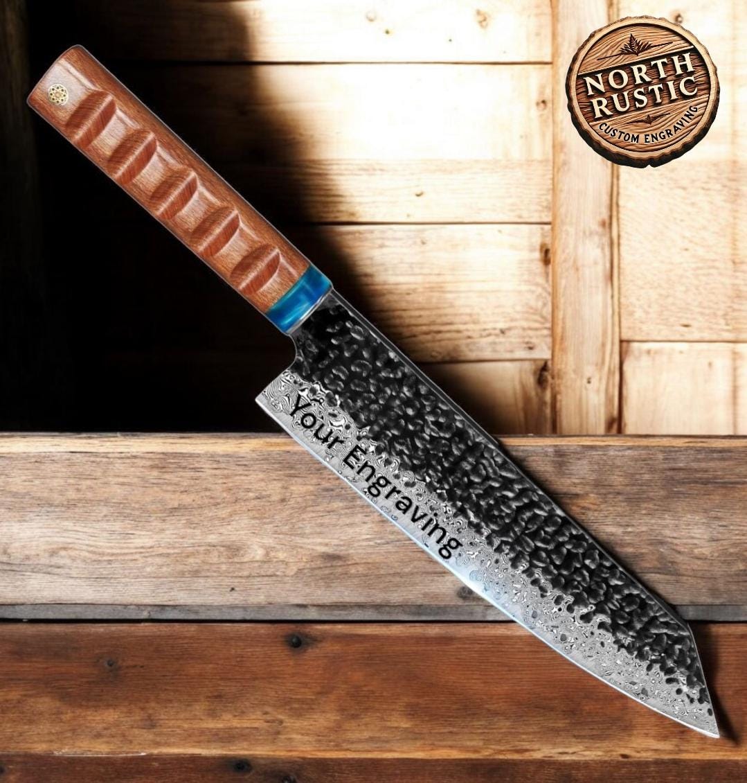 Chef Knife Hammered Damascus 8" Kiritsuke Knife Engraved Custom Culinary Chef Knives Gifts for Him Her Men Women Gift Cooking Cutlery KL07