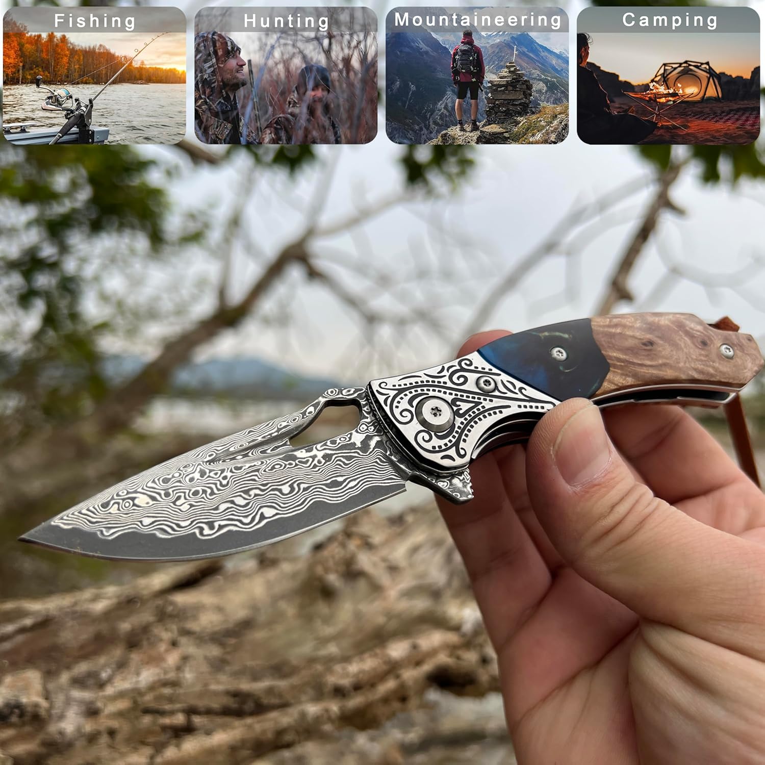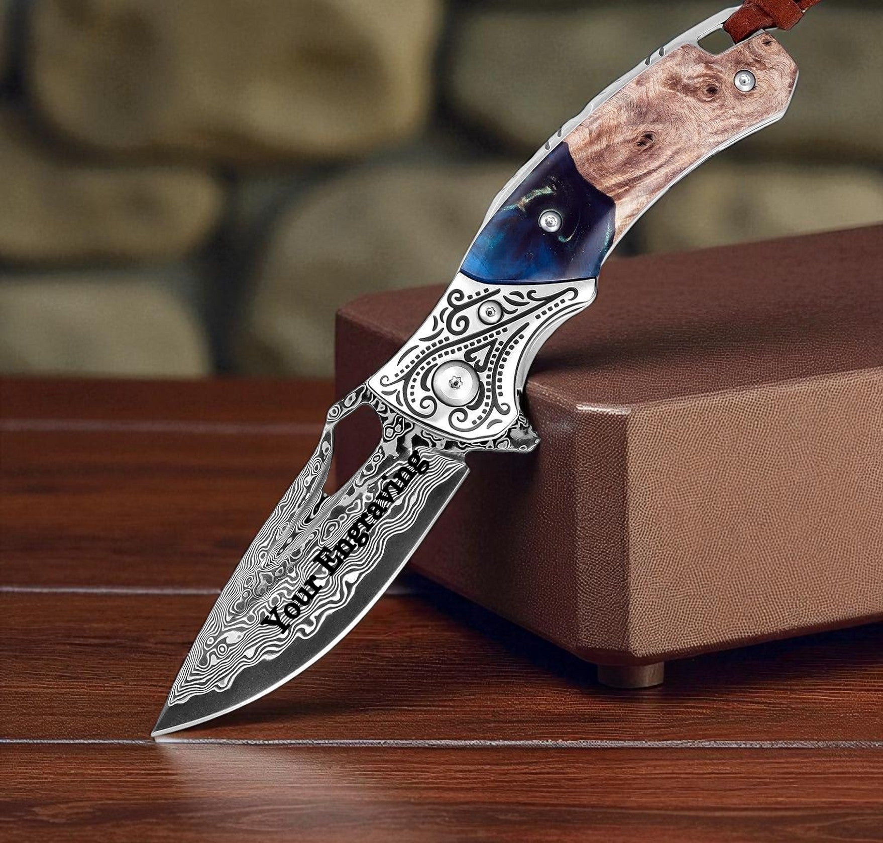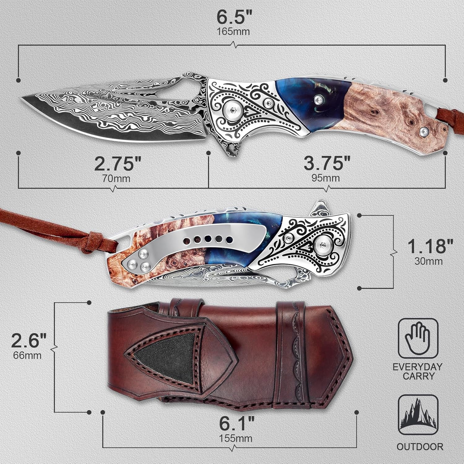 Damascus 6.5" Folding Knife Resin & Maple Wood Handle