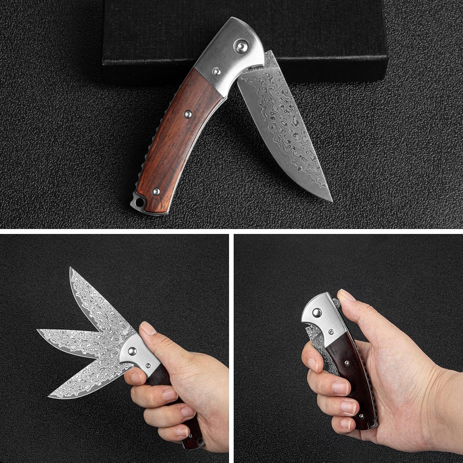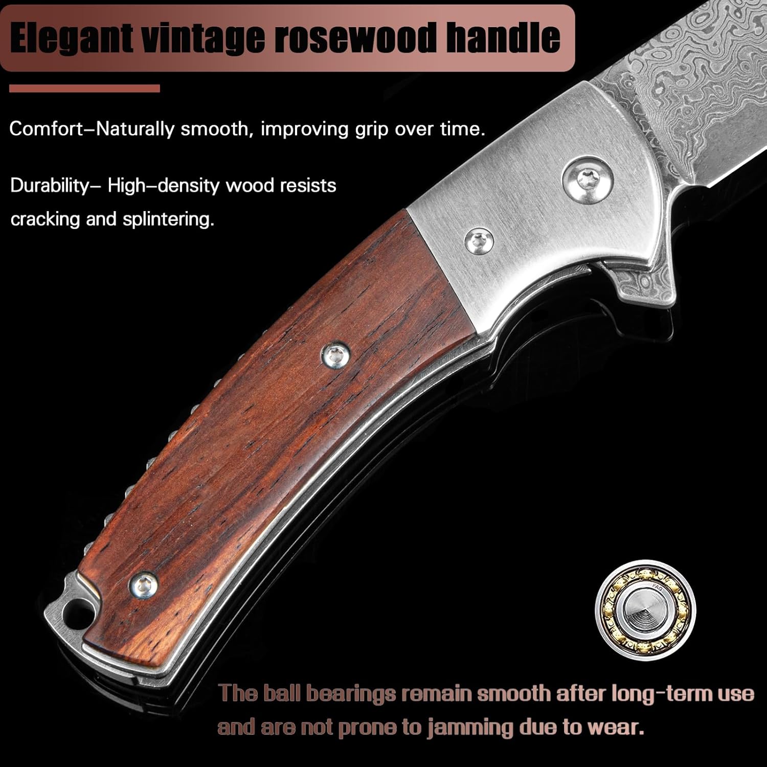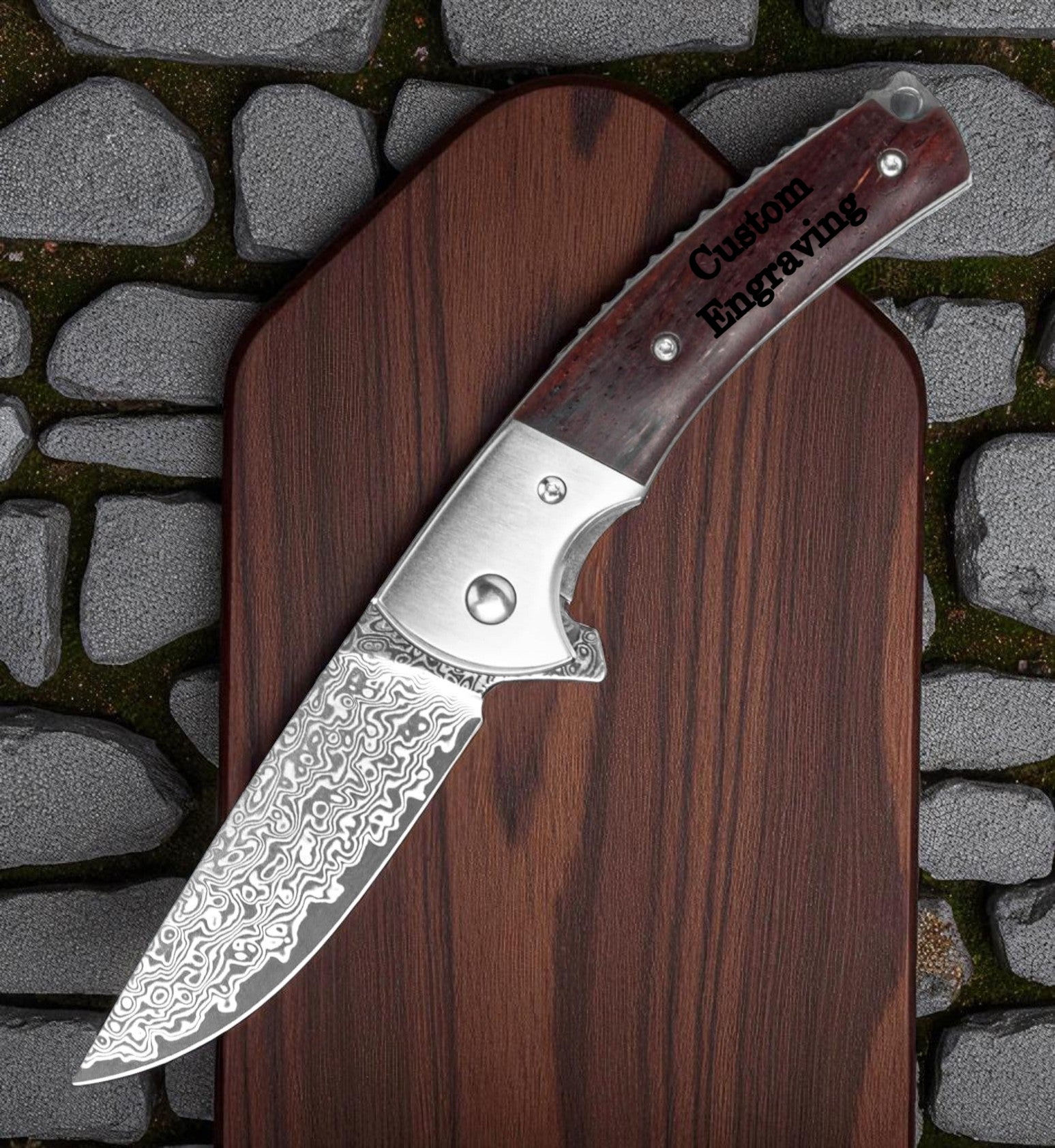 Damascus Pocket Knife, Rosewood Handle Folding Knife, Engraved Groomsman Gift, Personalized Gift for Him, EDC Hunting Knife