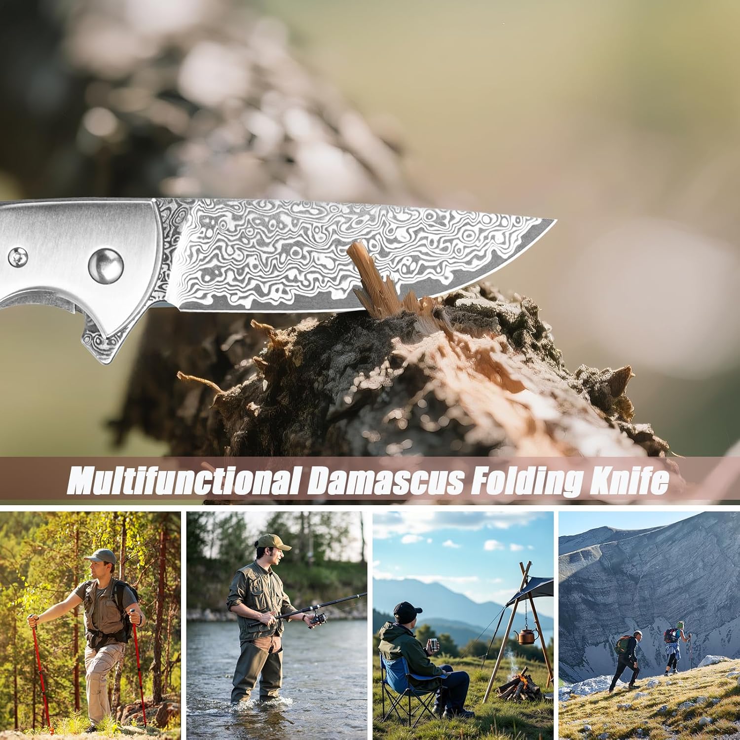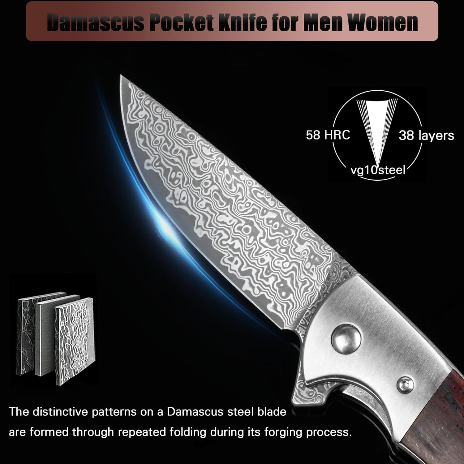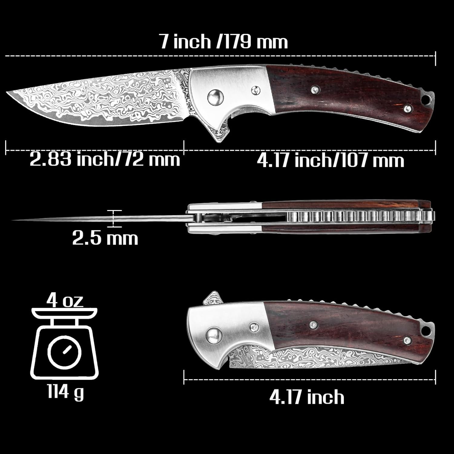 Damascus Pocket Knife, Rosewood Handle Folding Knife, Engraved Groomsman Gift, Personalized Gift for Him, EDC Hunting Knife