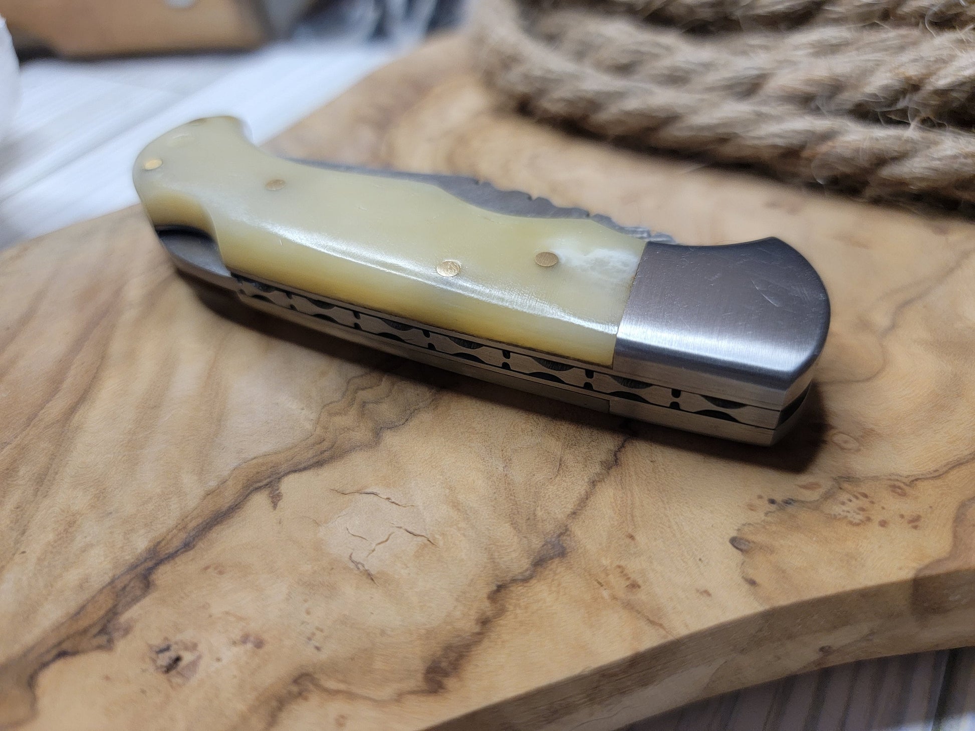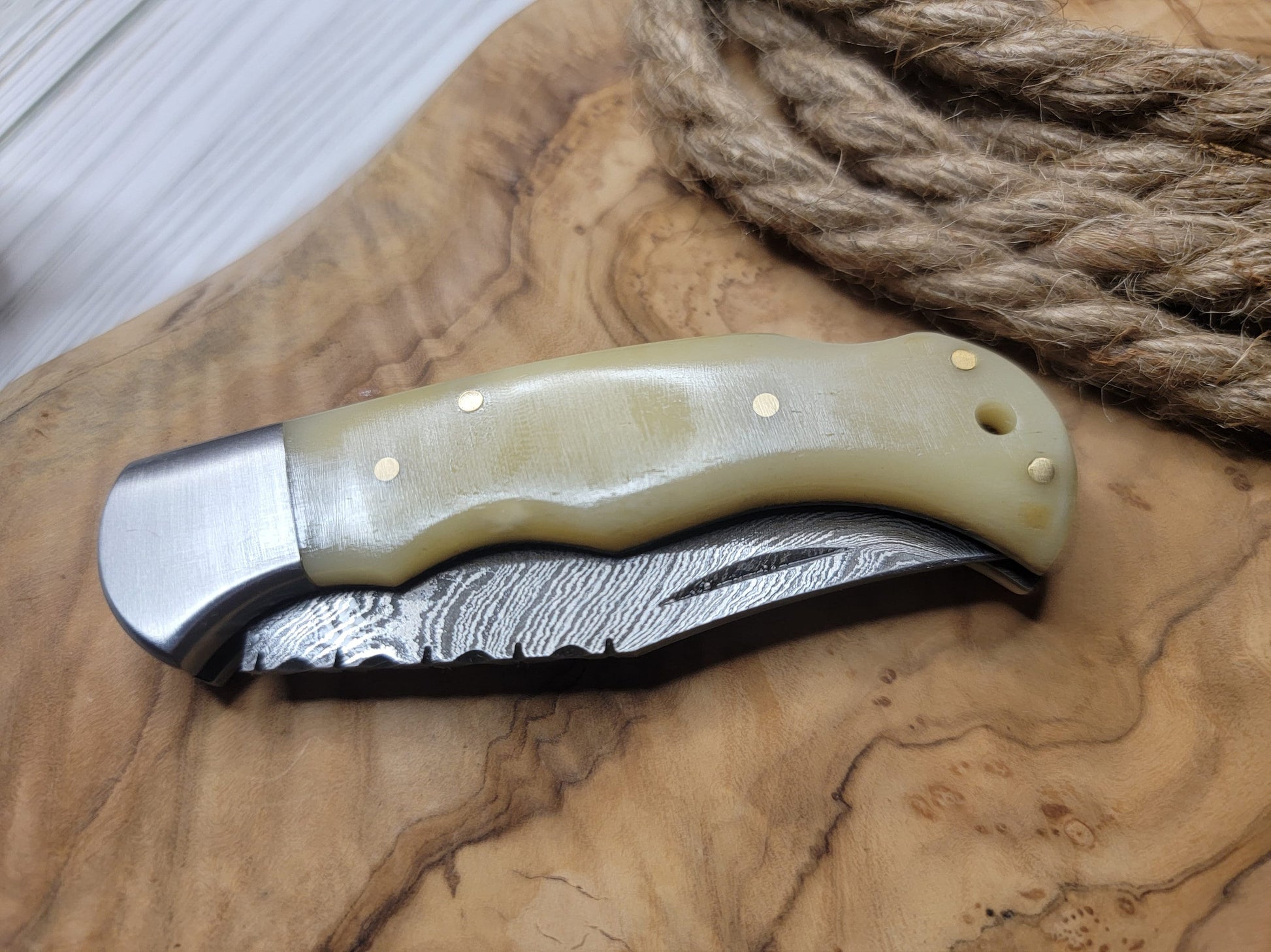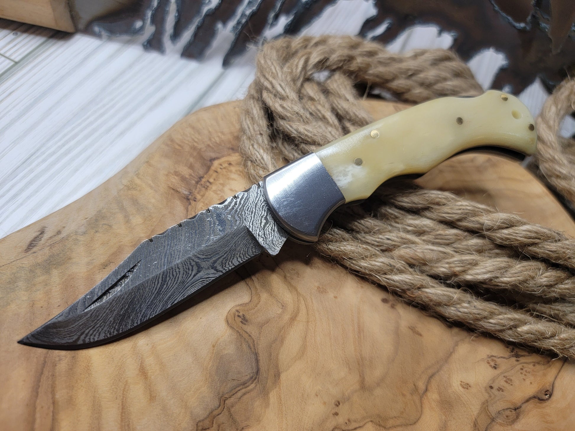 Damascus Pocket Knife Bone Handle Folding Knife Groomsmen Gift Anniversary Wedding Birthday Gift Handmade Personalized Gift for Him