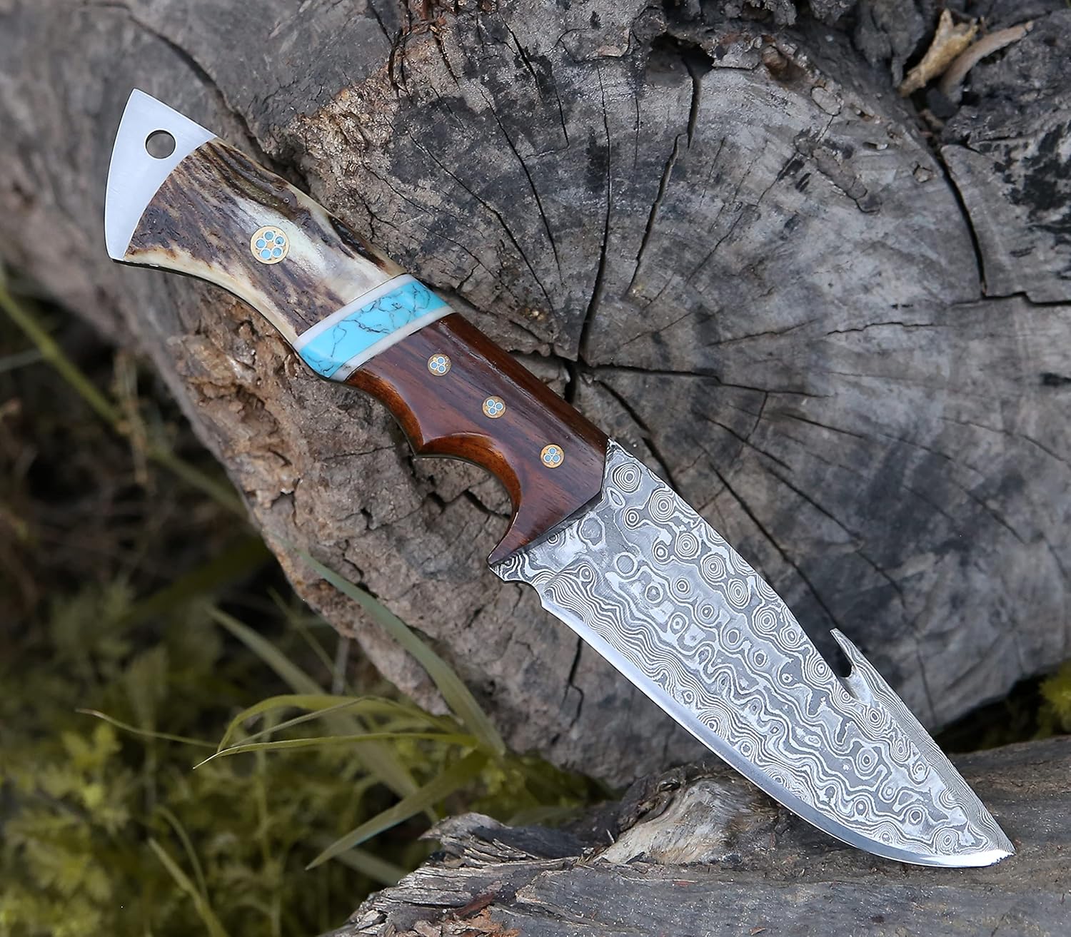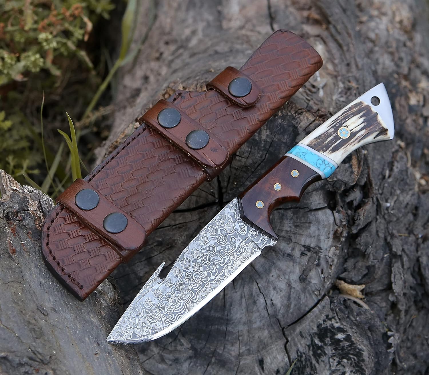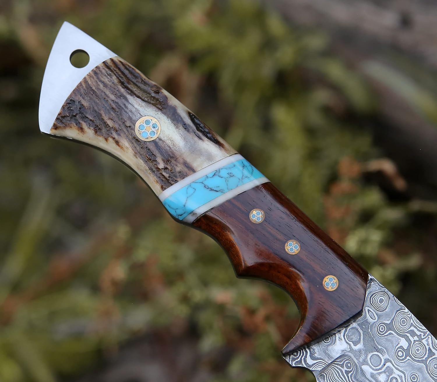 Deer Antler & Rosewood Handle Damascus 9.5" Hunting Knife Blue Turquoise
