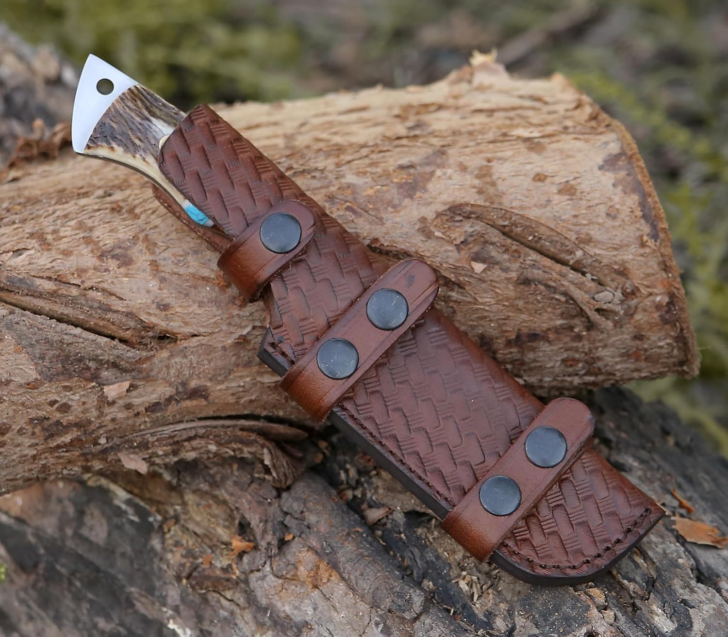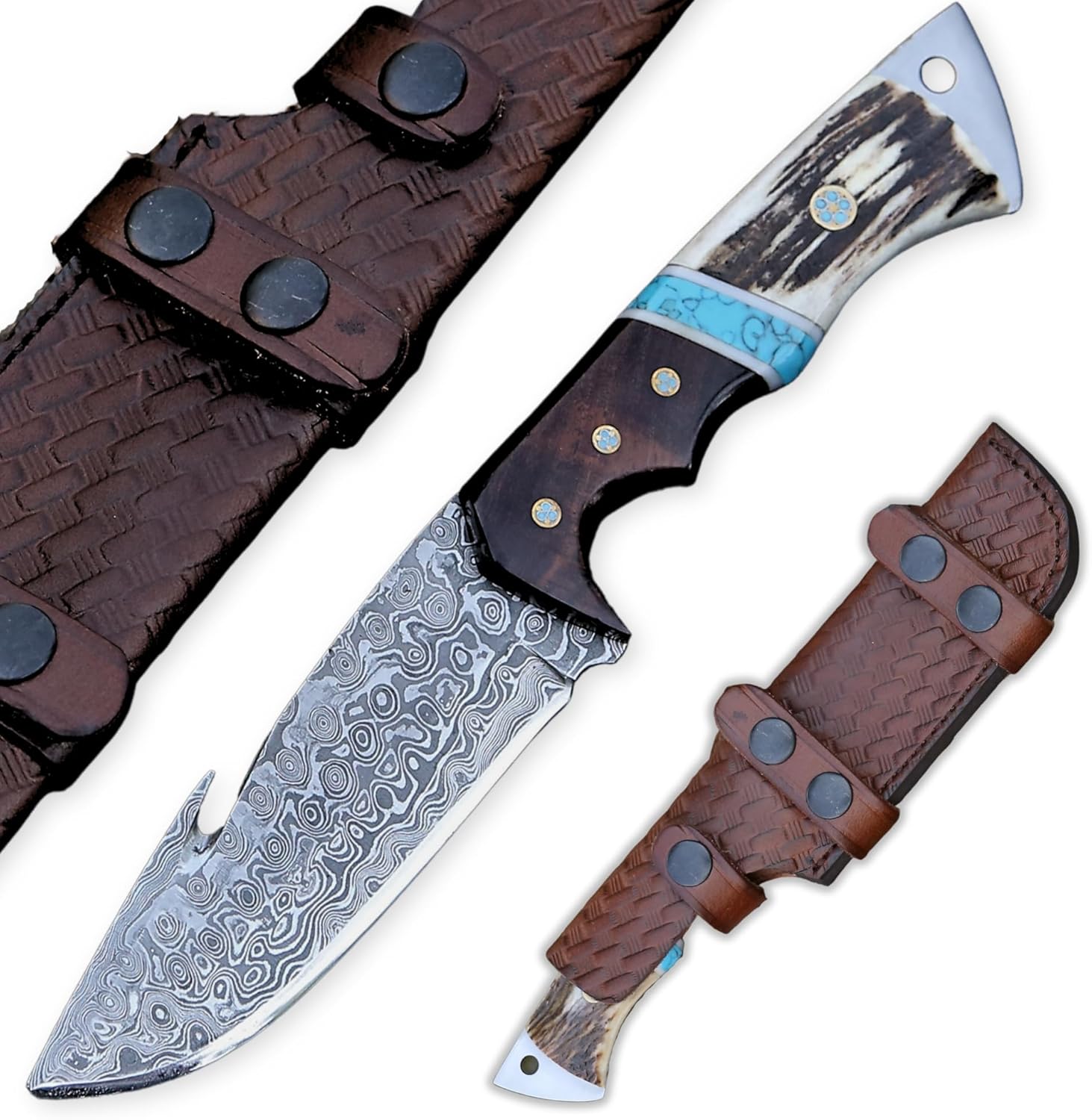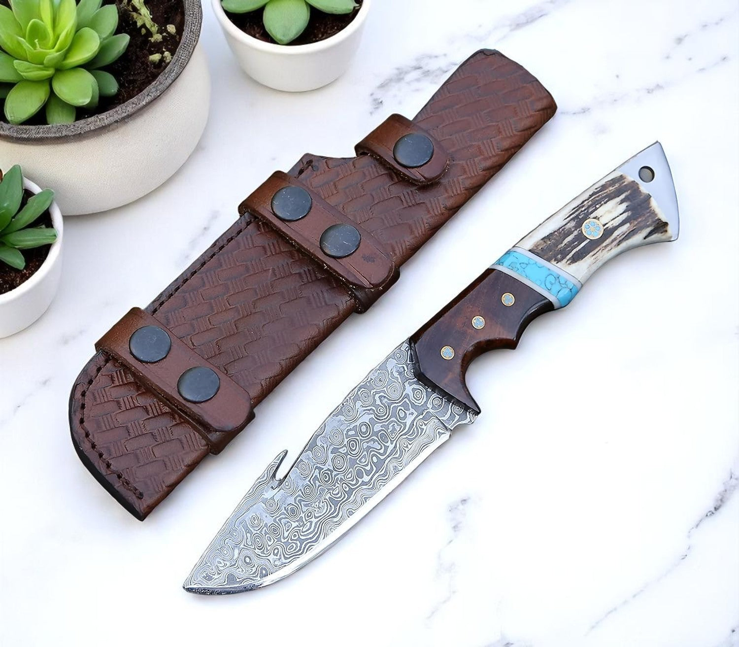 Deer Antler & Rosewood Handle Damascus 9.5" Hunting Knife Blue Turquoise