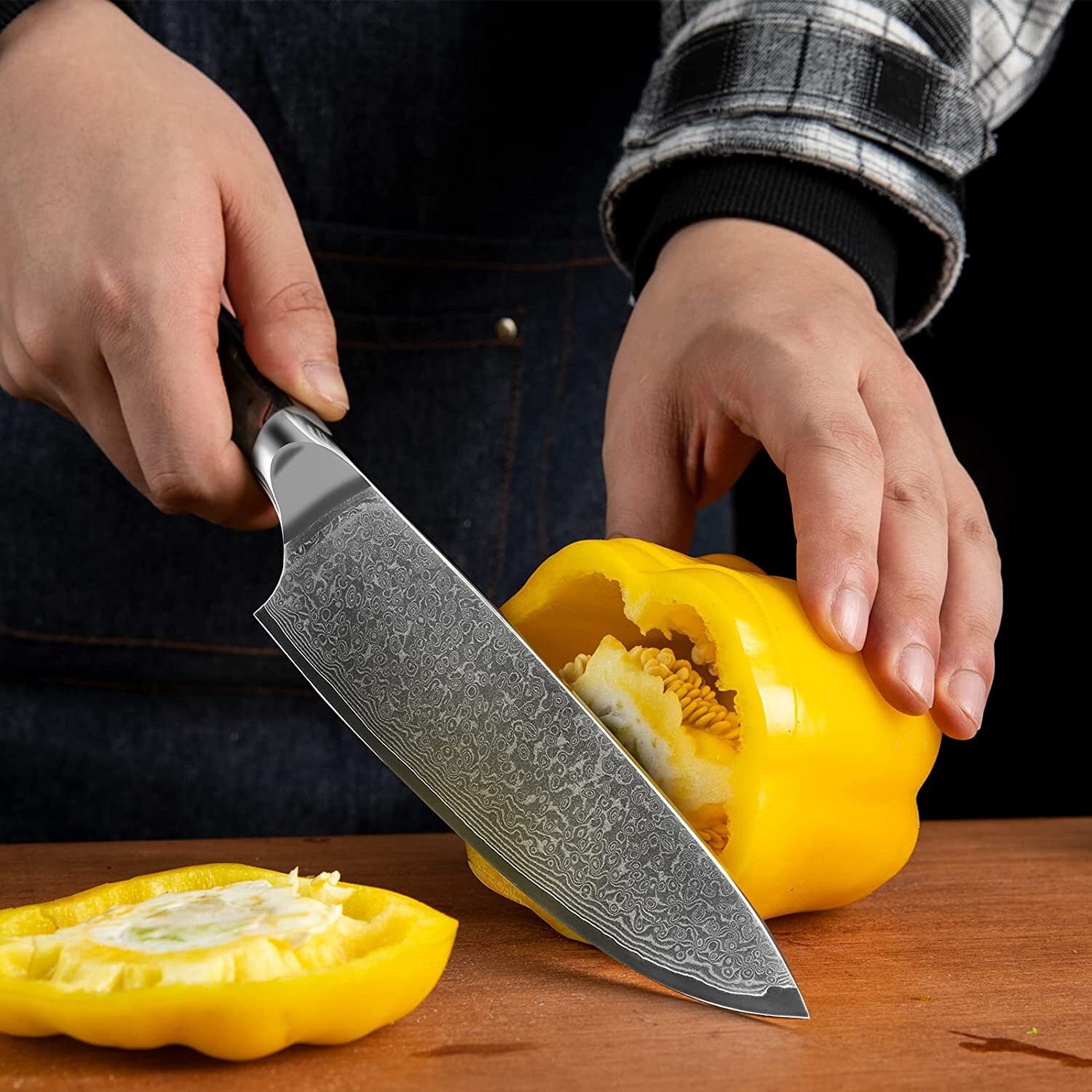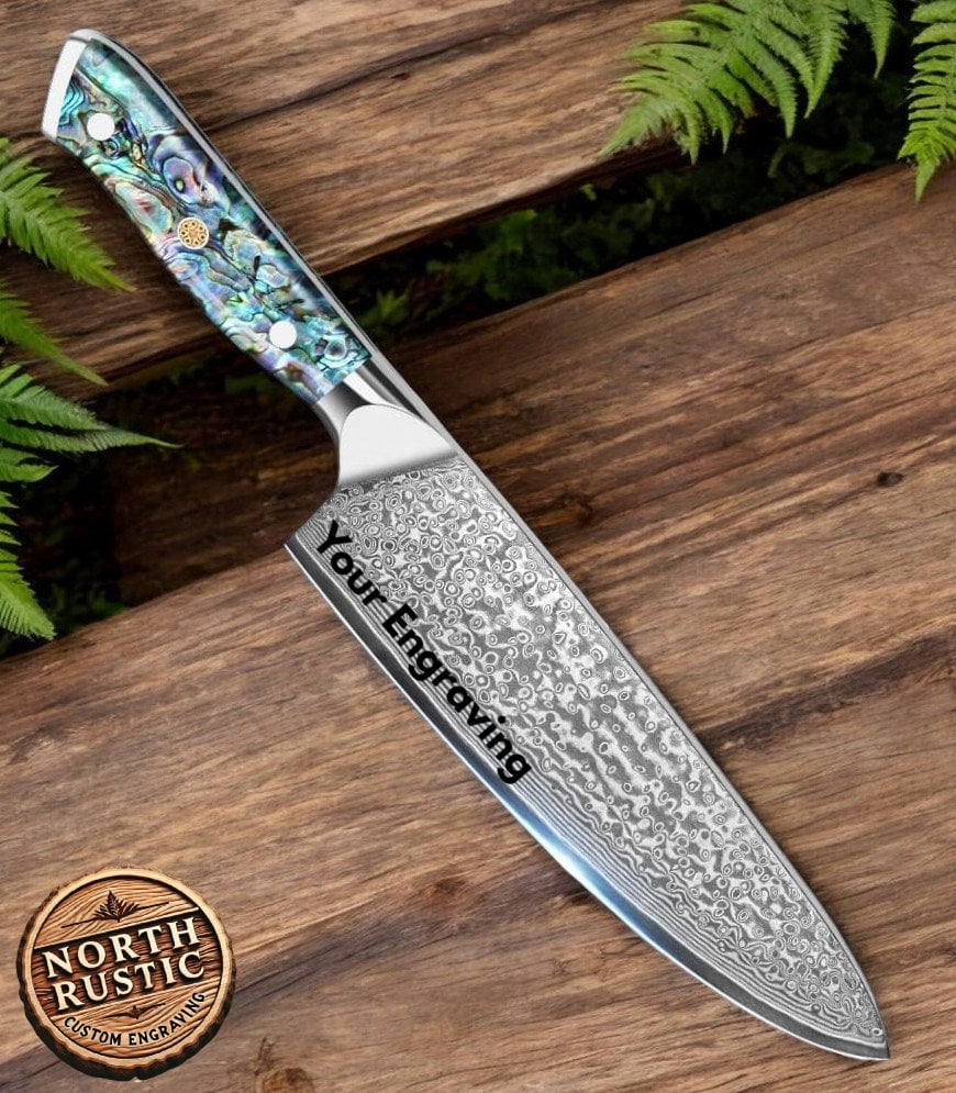Engraved 8" Damascus VG10 Chef Knife Kitchen Culinary Personalized Abalone Shells Knives Professional Premium Home Goods Gift Utility VC15