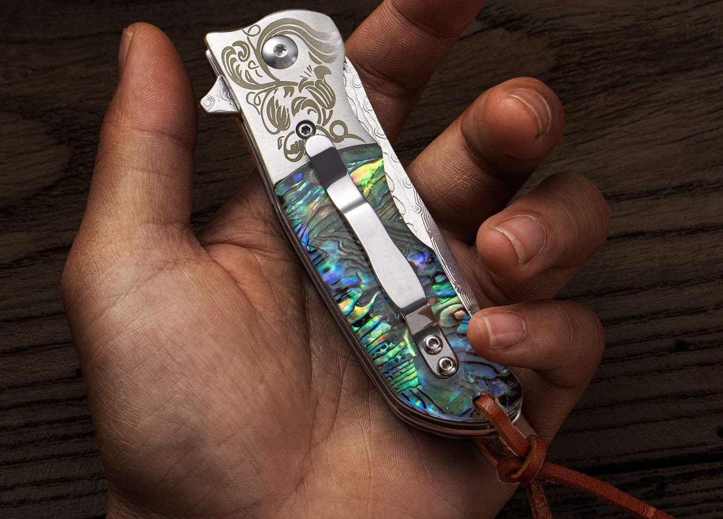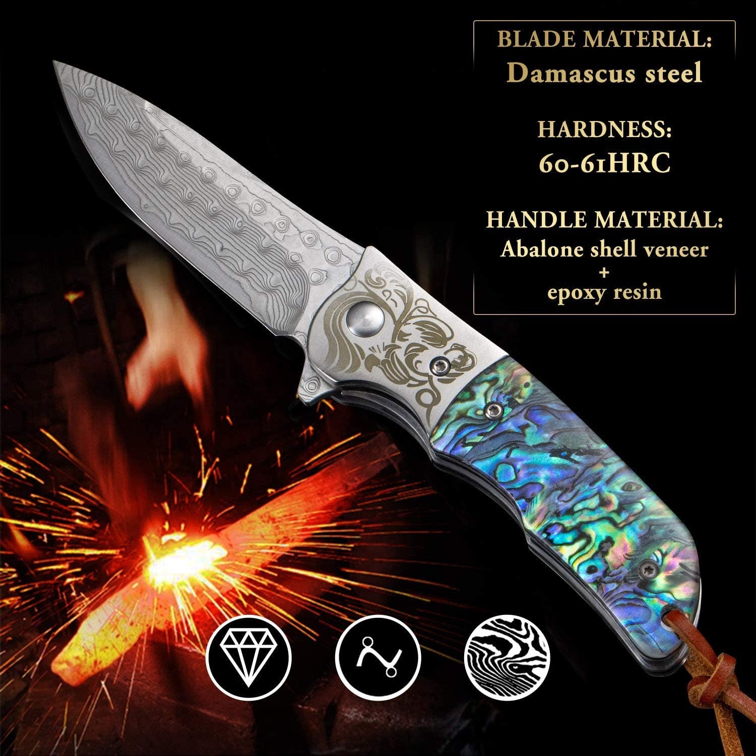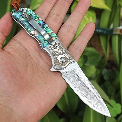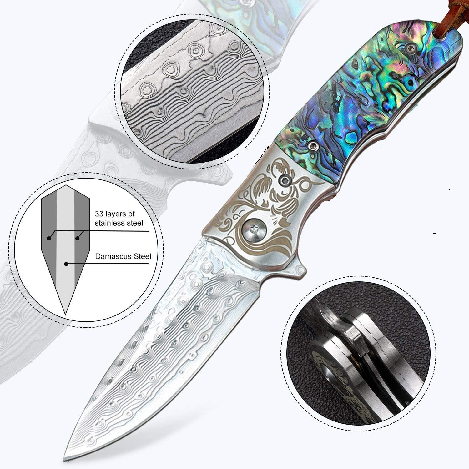 Engraved Damascus Pocket Knife - EDC Folding Knife with Exquisite Abalone Handle