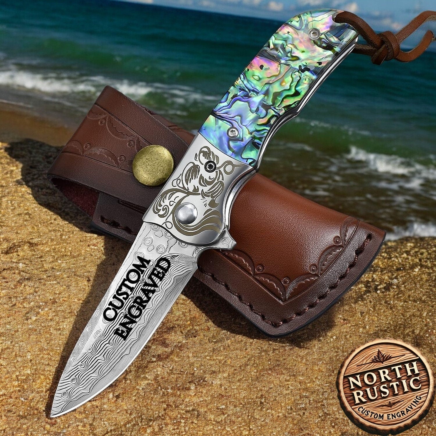 Engraved Abalone Pocket Knife Gift For Him, Anniversary Husband Folding Knife, Father Engraving Gifts, Personalized Wedding Groomsmen VP59