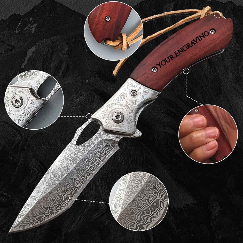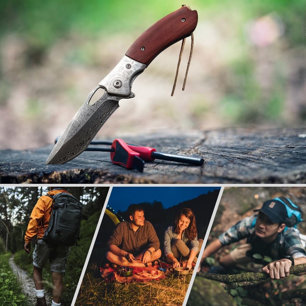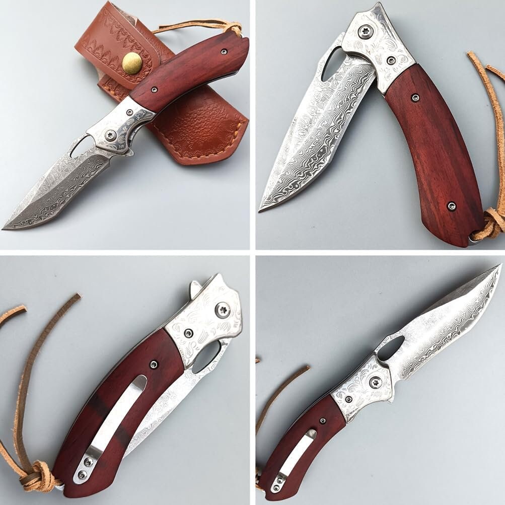 Damascus Folding Knife Rose Wood Handle Knife