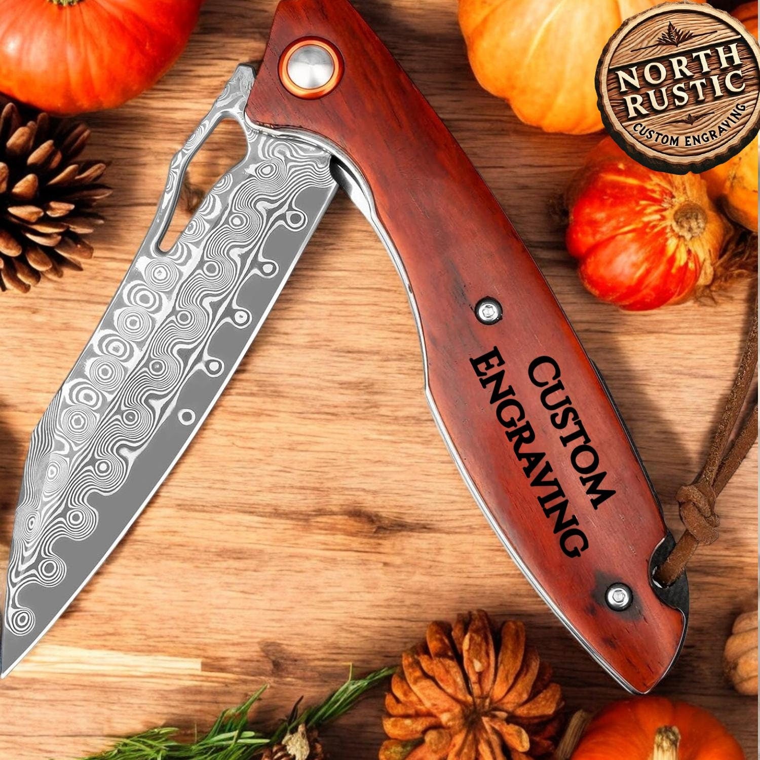 Engraved Damascus Folding Knife | Personalized Pocket Knife | Rose Wood Handle Knife | Wedding Husband Anniversary Father Gift