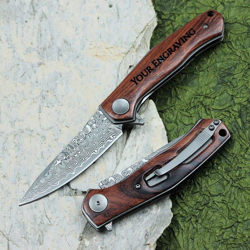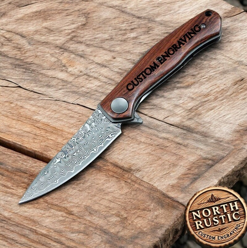 Engraved VG10 Damascus Folding Knife | Personalized Pocket Knife | Rose Wood Handle Knife | Wedding Husband Anniversary Father Gift