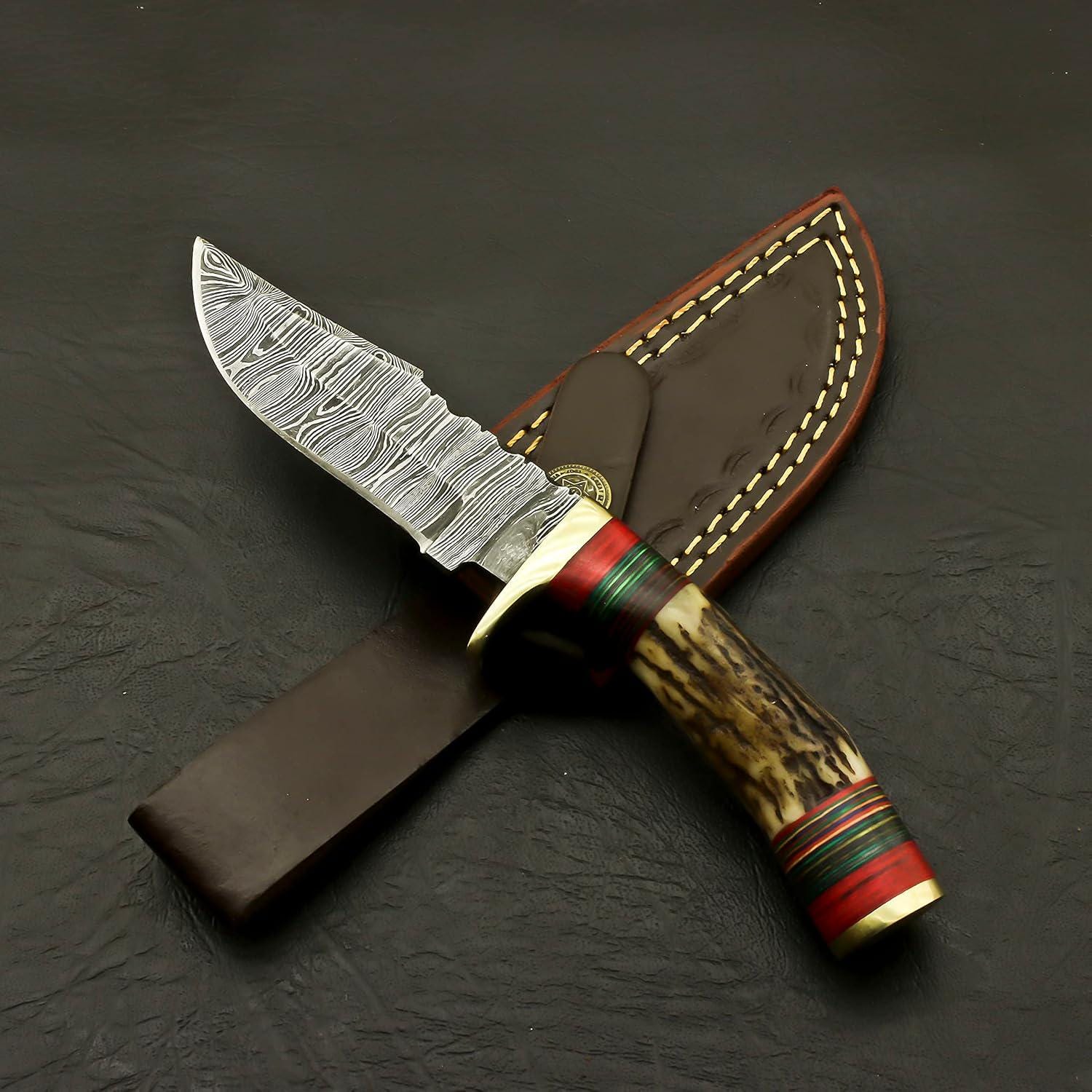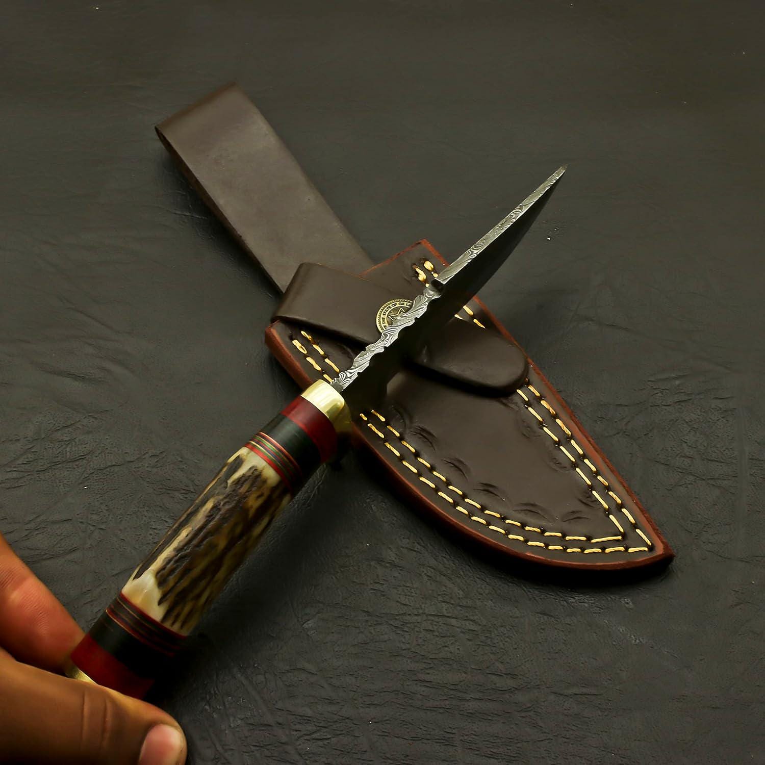 Engraved Damascus Hunting Knife – Custom Antler Stag Horn Personalized Knife – Groomsmen Gift, Fathers Day, Wedding Gifts, Collectible Knife