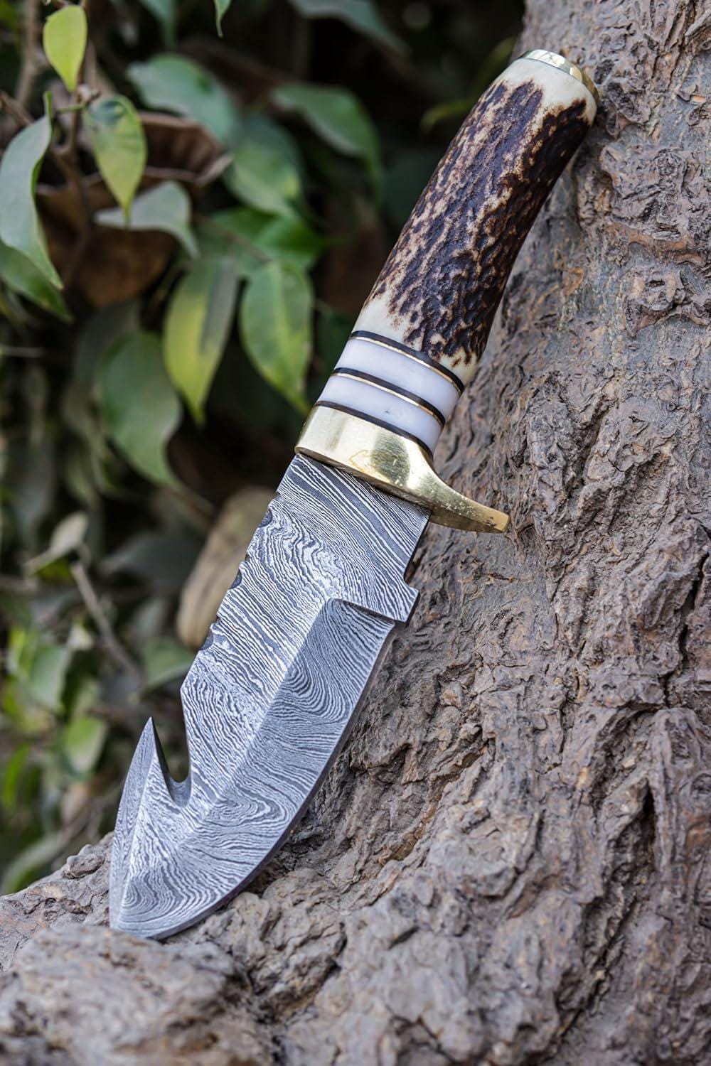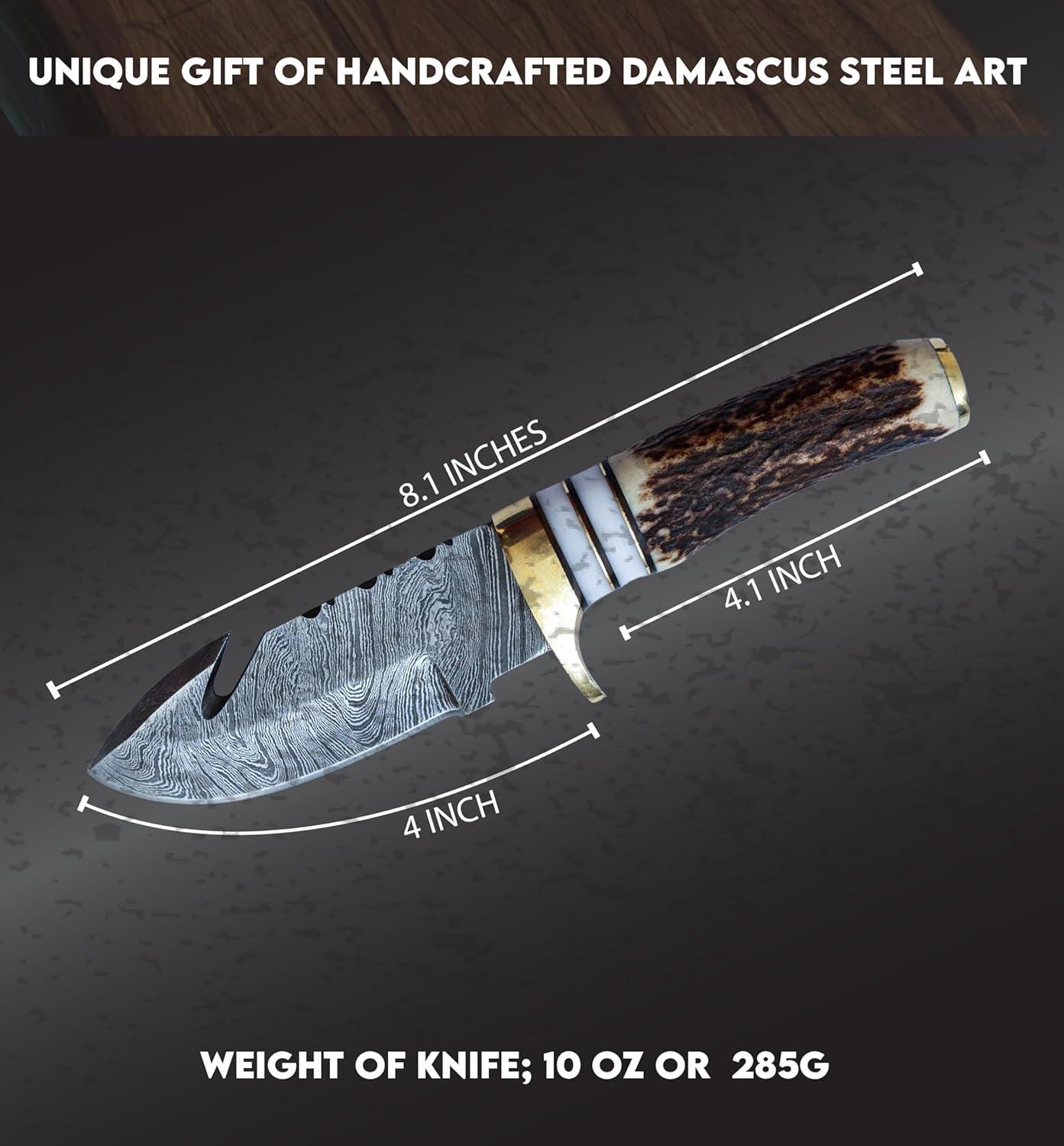 Engraved Damascus Hunting Knife, Personalized Hunting Knife, Deer Antler Stag Horn Handle, Custom Engraving Gift Father's Day Gift For Dad