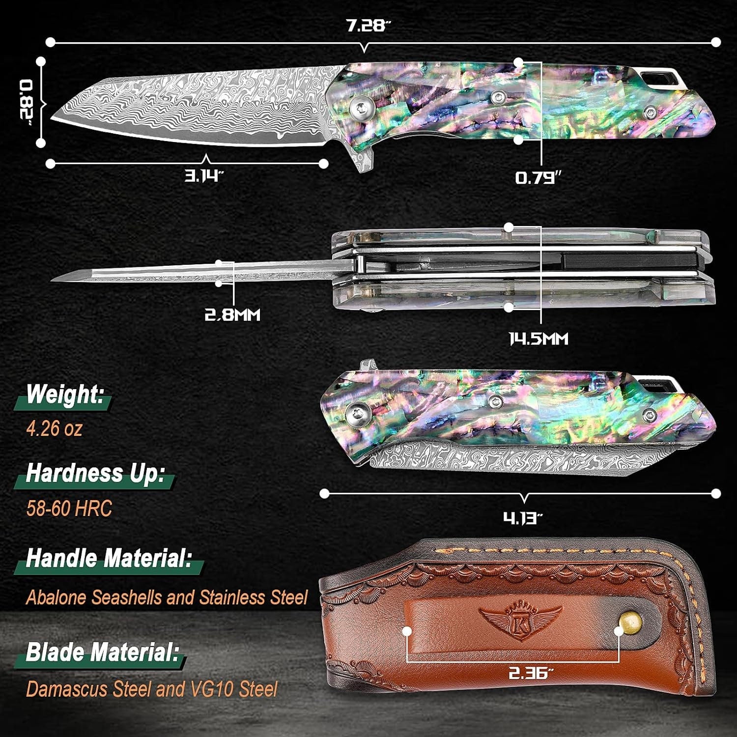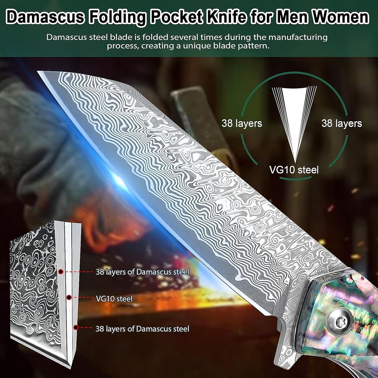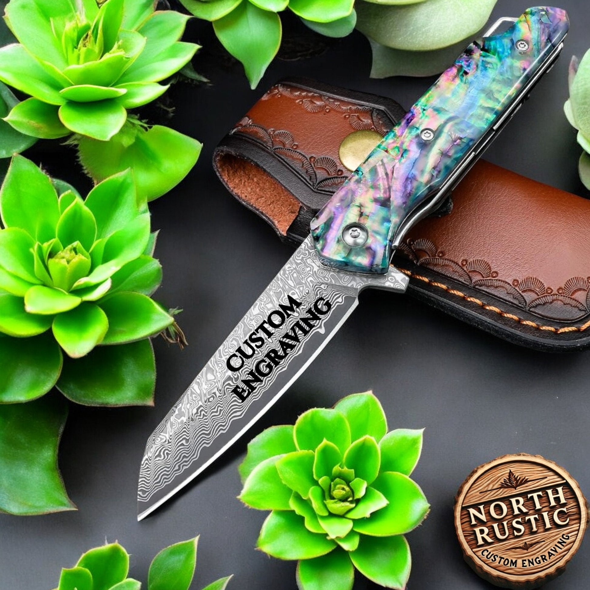Engraved Damascus Pocket Knife - EDC Folding Knife with Exquisite Abalone Handle - Unique Gift for Him - Husband Boyfriend Dad Gifts NR36