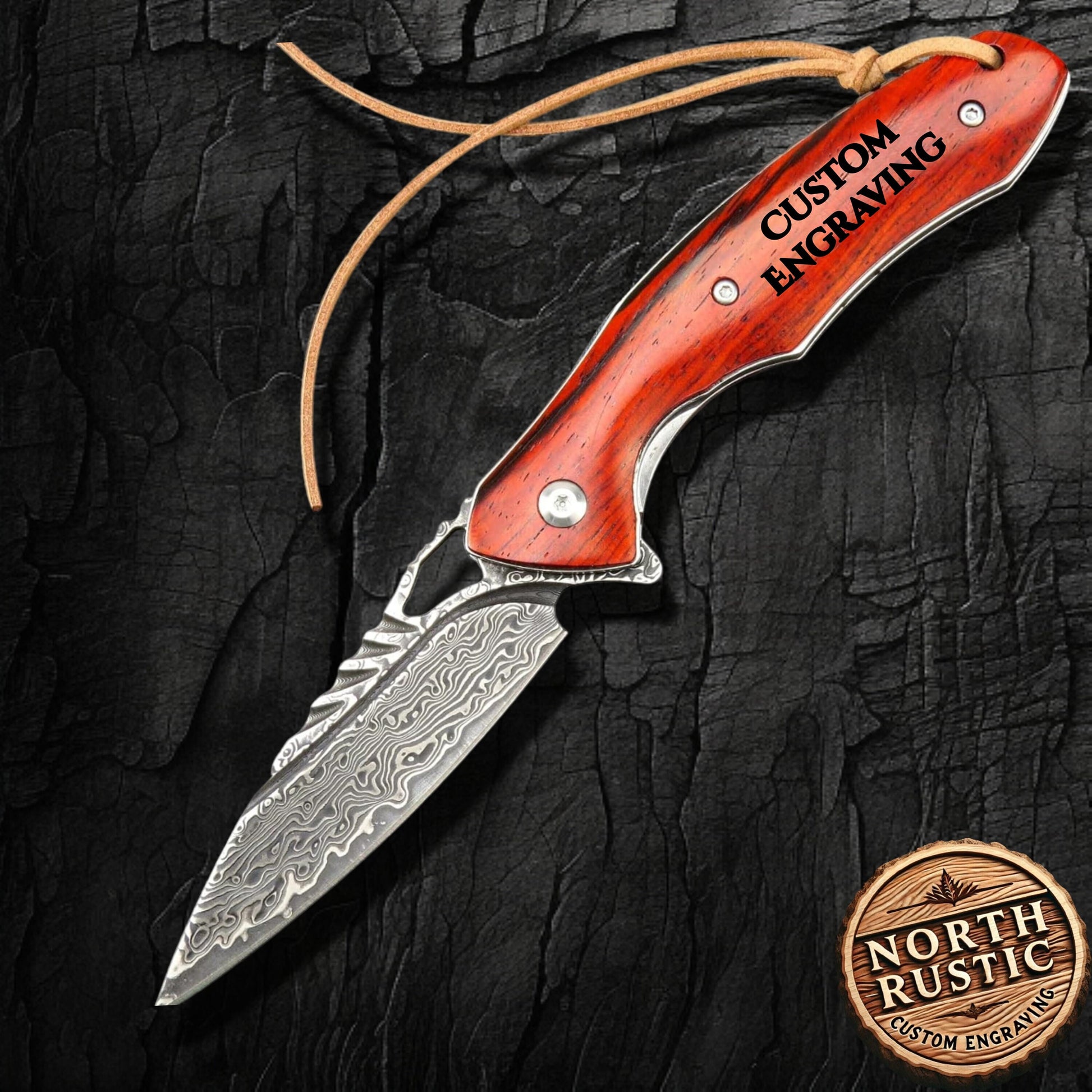 Engraved Damascus Pocket Knife Gift, Personalized Folding Knife, Rose Wood Handle Knife, Custom Father Husband Boyfriend Gift | VP61