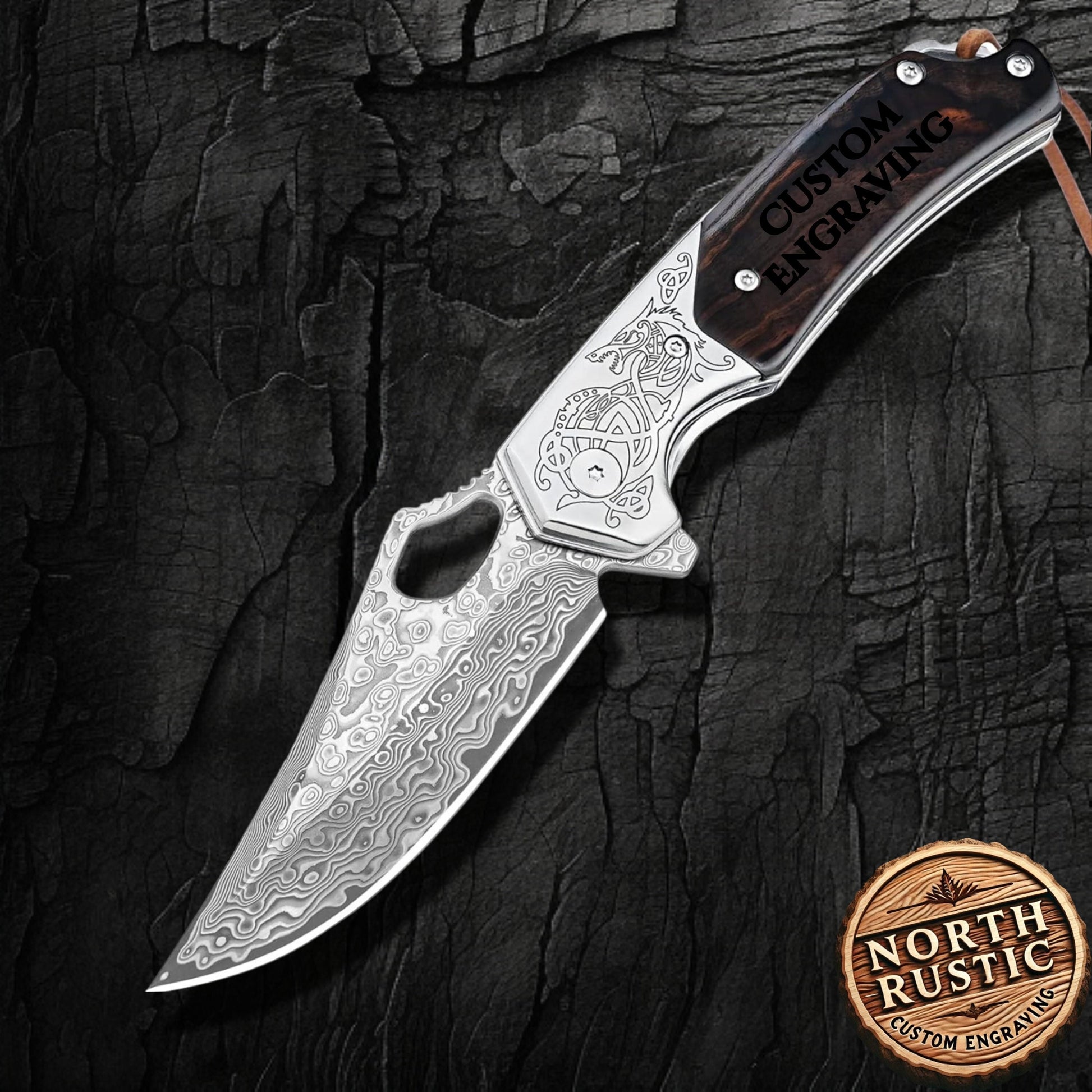 Engraved Damascus Pocket Knife, Personalized Folding Knife, Dark Sandalwood Handle Knife, Wedding Anniversary Husband Dad Gift | NR32