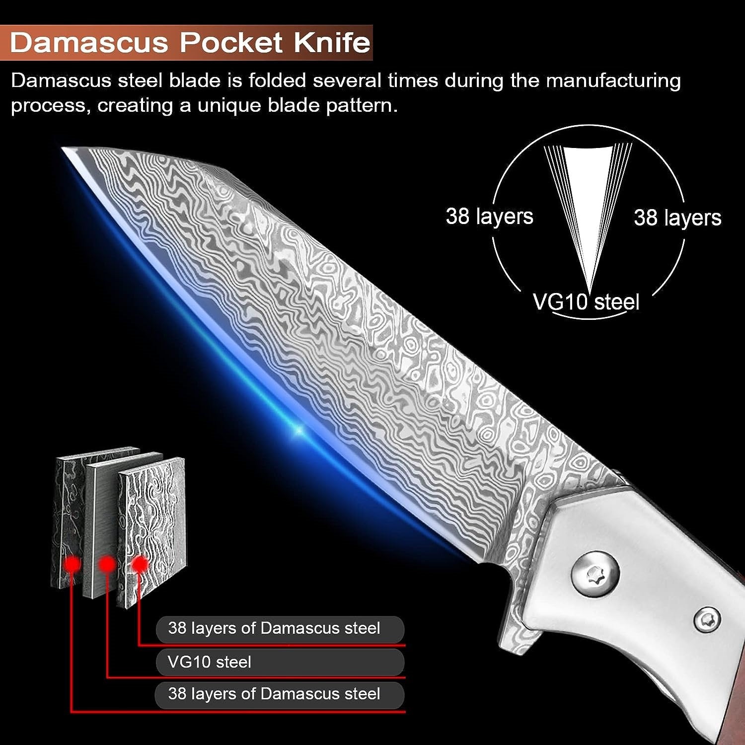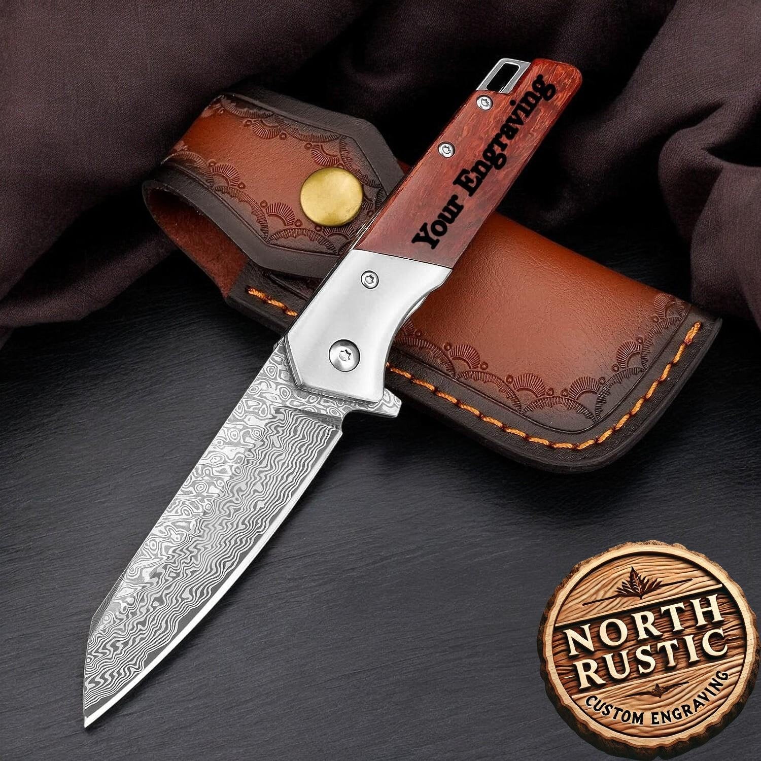 Engraved Damascus Pocket Knife, Personalized Folding Knife Gift For Him, Engraving Knives Wedding Groomsmen Gifts, Husband Anniversary Gift