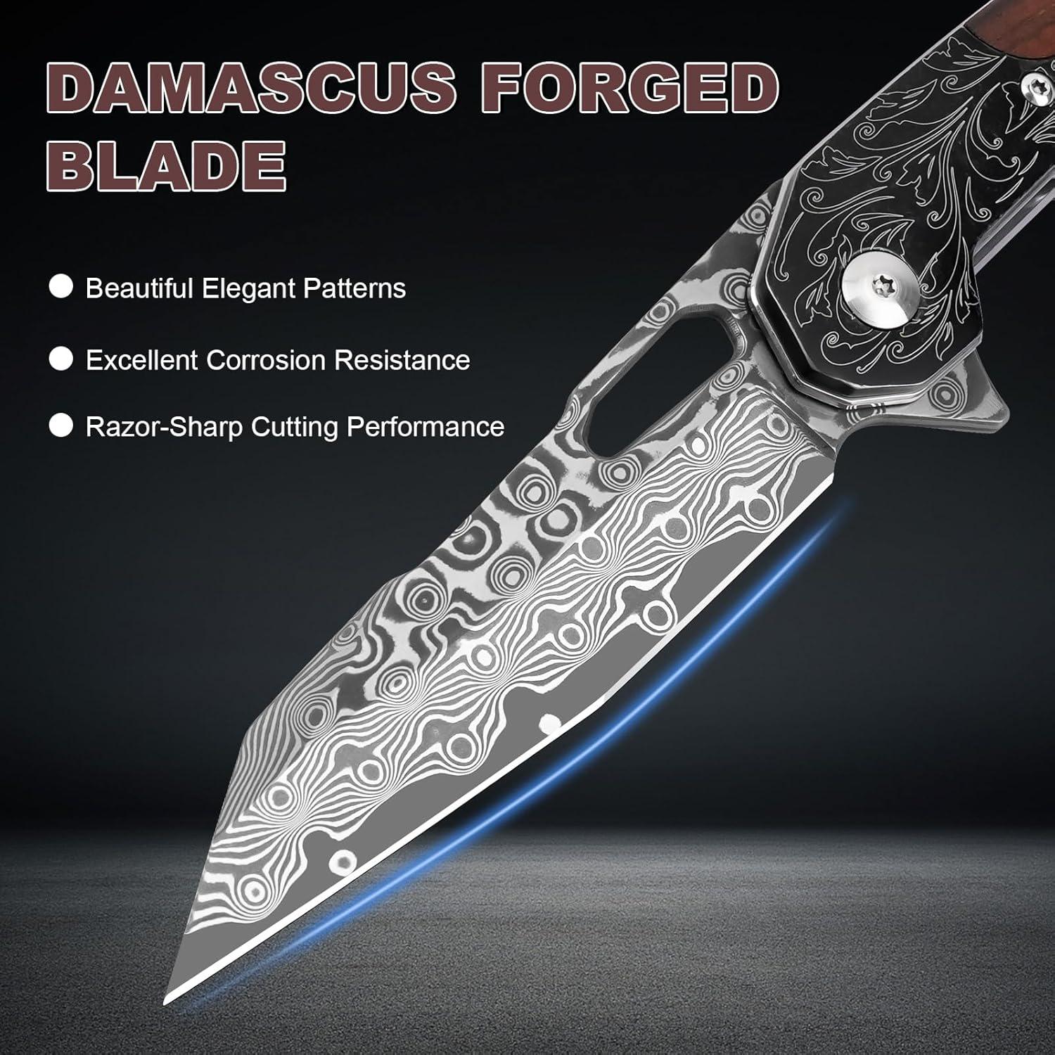 Engraved Damascus Pocket Knife, Personalized Folding Knife, Rose Wood Handle Engraving, Custom Knives For Wedding Groomsmen, Gift For Dad