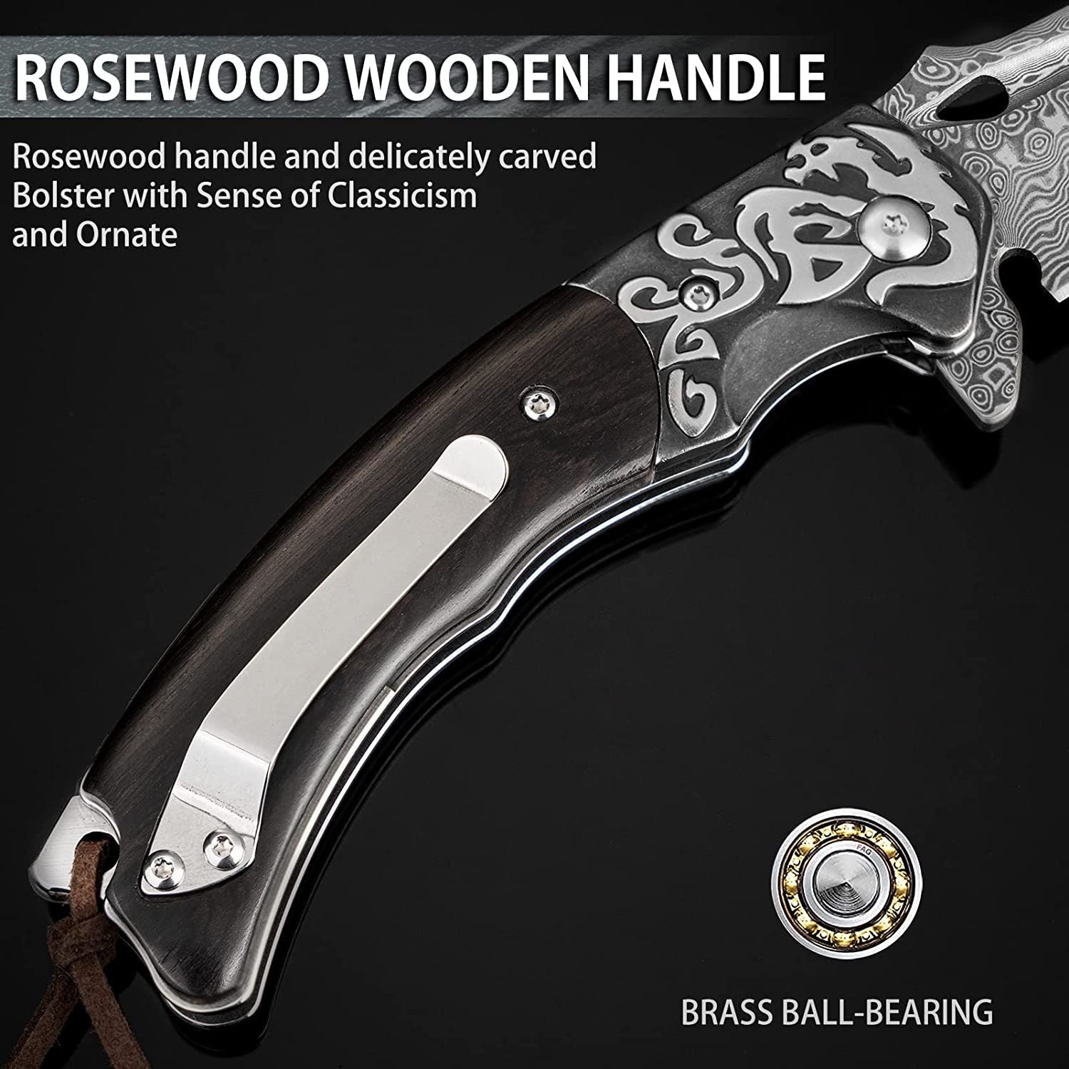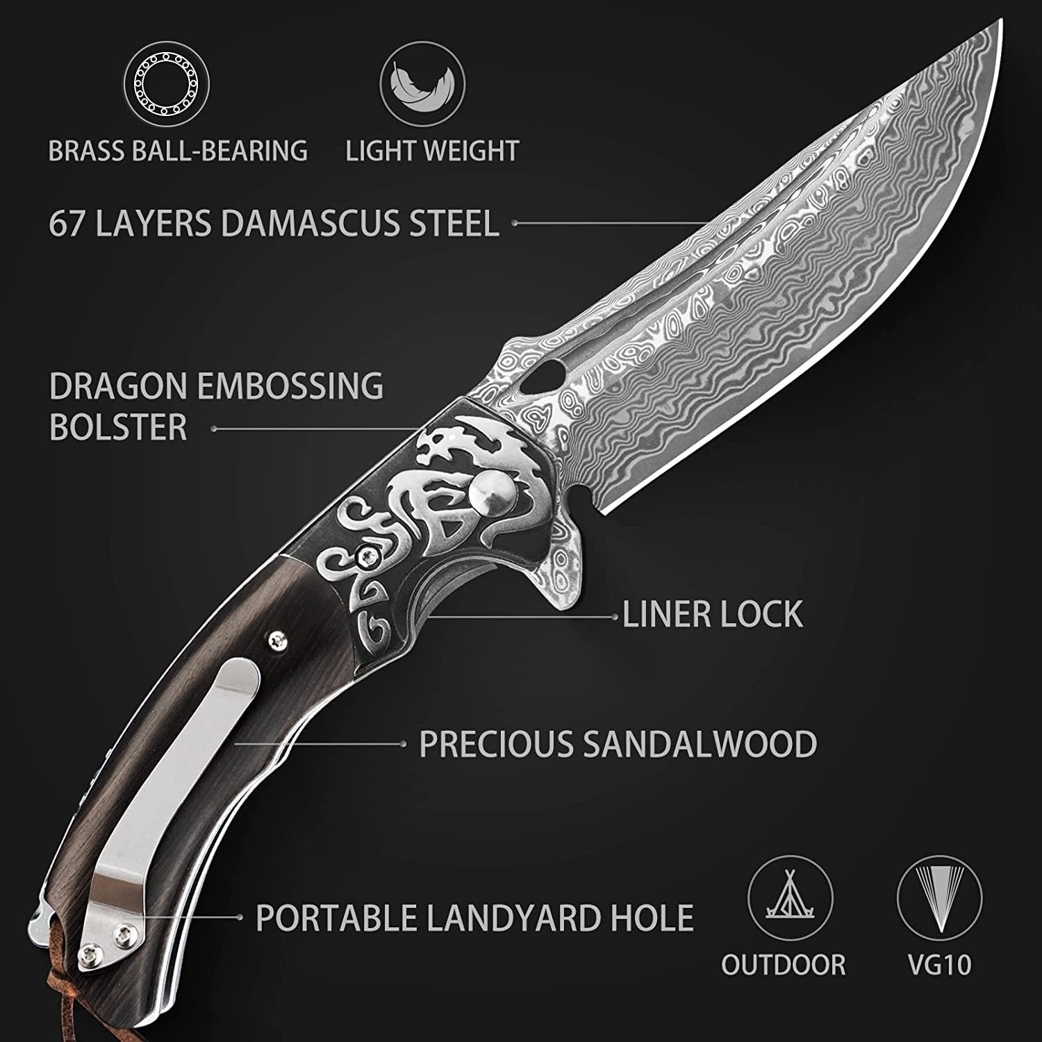 Engraved Damascus Pocket Knife, Personalized Sandal Wood Handle, Folding Knife Dragon Bolster, Wedding Anniversary Groomsmen Gift VP83