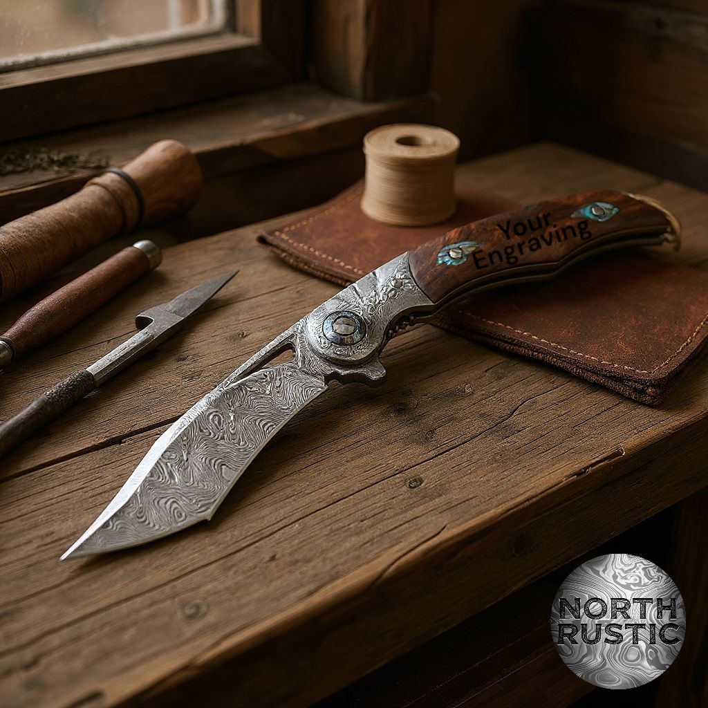 Engraved Damascus Pocket Knife | VG10 Personalized Folding Knife | Desert Ironwood With Abalone Inlays Handle