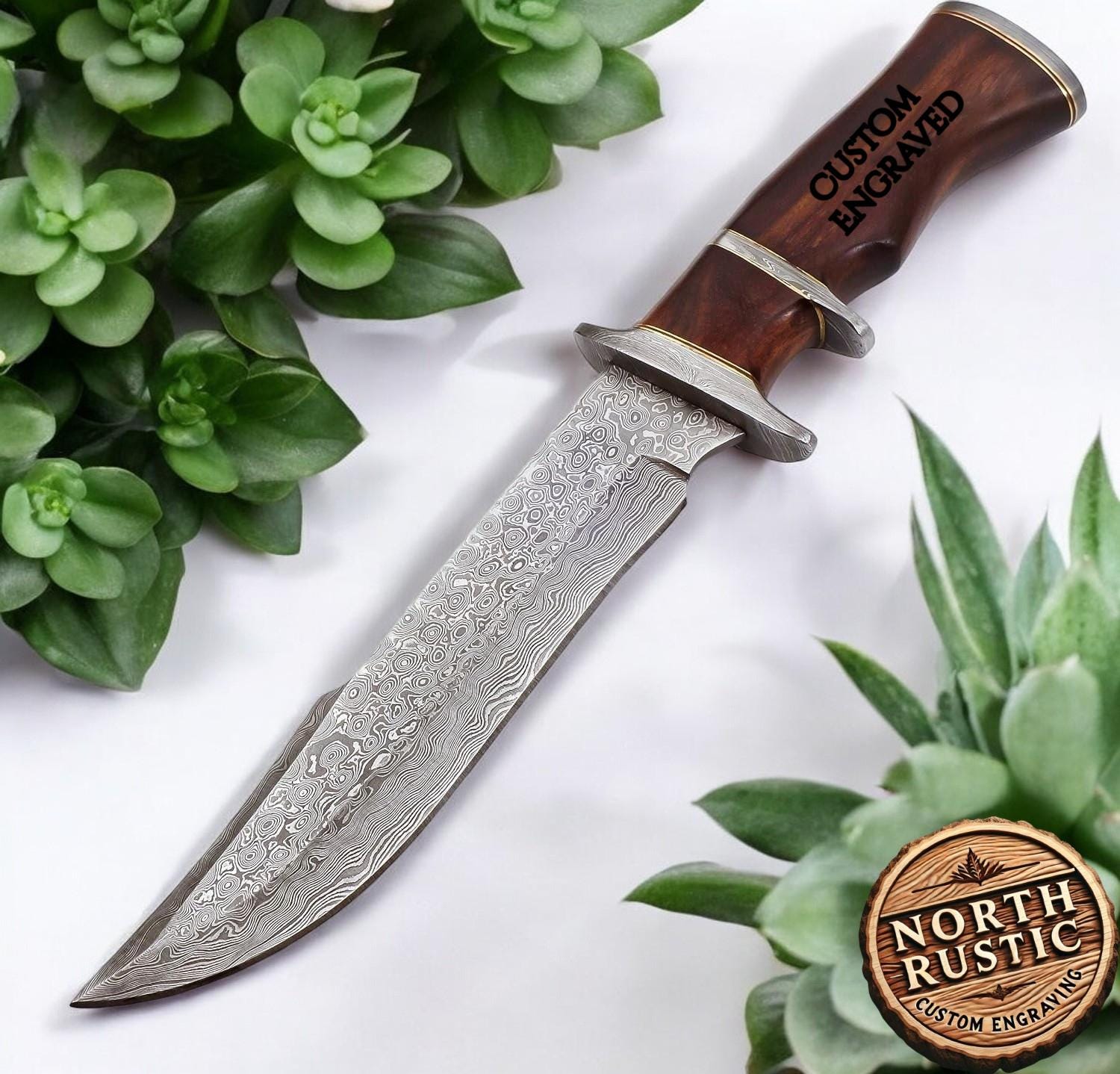 Engraved Fixed Blade Knife, Personalized Damascus Hunting Knife, Rose Wood Handle, Personal Engraving Gift Customized Father Gift For Dad