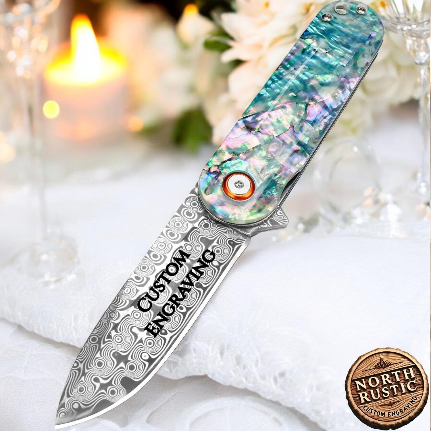 Engraved Mini Damascus Pocket Knife - Small Abalone Handle Folding Knife - Unique Gift Custom Engraving - Wedding Birthday Anniversary Gift