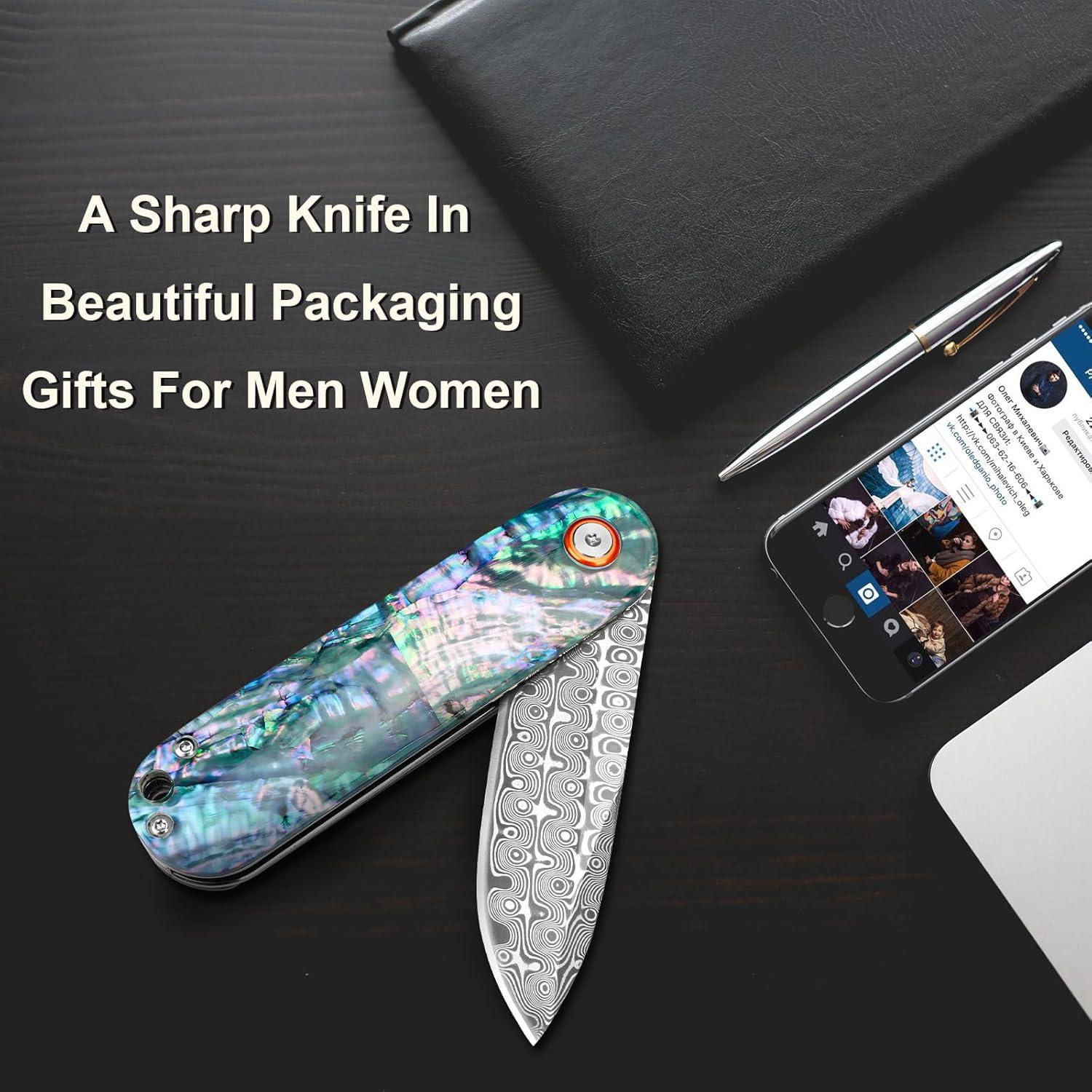 Mini Engraved Damascus Pocket Knife - Small Folding Knife with Exquisite Abalone Handle