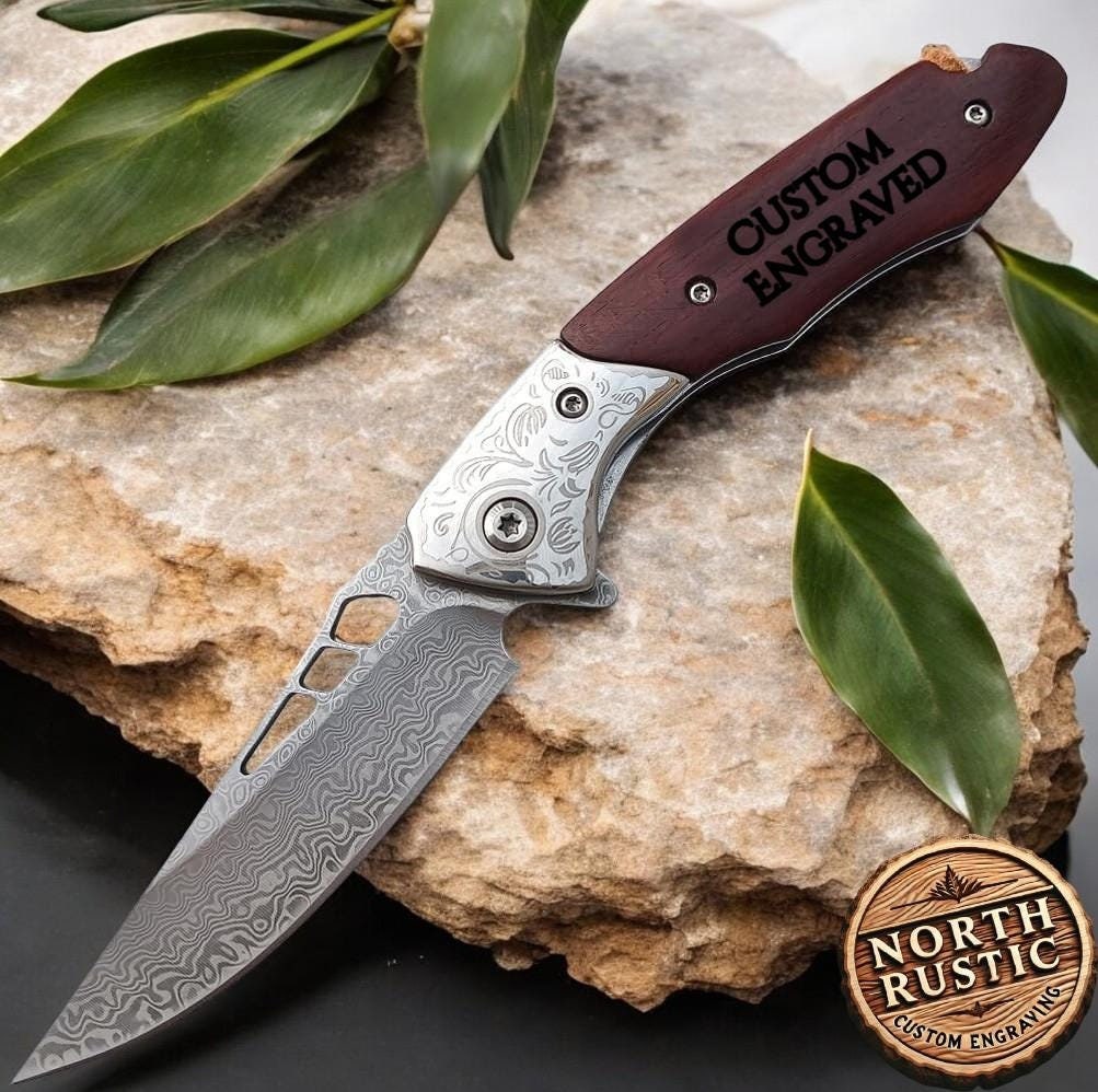 Engraved Rose Wood Pocket Knife - Personalized Folding Knife Gift Custom Engraving - Groomsmen Wedding Gifts - Husband Anniversary Gift