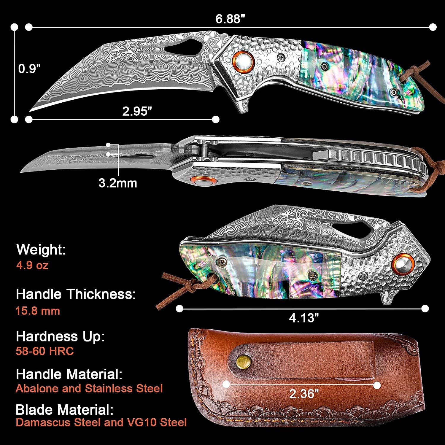 • Whether you're an avid outdoors enthusiast, a knife collector, or someone who appreciates the finer things in life, this Abalone Handle Damascus Pocket Knife is a must-have addition to your collection. It's not just a tool; it's a statement of style and quality. Elevate your everyday carry with this stunning piece today!