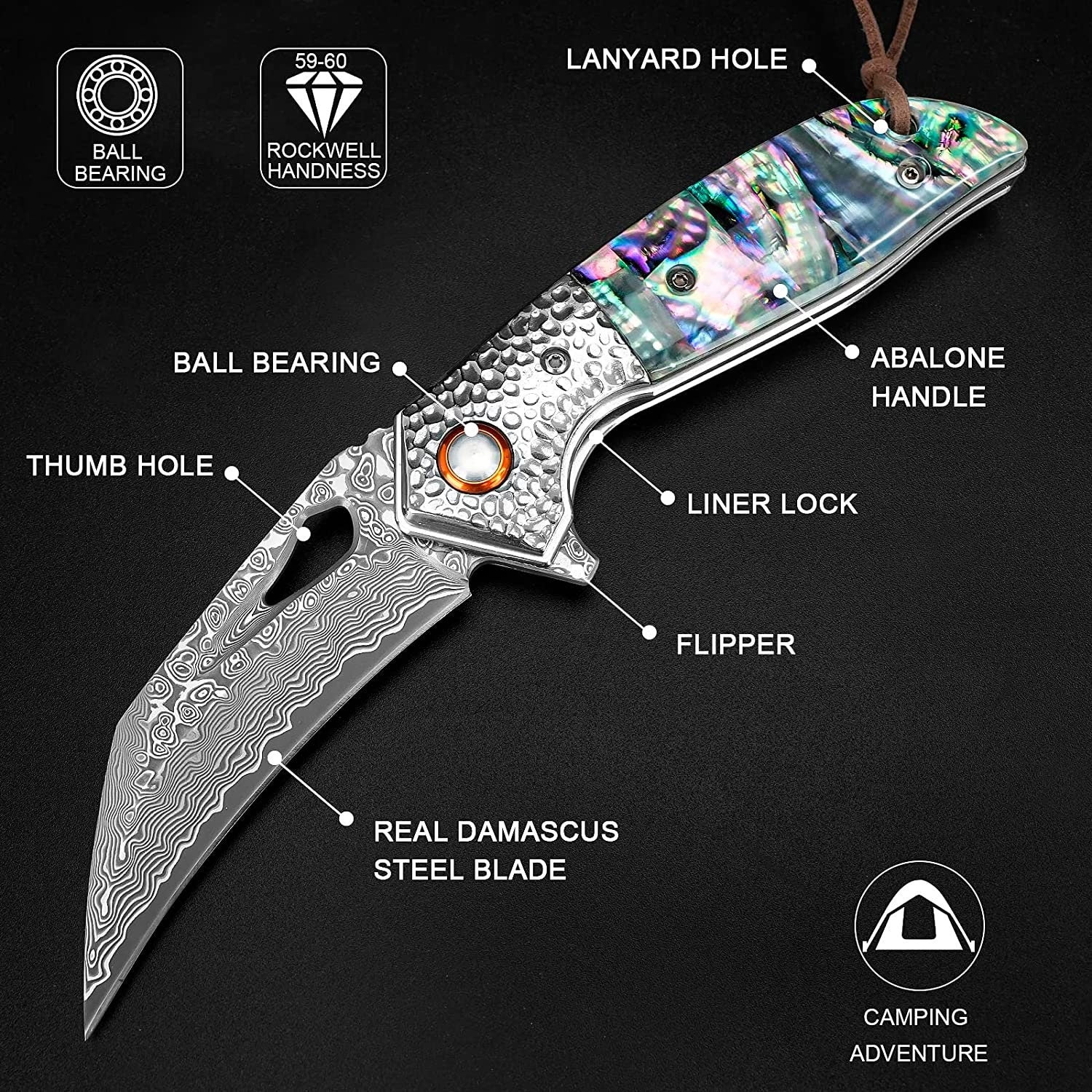 Engraved Damascus Pocket Knife - EDC Folding Knife with Exquisite Abalone Handle
