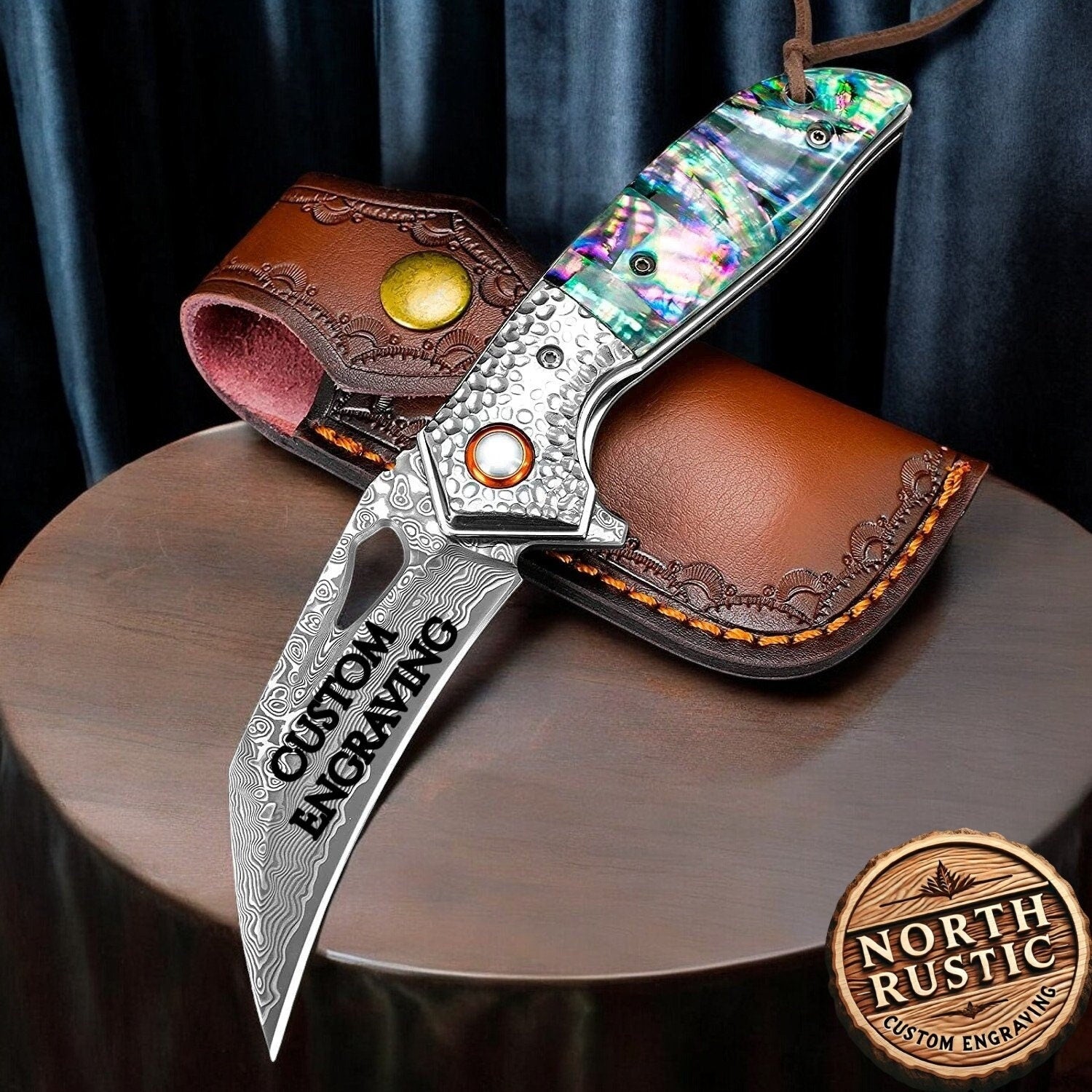 Engraved VG10 Damascus Folding Knife, Personalized Pocket Knife, Abalone Shell Handle Knife, Wedding Anniversary Father Husband Gift | VP108