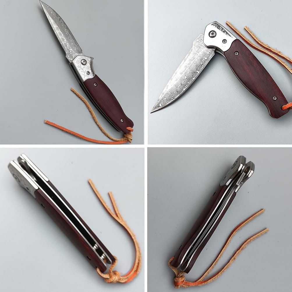• Rosewood Handle: The handle of this pocket knife is adorned with beautiful Rosewood, known for its light weight and durable feel. Each handle is unique, displaying a mesmerizing play of colors and patterns, making it a true collector's item.